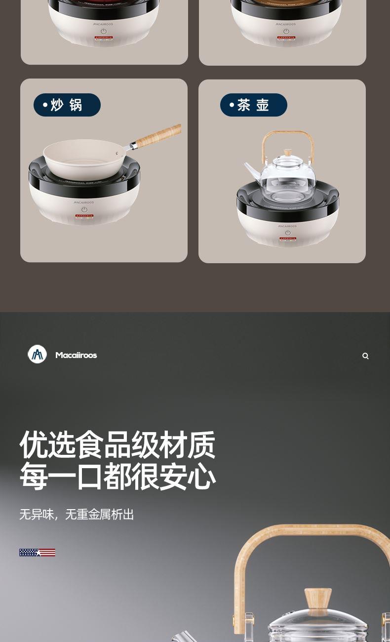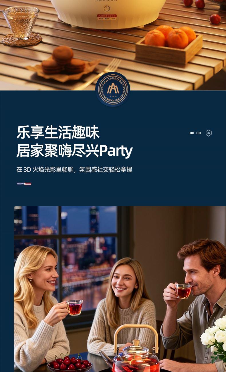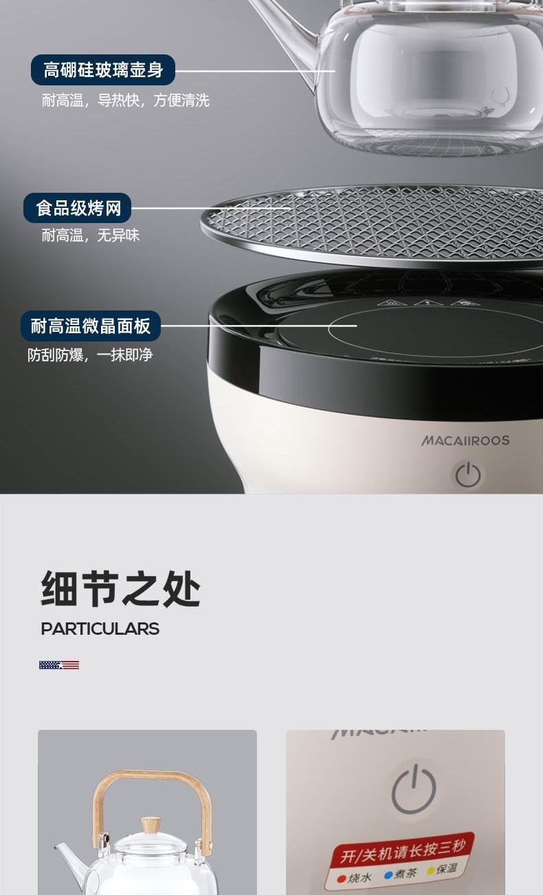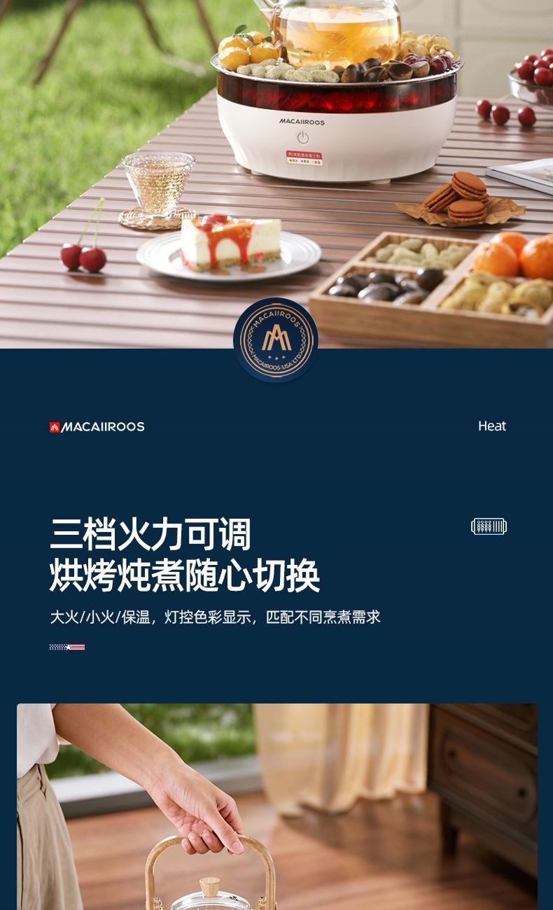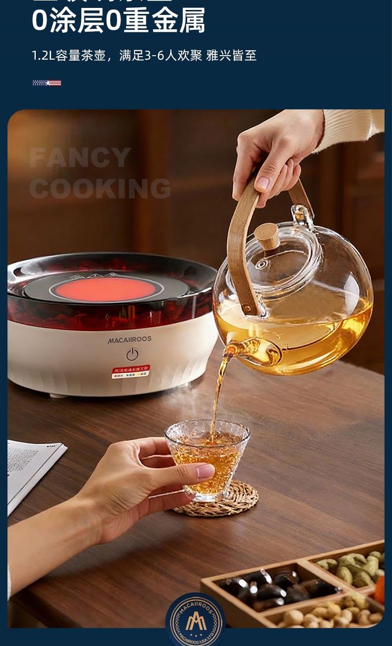 额定功率:1000W 额定容量:1.2L 额定电压:220V~ 额定频率:50Hz 产品净重:1.67kg 产品毛重:1.95kg 整箱重量:2.5kg 一机多用集围炉、电陶炉于一体,可烧烤坚果,也可单独使用; 红外发热&3D火焰远红外发热,不挑锅具;3D仿真火焰效果,无烟无炭0排放; 微晶面板耐高温防爆裂微晶面板,加密食品级烤网; 产品配置配烤网、茶壶,触摸操控,闲时三五友人煮茶、烧烤。