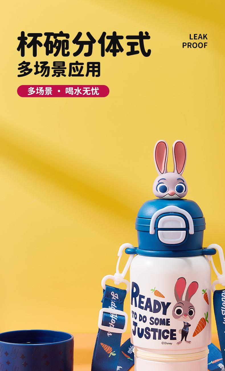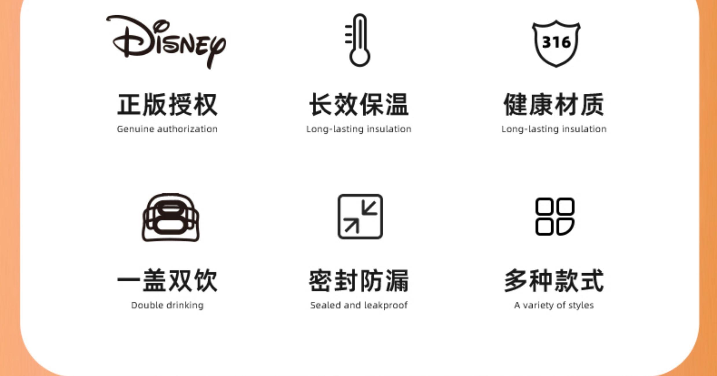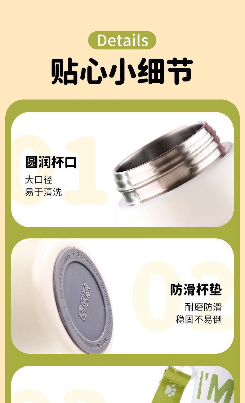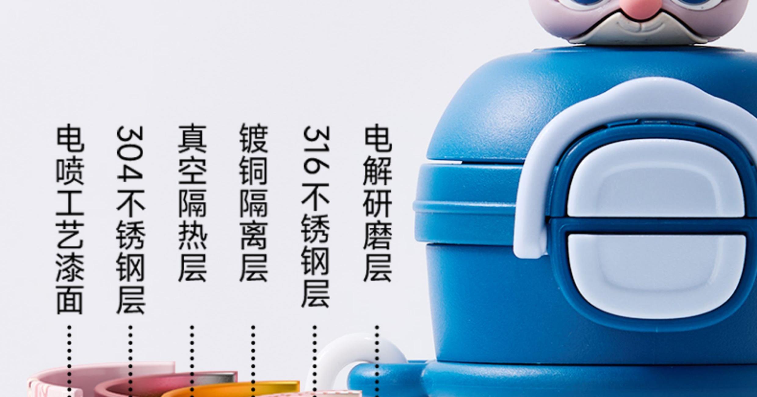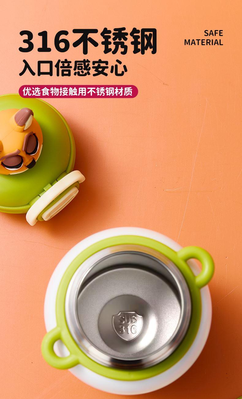 容量:550ml 尺寸:8.4*8.4*25CM 材质:PP、硅橡胶、内底:316材质 内胆:304材质 外壳:304材质 卖点: ①一盖双饮,吸管&直饮不设限 ②密封锁扣,防止误触 ③6层锁温,12小时长效护航 ④316不锈钢入口倍感安心,优选食物接触用不锈钢材质 ⑤杯碗分体式,多场景应用 ⑥圆润杯口、立体公仔、防滑杯垫、便携背带