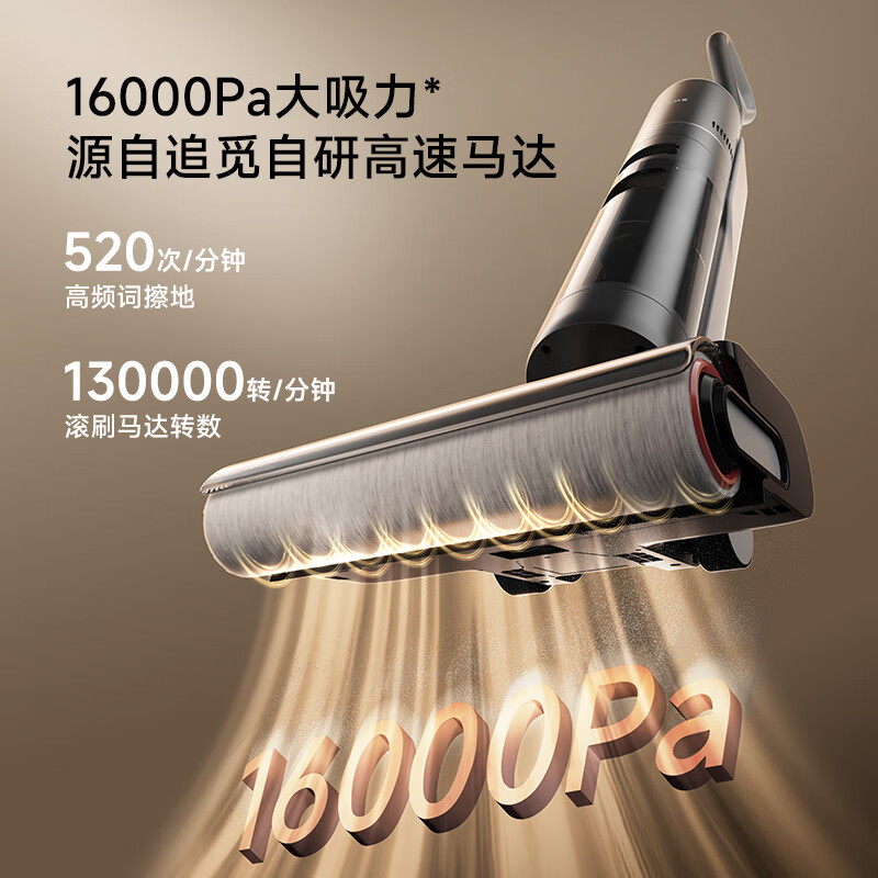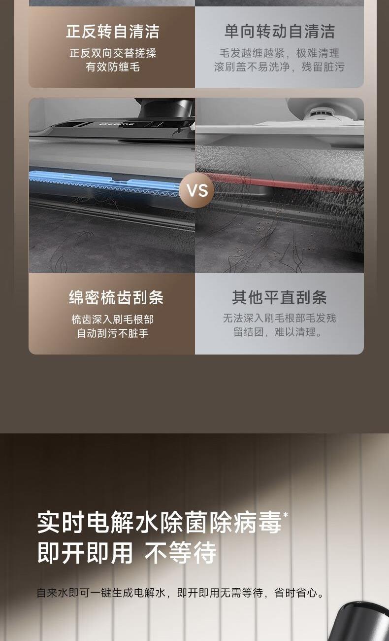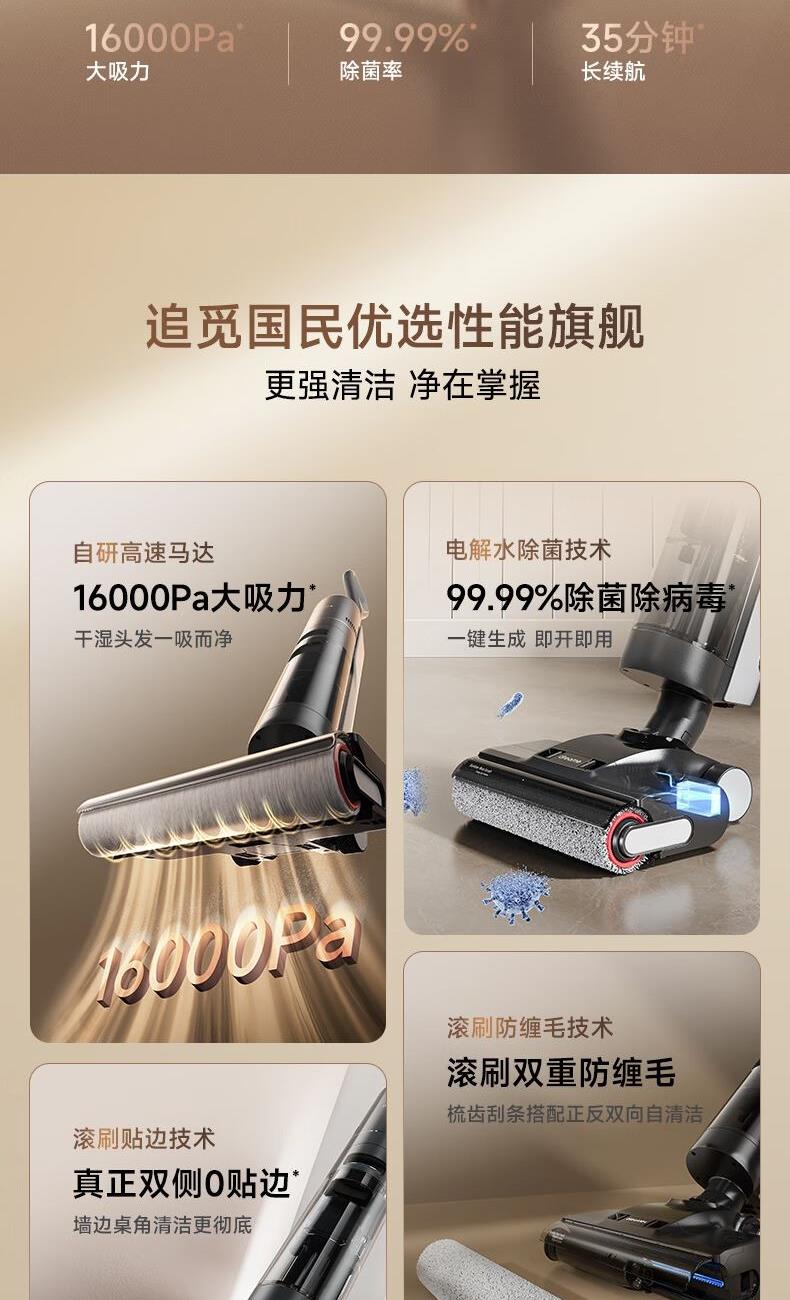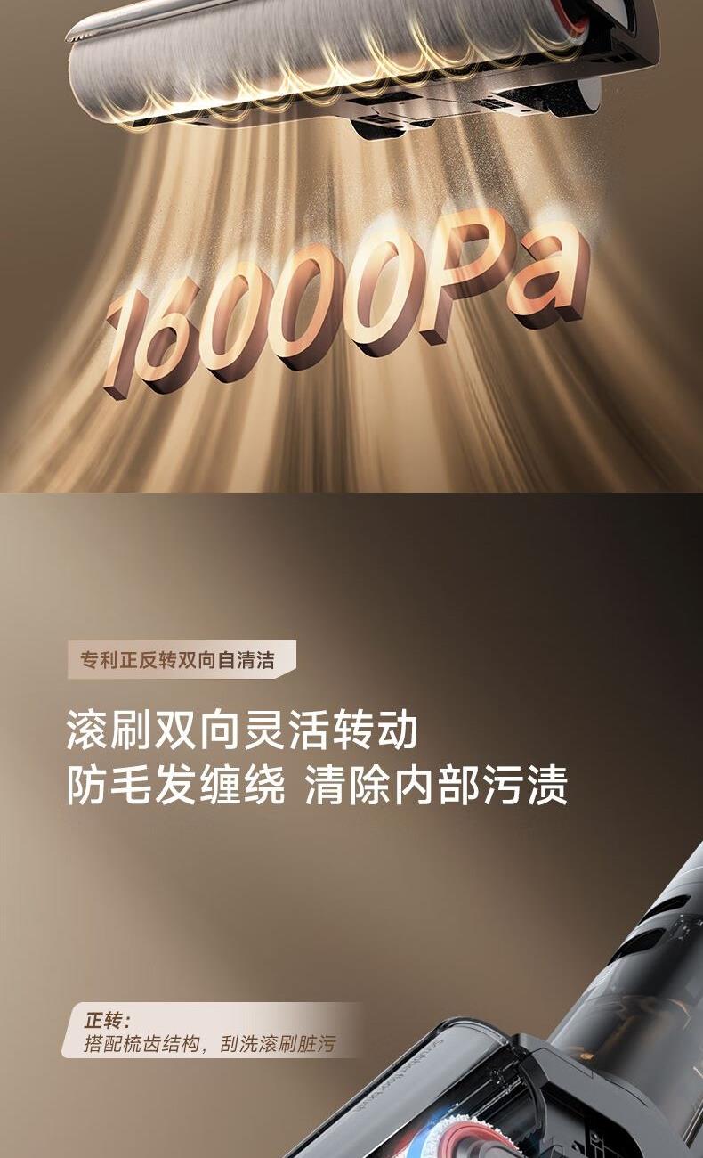 双重防缠毛,双侧0贴边, 澎湃大吸力,除病毒 16000Pa大吸力,35分长续航 滚刷双向灵活转动