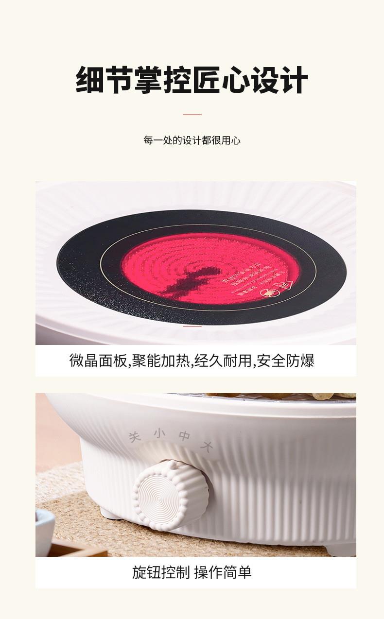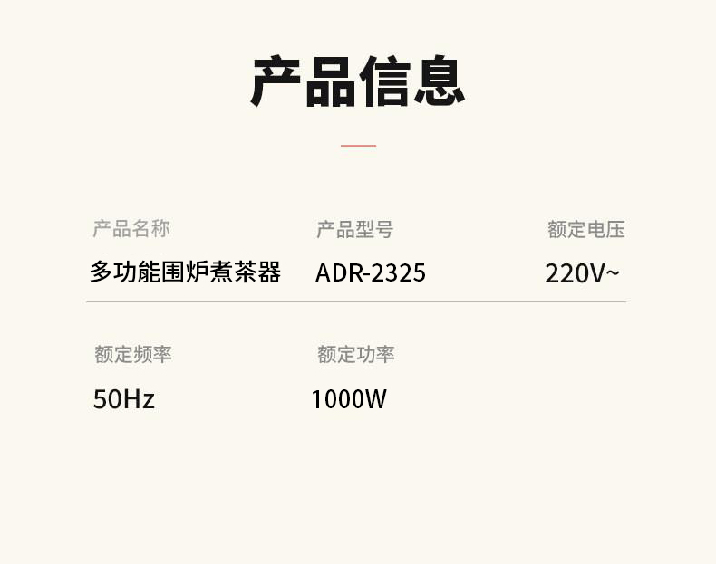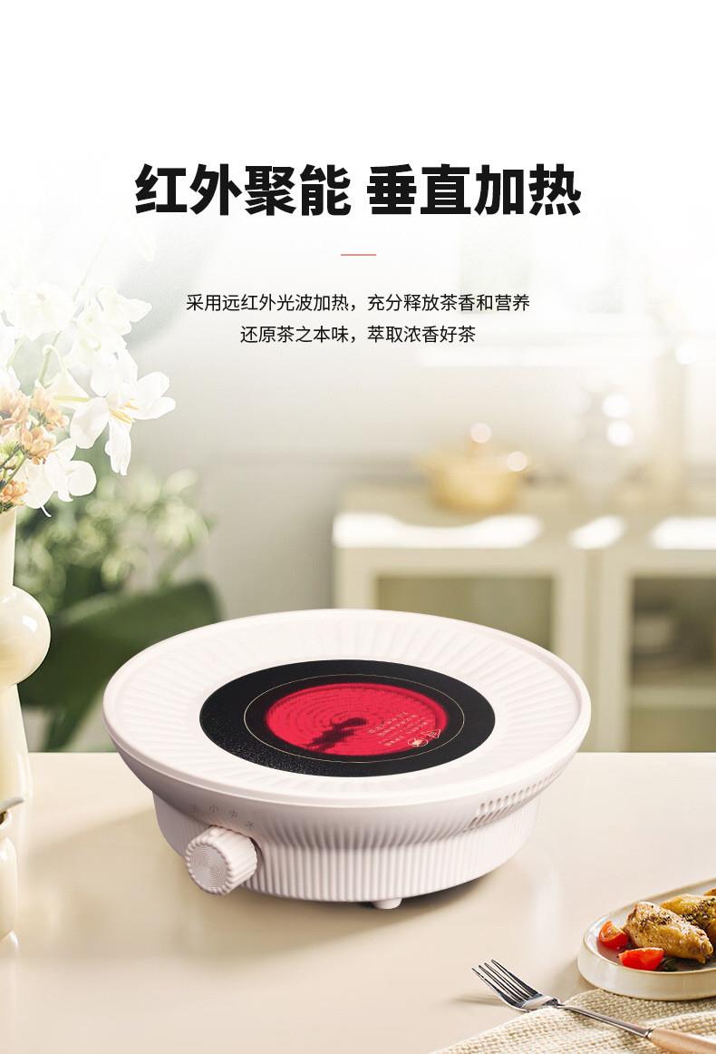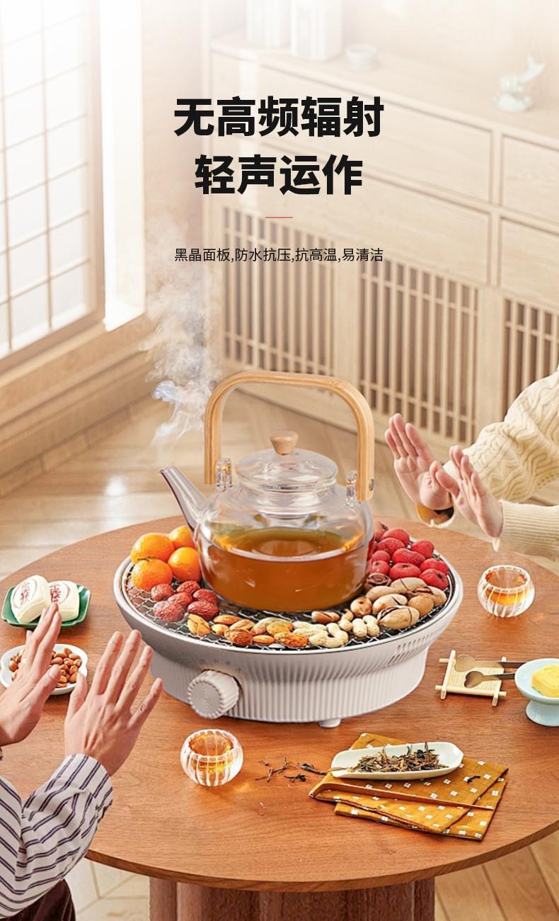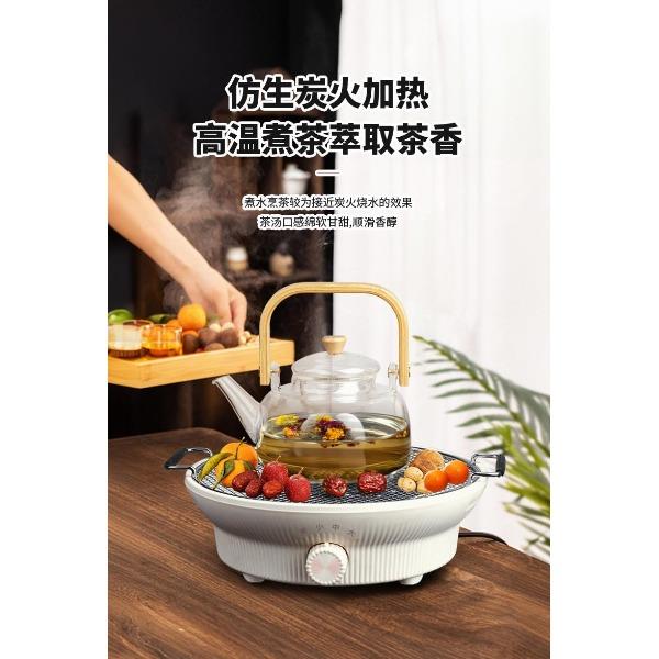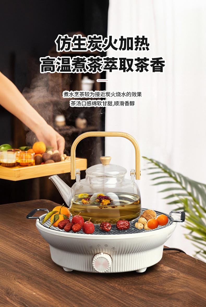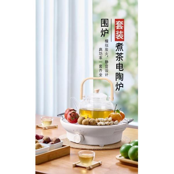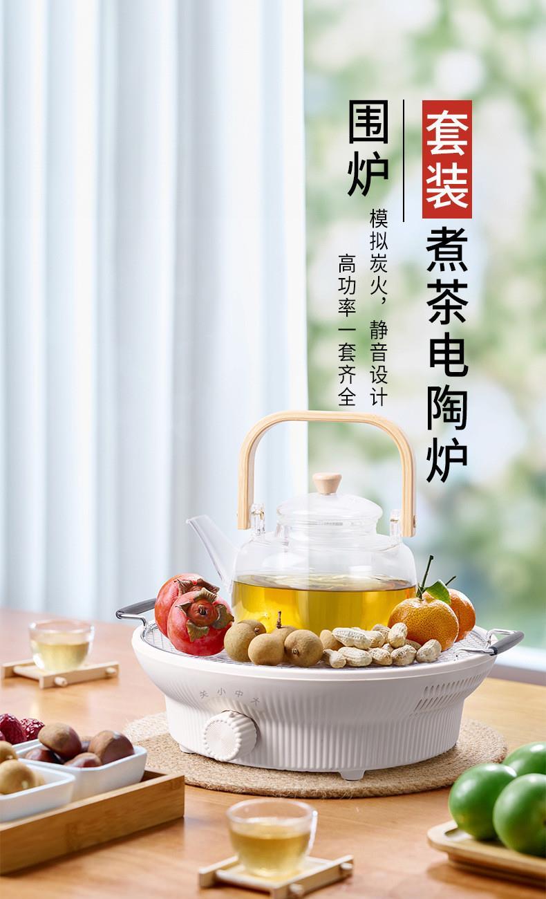 额定电压:220V~ 额定频率:50Hz 额定功率:1000W 颜色:象牙白 产品容量:1180ML 套装组合:电陶炉+烤网+提梁壶+茗品杯4只+公道杯 室内/室外,一炉多用,多挡控温; 采用远红外光波加热,受热均匀; 无烟无明火,居家使用更安全; 黑晶面板,防水抗压,抗高温,易清洁; 仿生炭火加热,高温煮茶萃取茶香; 工作20分钟自动断电保护,安全可靠;