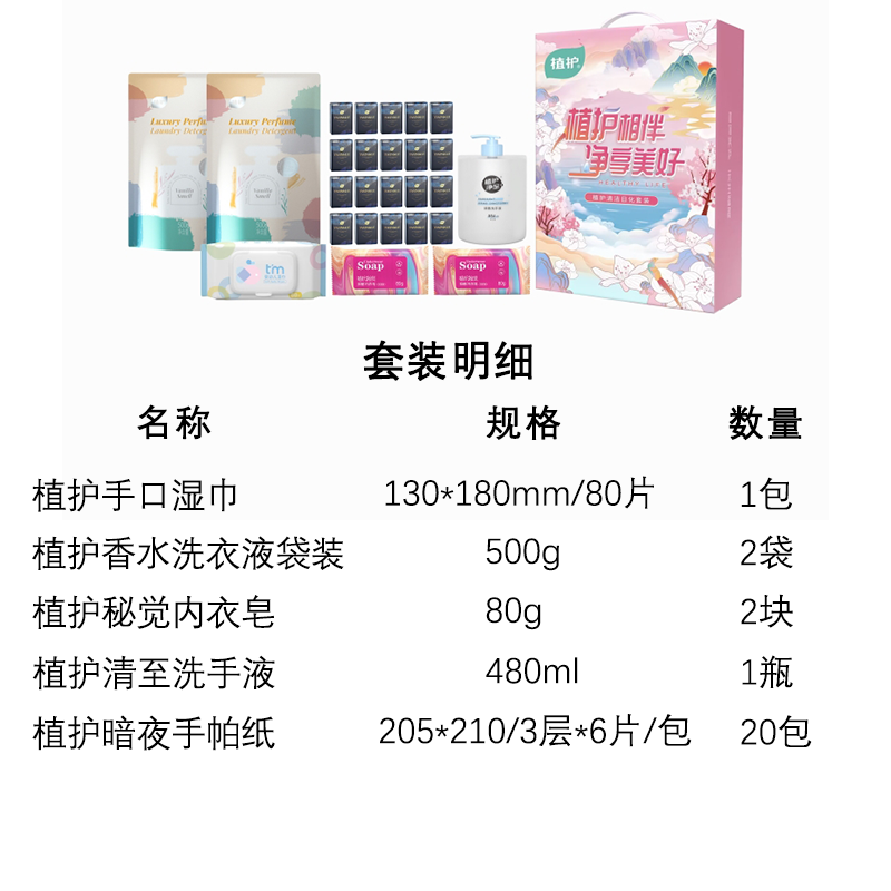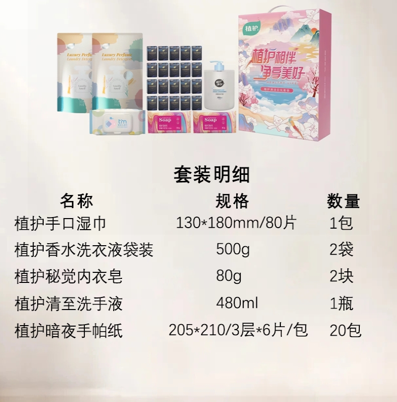 销售规格:植护香水洗衣皂液 500g*2袋+植护暗夜手帕纸6片*20包+植护手口湿巾80抽*1包+植护内衣皂80g*2块+植护清至洗手液480ml*1瓶 产品毛重:1.9kg 保质期:3年 1、30袋独立包装,小巧携带方便,浓缩不浓稠,浓缩型活物>25%; 2、浓缩配方,一袋可低常规洗衣液两袋,洁净更耐用; 3、权威检测,去污能力更强,清洗更洁净; 4、植物纤维,天然更亲肤;国际认证,使用更安心; 5、高压水射流柔织工艺,耐拉扯,不易掉絮; 6、双面纹理,双重呵护; 7、四重精粹,面护级高能润养 8、深层补水保湿,密集水润,改善手部粗糙