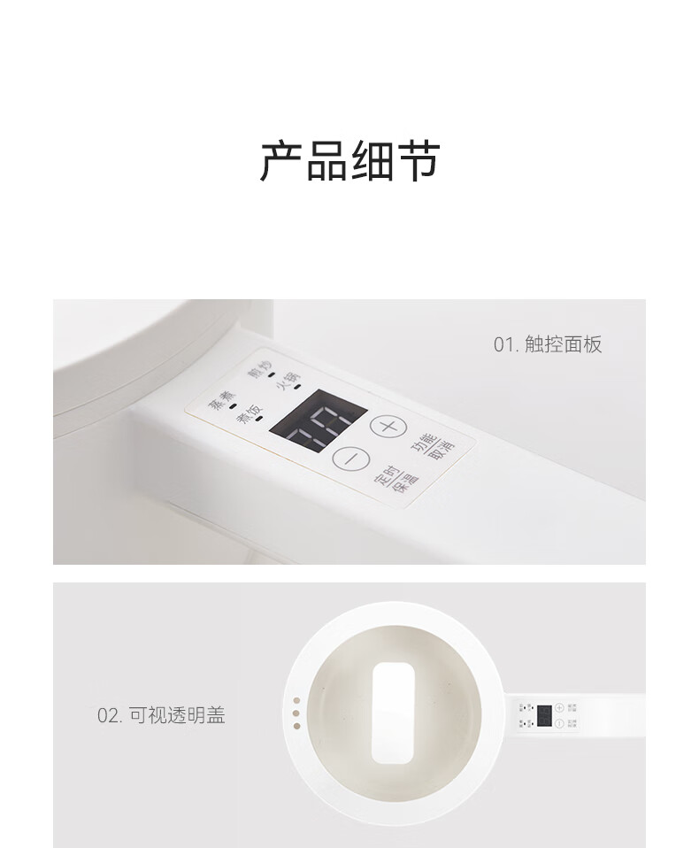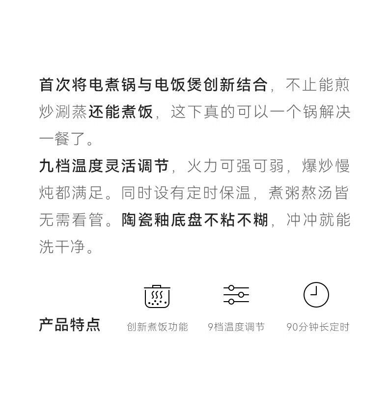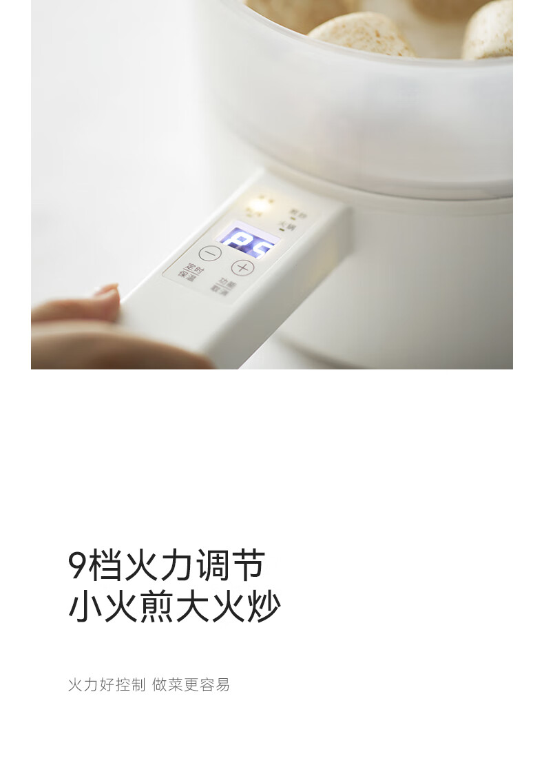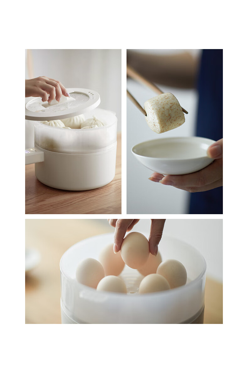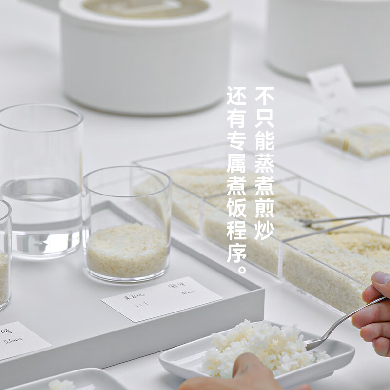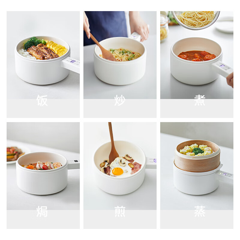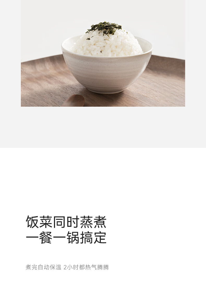 智能多功能电饭煲: 颜色:陶白 容 量:2L 重量:2.6kg 额定功率:700W 产品尺寸:376*215*138mm 包装尺寸:462*267*158mm 1. 陶瓷釉内胆,硬度8H 无惧钢丝刷 2. 21cm大口径,锅深7cm,翻炒从容 3. 360°整圈发热,温度稳定,防干烧自动断电 4. 上蒸下煮,高透明食品级PP蒸笼(耐温180度)