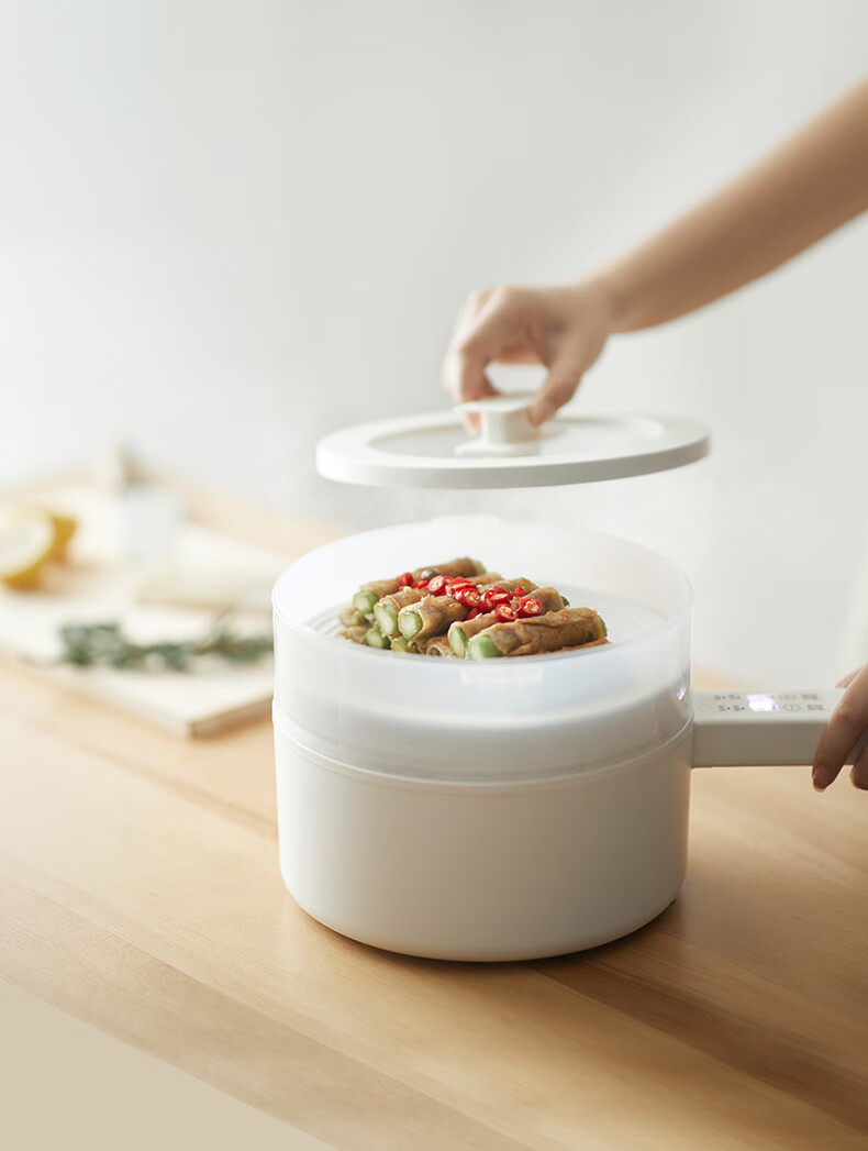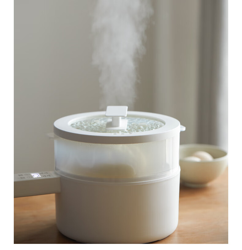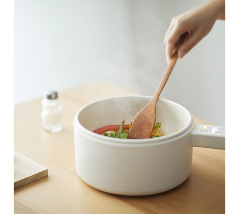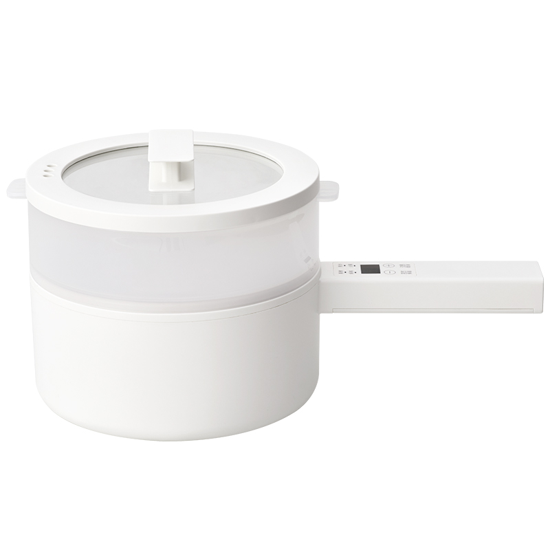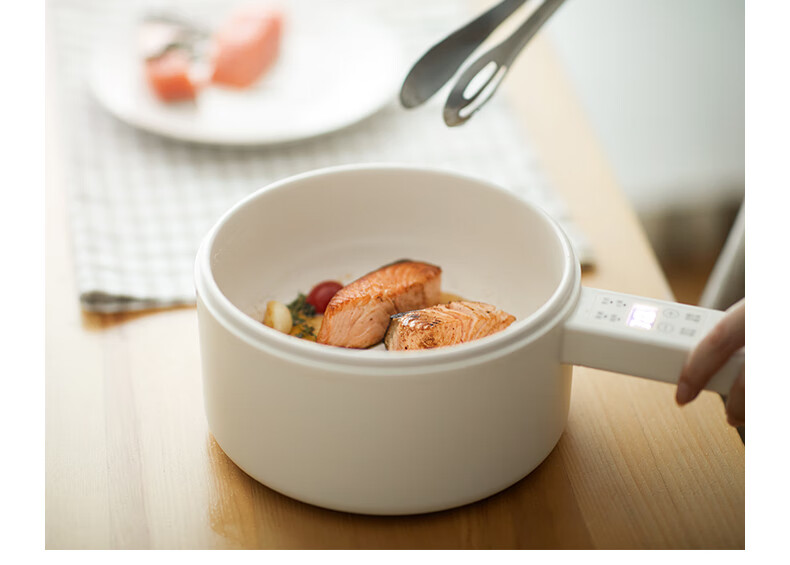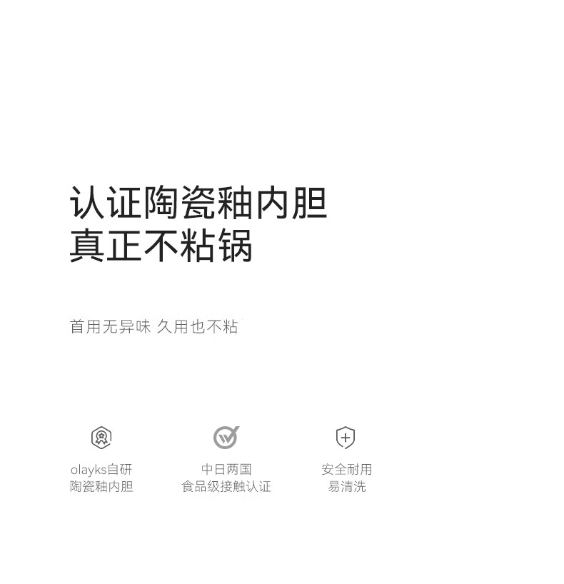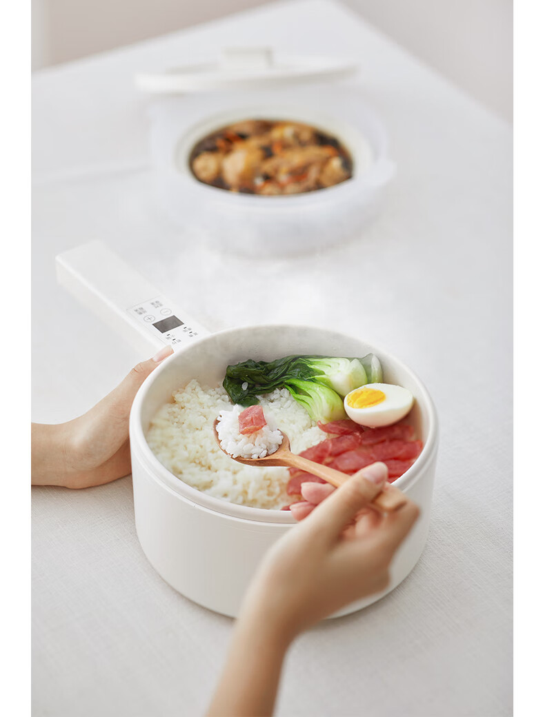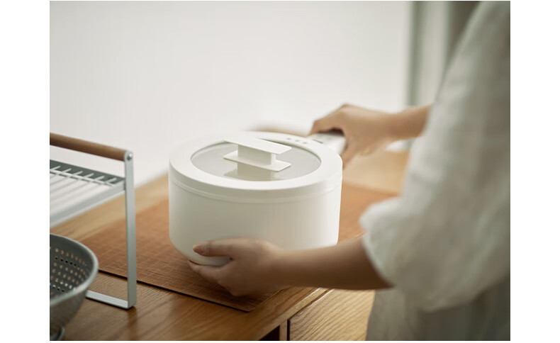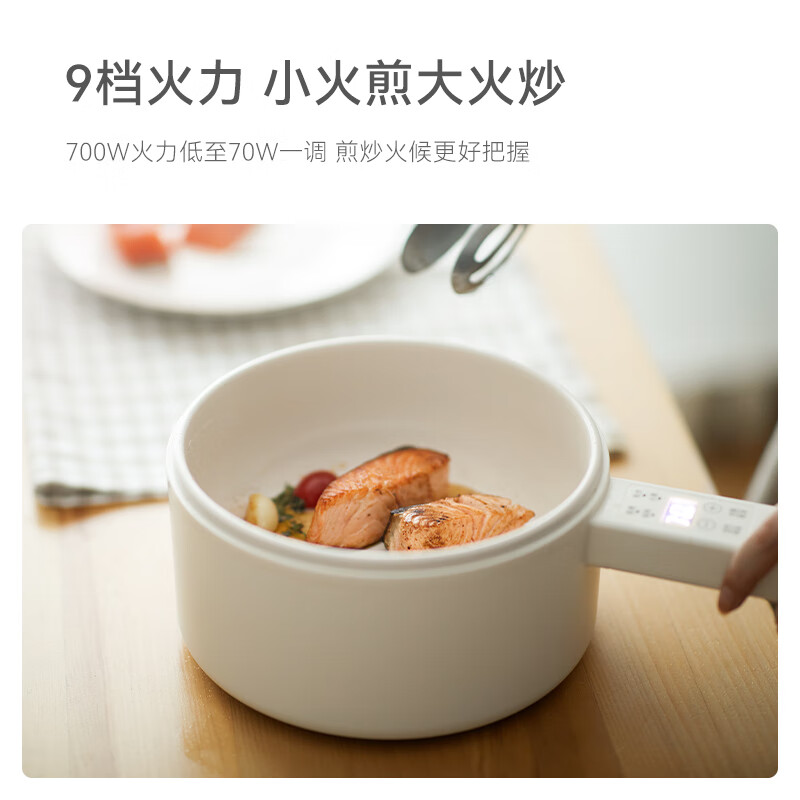 智能多功能电饭煲: 颜色:陶白 容 量:2L 重量:2.6kg 额定功率:700W 产品尺寸:376*215*138mm 包装尺寸:462*267*158mm 1. 陶瓷釉内胆,硬度8H 无惧钢丝刷 2. 21cm大口径,锅深7cm,翻炒从容 3. 360°整圈发热,温度稳定,防干烧自动断电 4. 上蒸下煮,高透明食品级PP蒸笼(耐温180度)