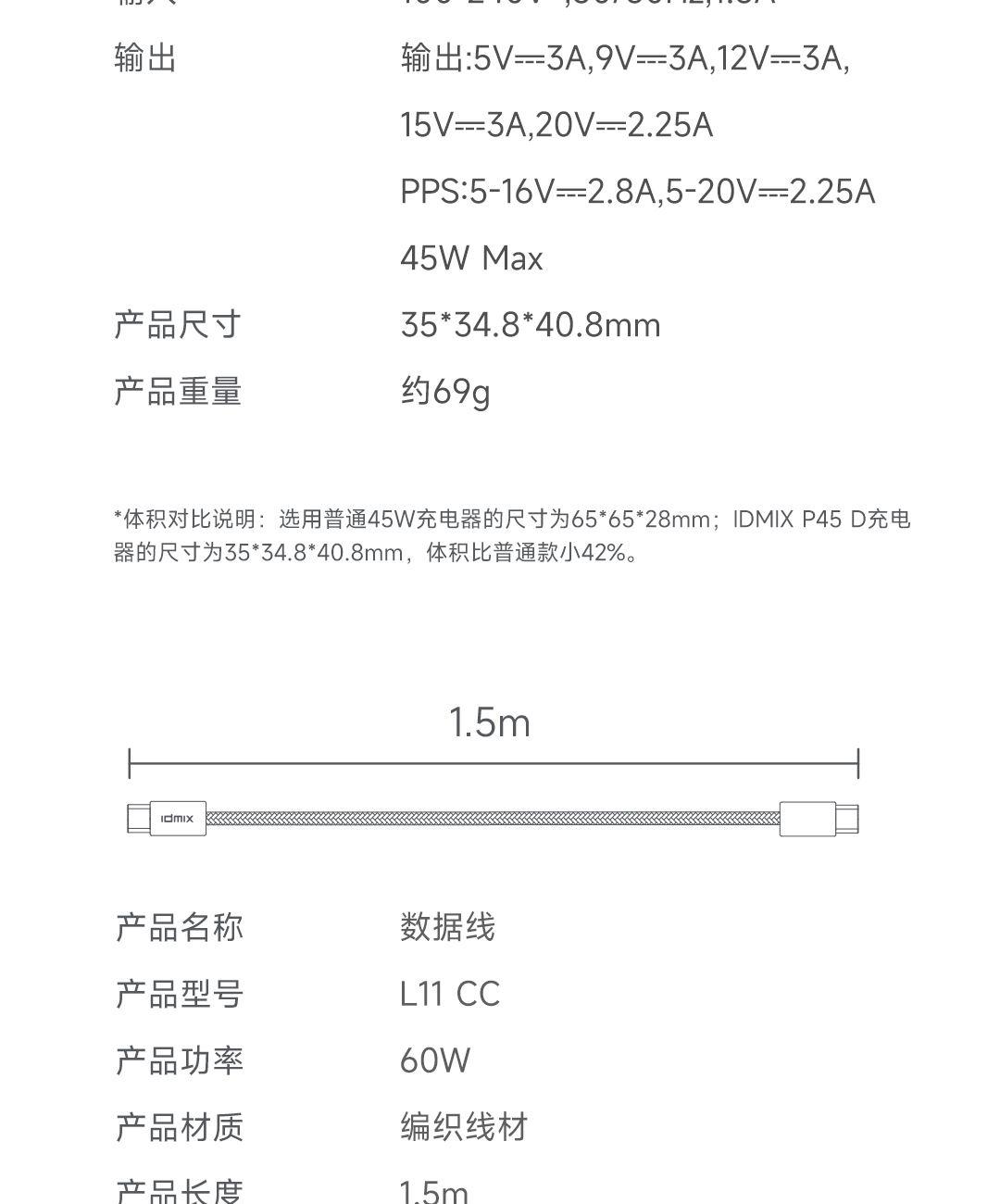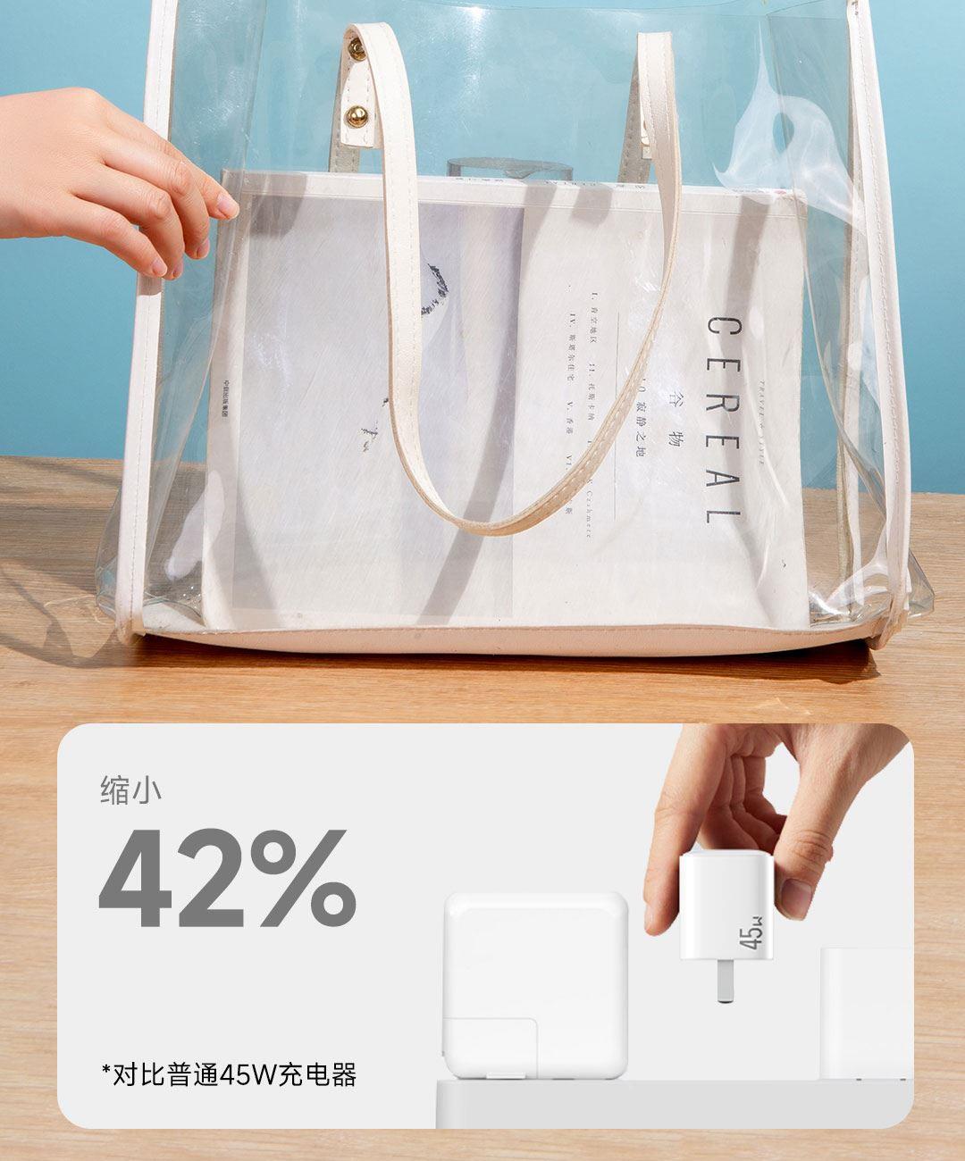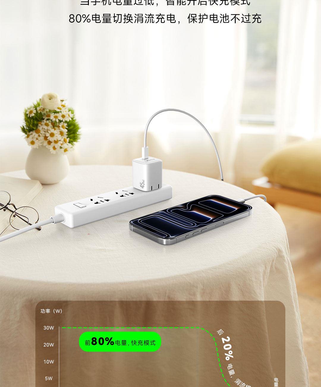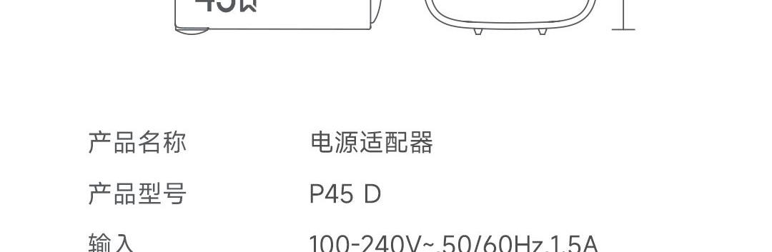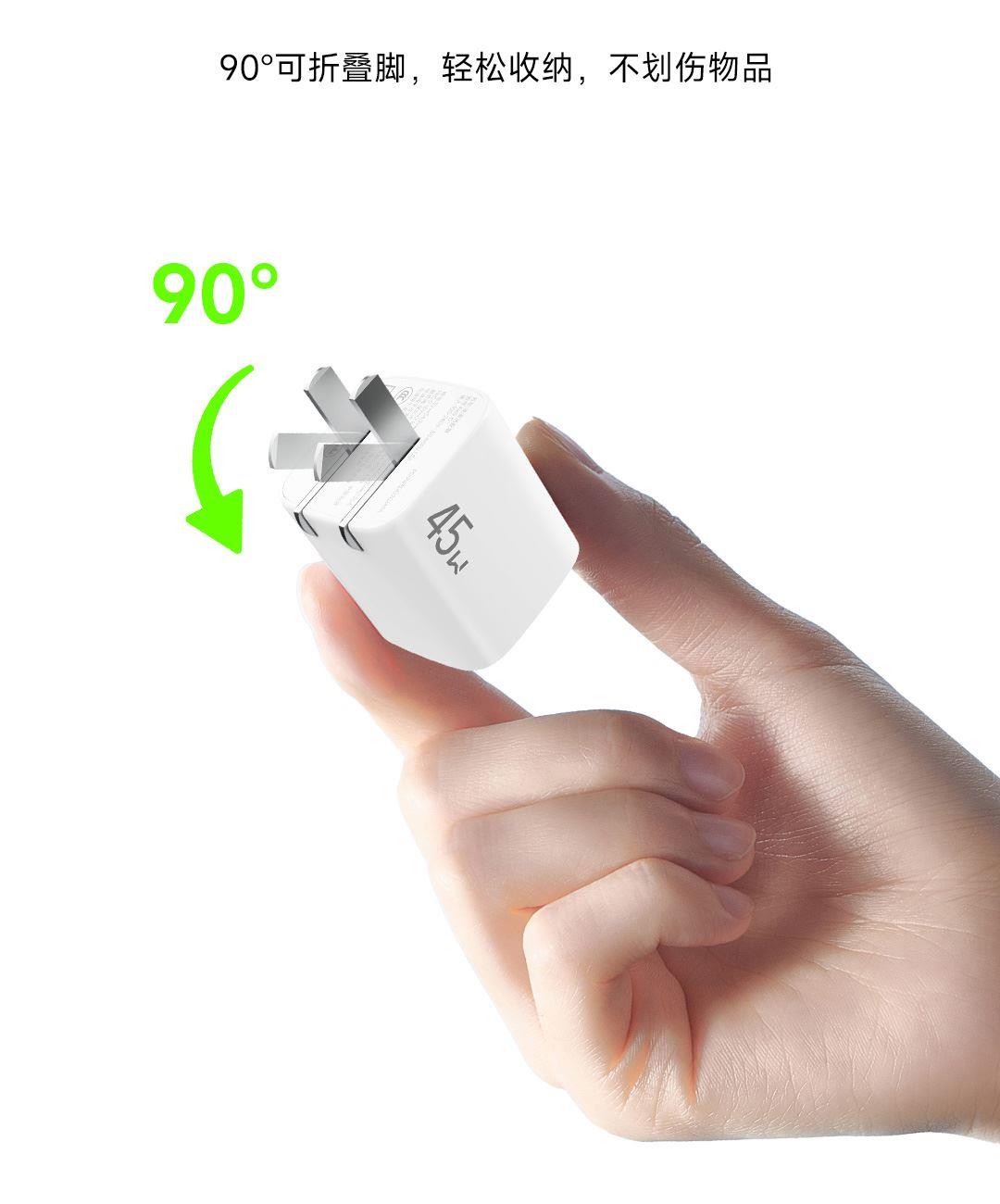 采用航天领域新型半导体材料GaN(氮化镓),使芯片集成度和能量转化率更高,体积更小,效率更高,发热更低. TYPE-C支持PD45w输出,兼容 PD3.0、QC3.0、FCP等主流协议可为苹果/安卓/MacBook等轻松补电,应急办公无忧 90°可折叠插脚,不划伤物品,轻松收纳,差旅携带方便 当手机电量过低,智能开启快充模式。80%电量切换涓流充电,保护电池不过充,智能涓流模式,不过充更安心 外壳采用V0级防火阻燃材质,耐磨耐用。3C安全认证,使用更安全. 输入:100-240V~,50/60Hz,1.5A 输出:5V=3A,9V=3A,12V=3A,15V=3A,20V=2.25A PPS:5-16V=2.8A 5-20V=2.25A(45W MAX) 产品尺寸:35*34.8*40.8mm 数据线:1.5m 产品重量:约69g 颜色:珍珠白