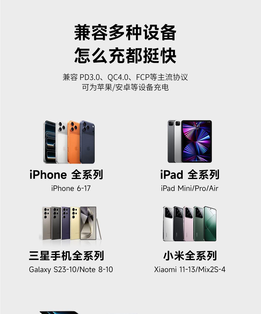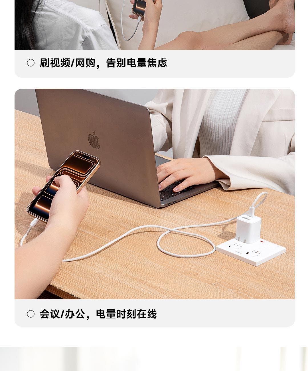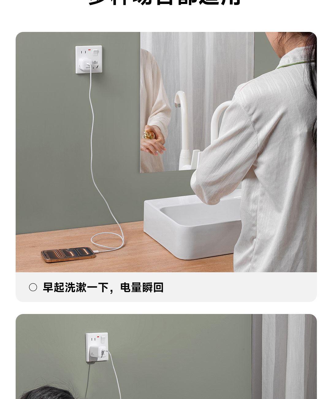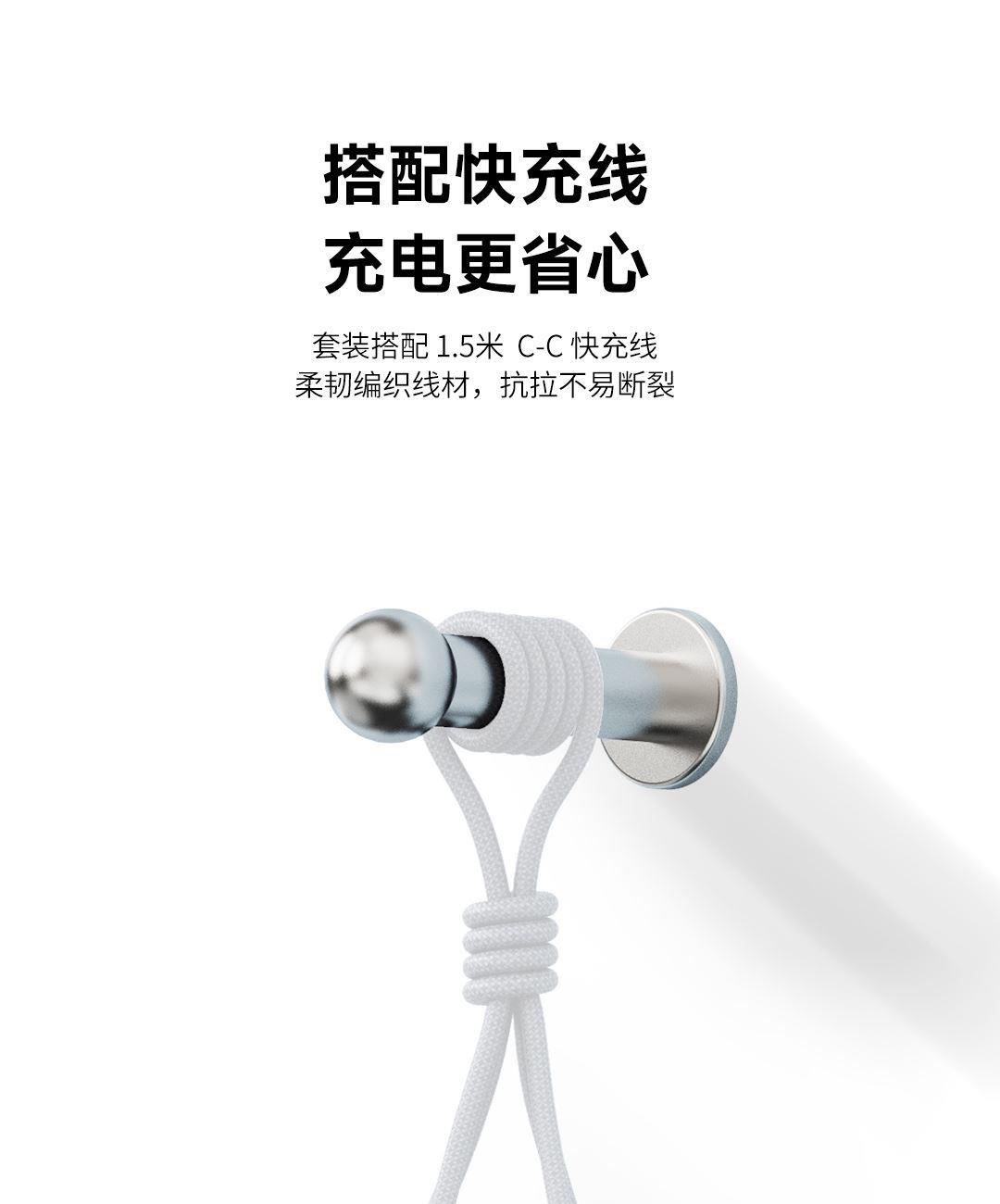 采用航天领域新型半导体材料GaN(氮化镓),使芯片集成度和能量转化率更高,体积更小,效率更高,发热更低. TYPE-C支持PD45w输出,兼容 PD3.0、QC3.0、FCP等主流协议可为苹果/安卓/MacBook等轻松补电,应急办公无忧 90°可折叠插脚,不划伤物品,轻松收纳,差旅携带方便 当手机电量过低,智能开启快充模式。80%电量切换涓流充电,保护电池不过充,智能涓流模式,不过充更安心 外壳采用V0级防火阻燃材质,耐磨耐用。3C安全认证,使用更安全. 输入:100-240V~,50/60Hz,1.5A 输出:5V=3A,9V=3A,12V=3A,15V=3A,20V=2.25A PPS:5-16V=2.8A 5-20V=2.25A(45W MAX) 产品尺寸:35*34.8*40.8mm 数据线:1.5m 产品重量:约69g 颜色:珍珠白