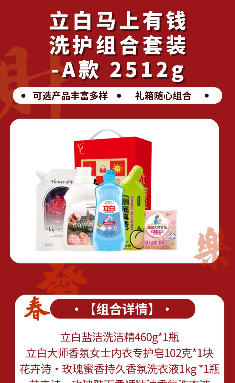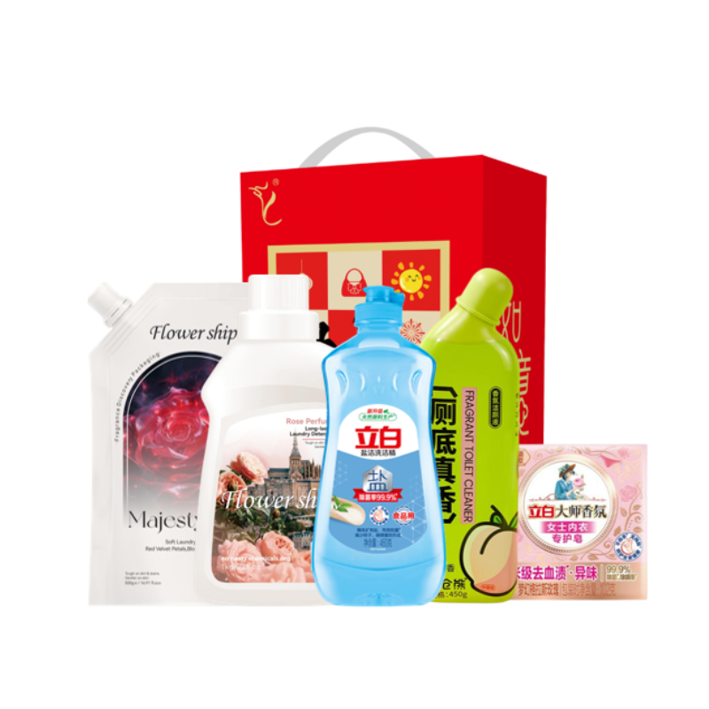 配置: 立白盐洁洗洁精460g*1瓶 立白大师香氛女士内衣专护皂102克*1块 花卉诗·玫瑰蜜香持久香氛洗衣液1kg *1瓶 花卉诗·玫瑰陛下柔顺精油香氛洗衣液500g*1袋 小仓熊香氛洁厕液450g*1瓶 卖点: 可选产品丰富多样,礼箱随心组合,多种价位因需而定,充分满足各种送礼需求,是商务送礼、单位福利的用心之选。