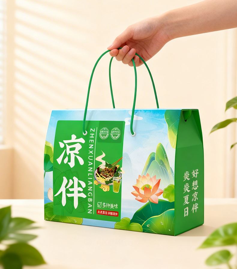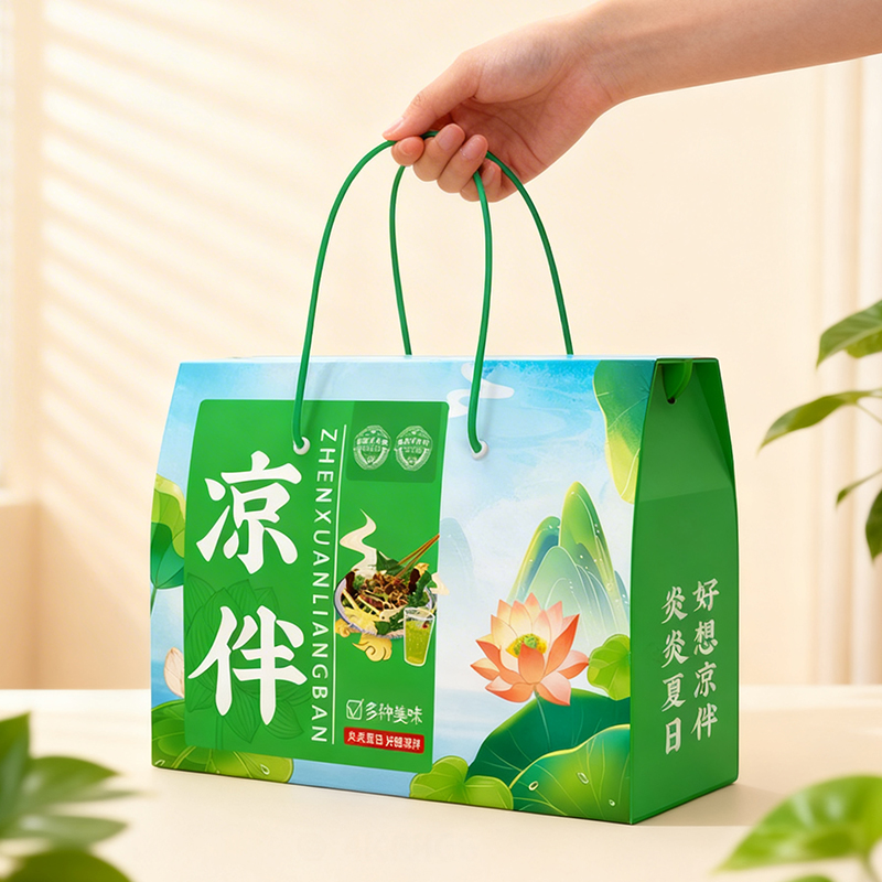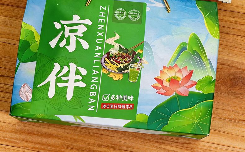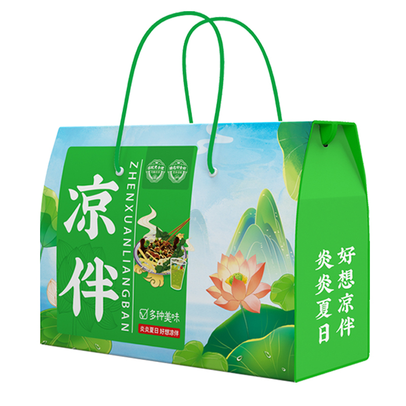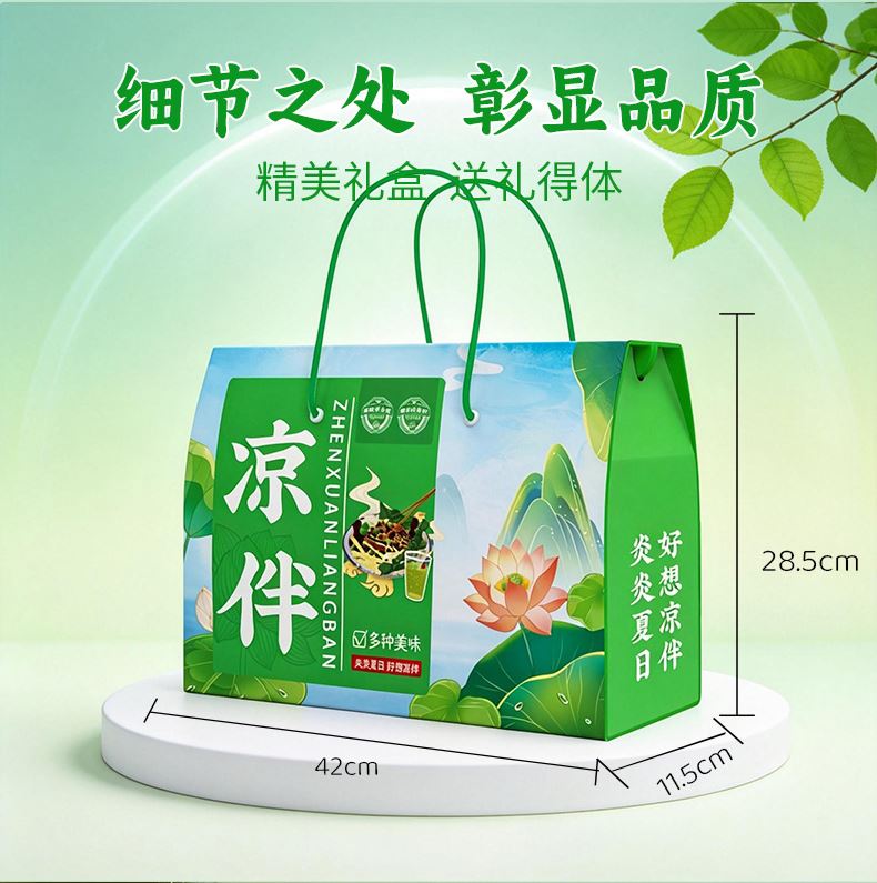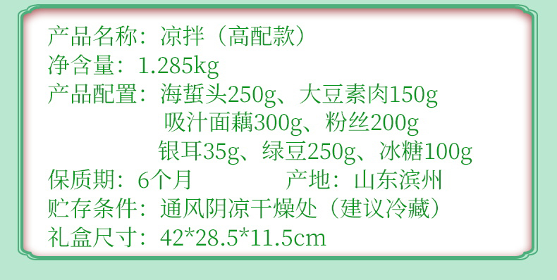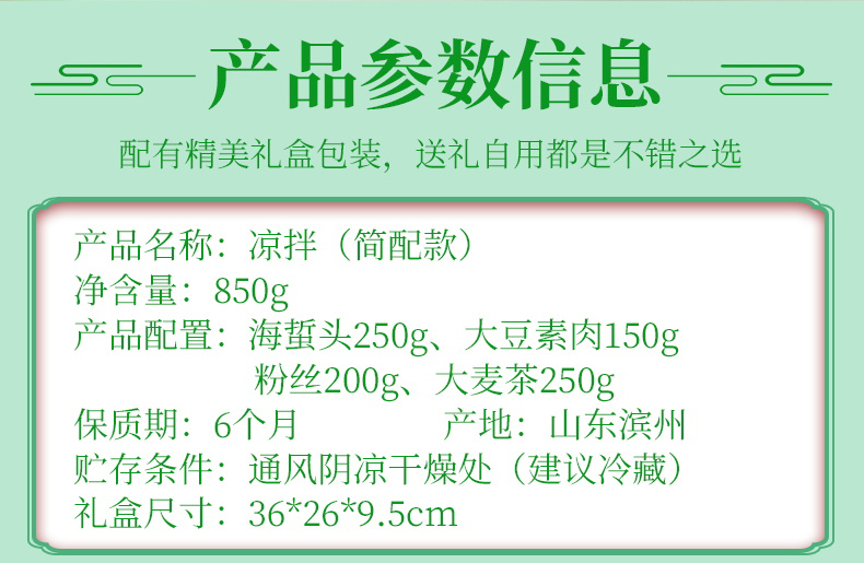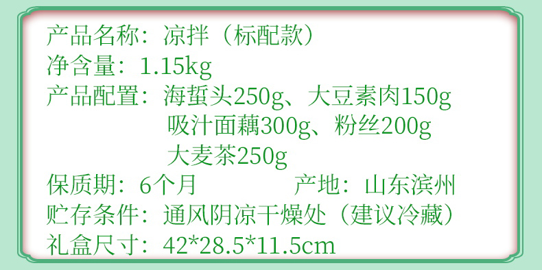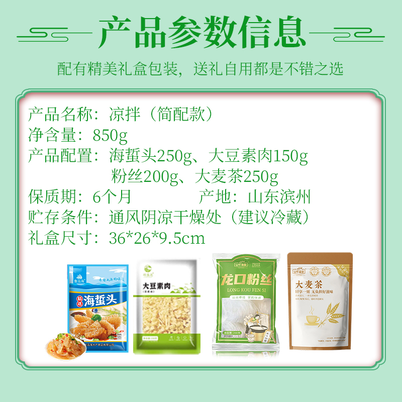 凉拌(简配) 净含量:850g 产品规格配置:海蜇头250g、大豆素肉150g粉丝200g、大麦茶250g 盒尺寸:36*26*9.5cm 箱尺寸:60*37.5*54 箱重量:13.4kg 箱体积:0.122方