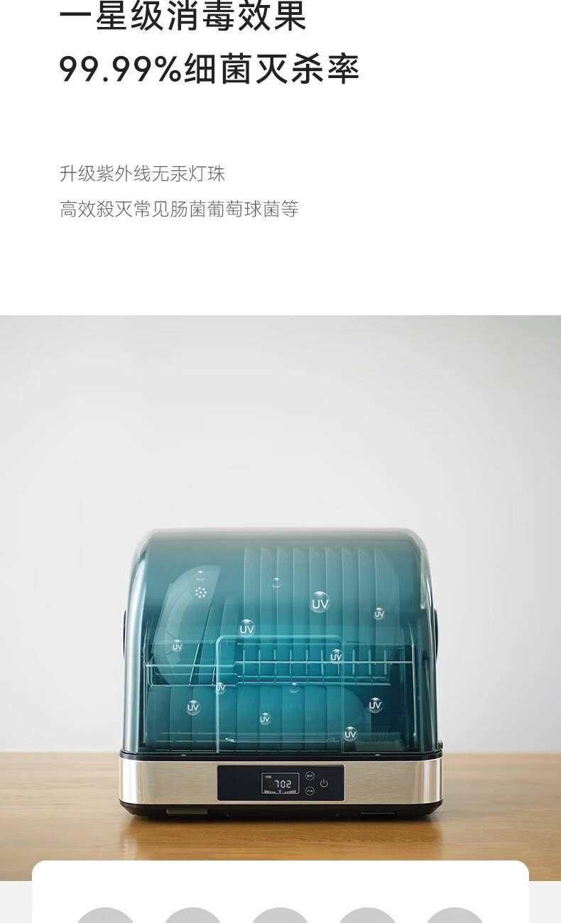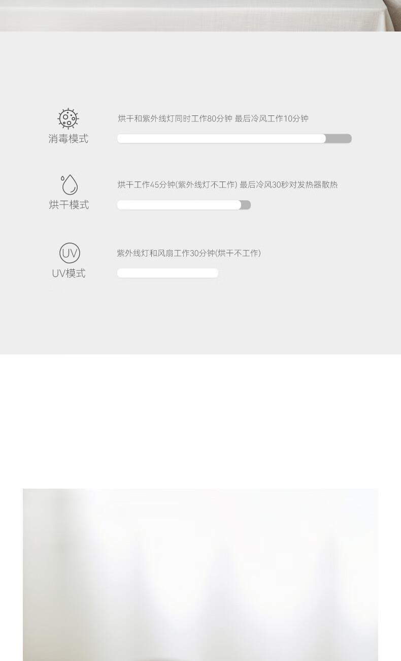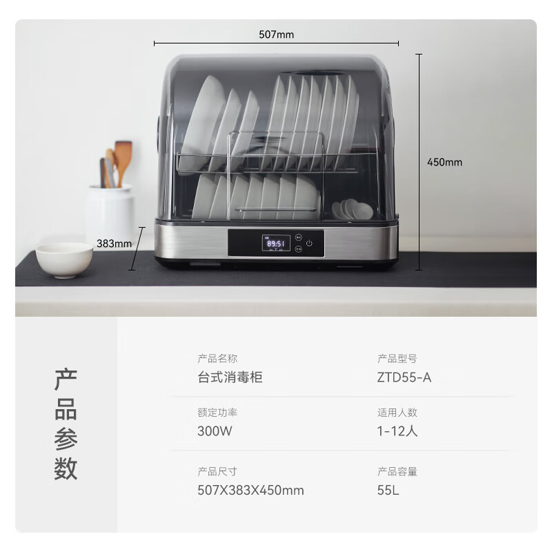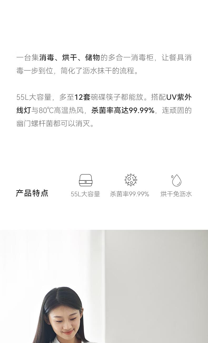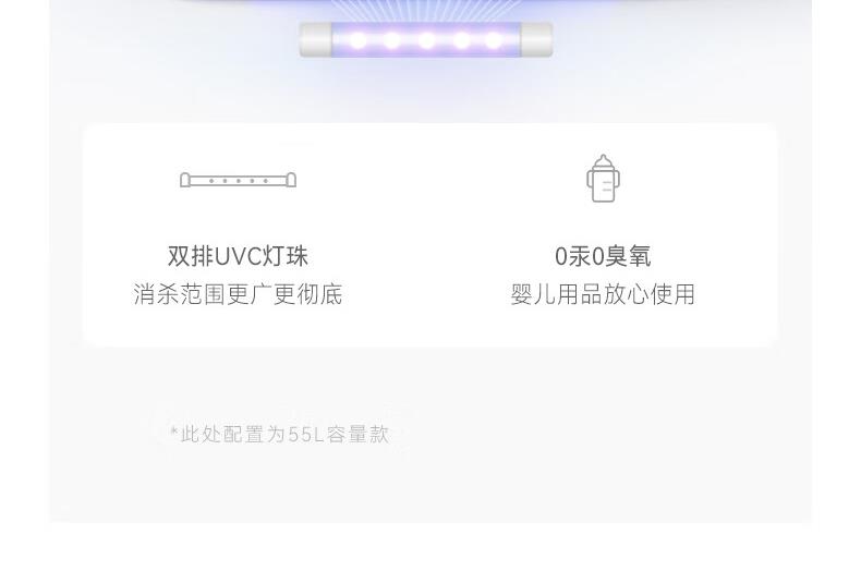 消毒柜:颜色:陶白 容量:55L 重量:6.5kg 额定功率:300W 产品尺寸:507*383*450mm 包装尺寸:570*440*515mm 1. 一台集消毒、烘干、储物的多合一消毒柜 2. 升级紫外线无汞灯珠 3. 0汞0臭氧消毒效果强于灯管,硅胶器皿不老化不变色不挑材质,母婴用品放心用