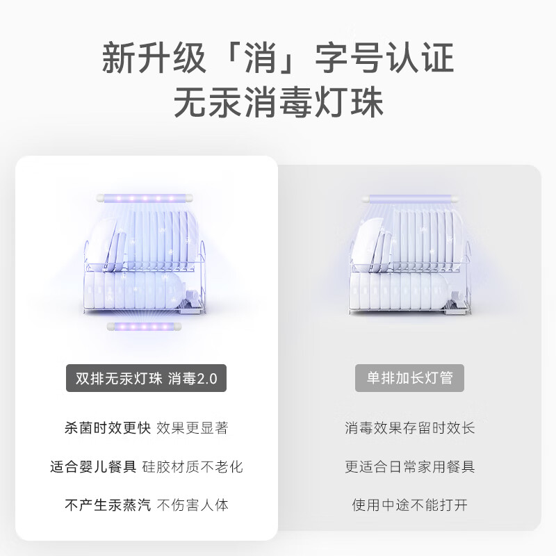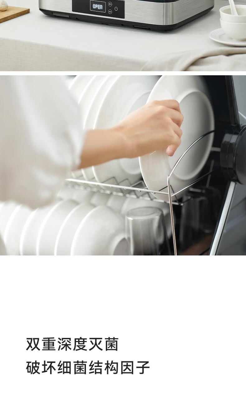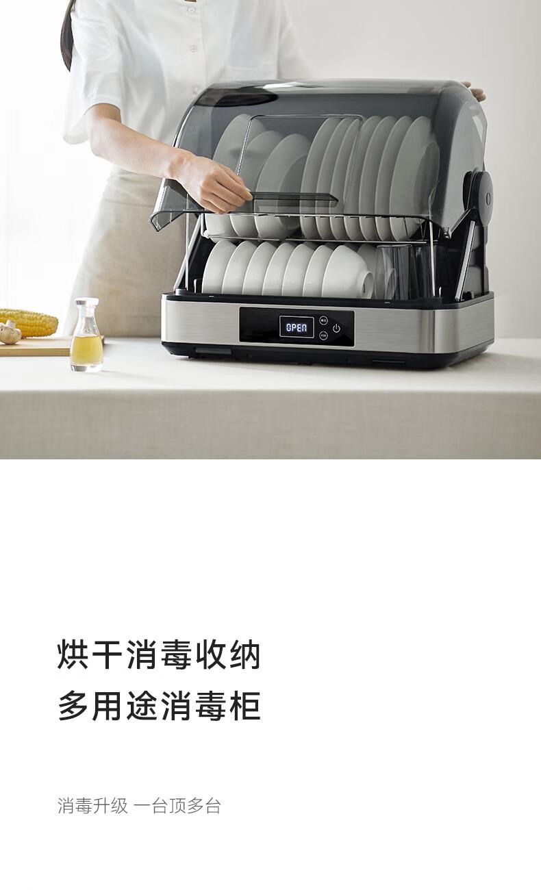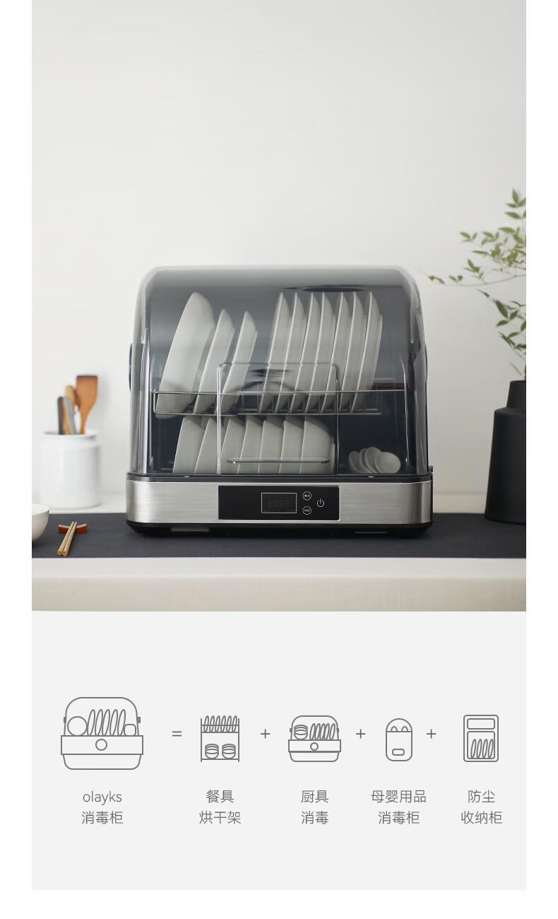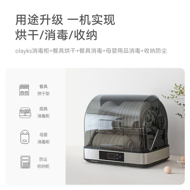 消毒柜:颜色:陶白 容量:55L 重量:6.5kg 额定功率:300W 产品尺寸:507*383*450mm 包装尺寸:570*440*515mm 1. 一台集消毒、烘干、储物的多合一消毒柜 2. 升级紫外线无汞灯珠 3. 0汞0臭氧消毒效果强于灯管,硅胶器皿不老化不变色不挑材质,母婴用品放心用
