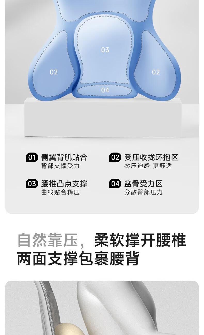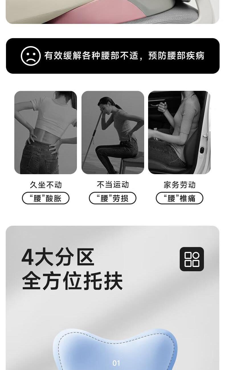 【腰靠坐垫】专为久坐人群设计。 【多方位托付腰部】顶腰不顶臀,贴合支撑。 【曲线人体工学设计坐垫】久坐尾椎舒压。