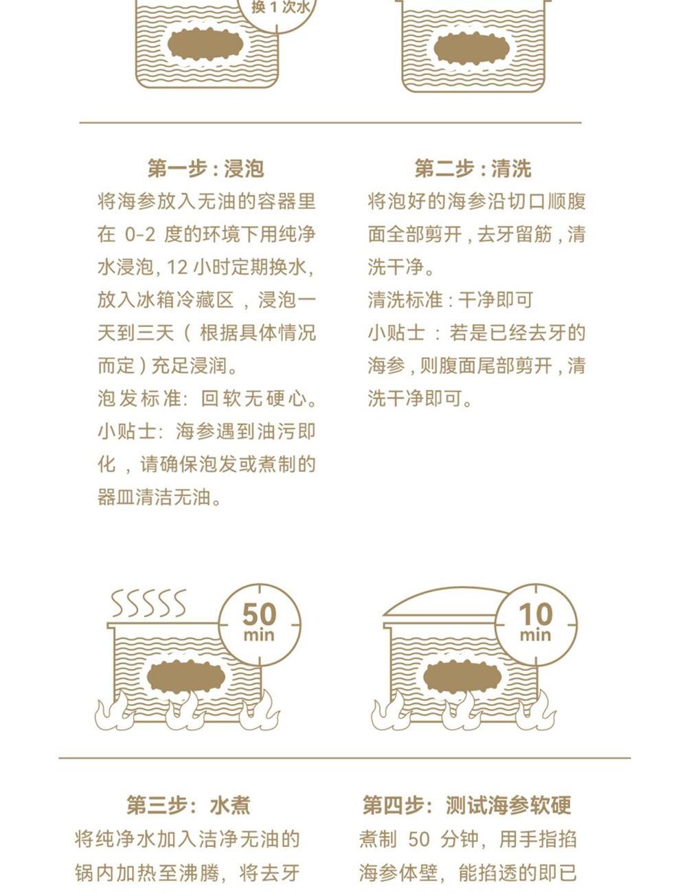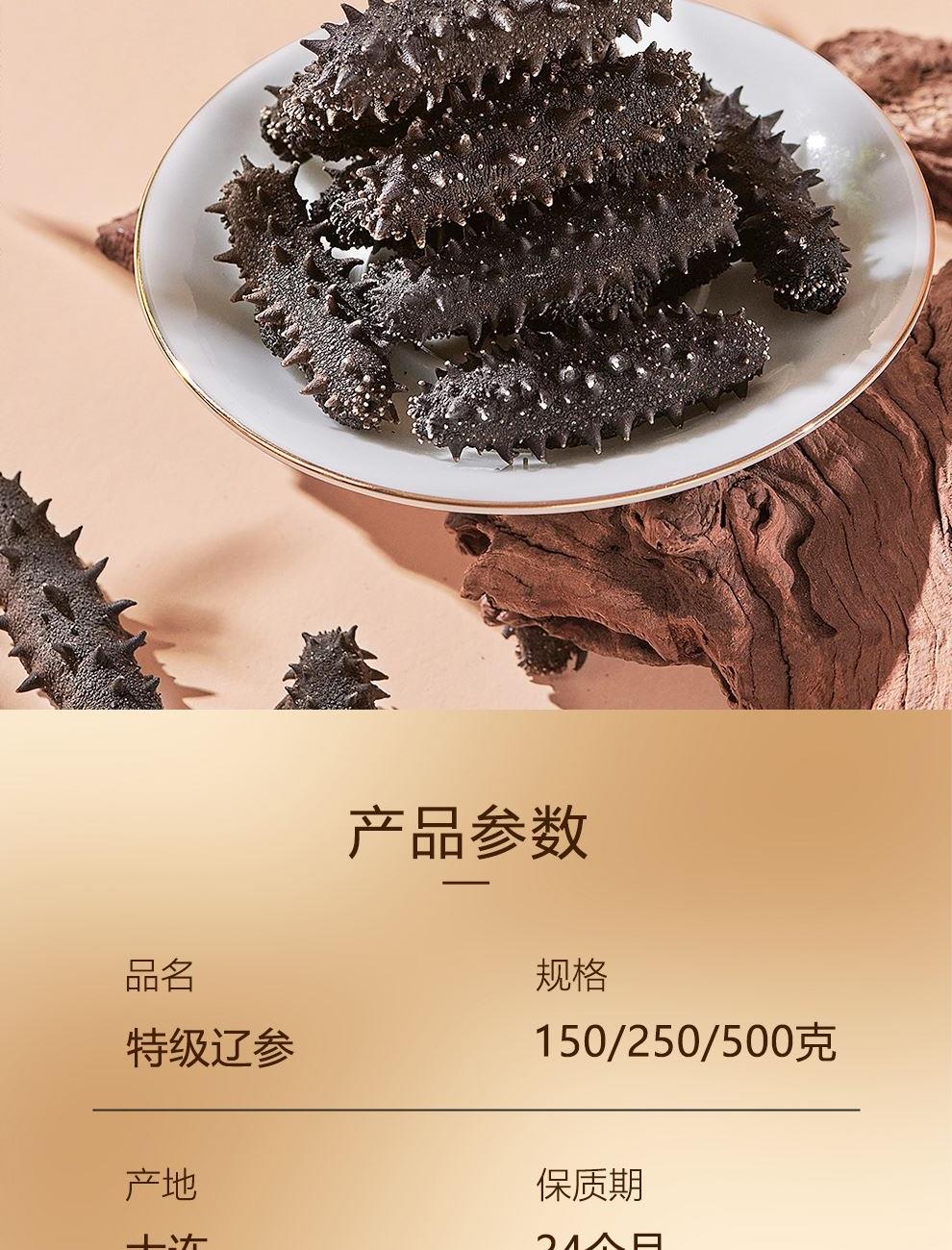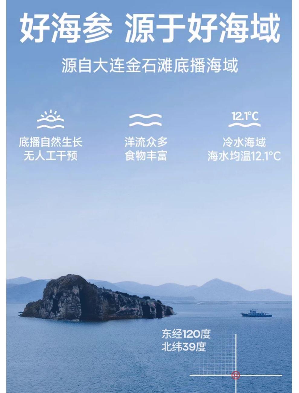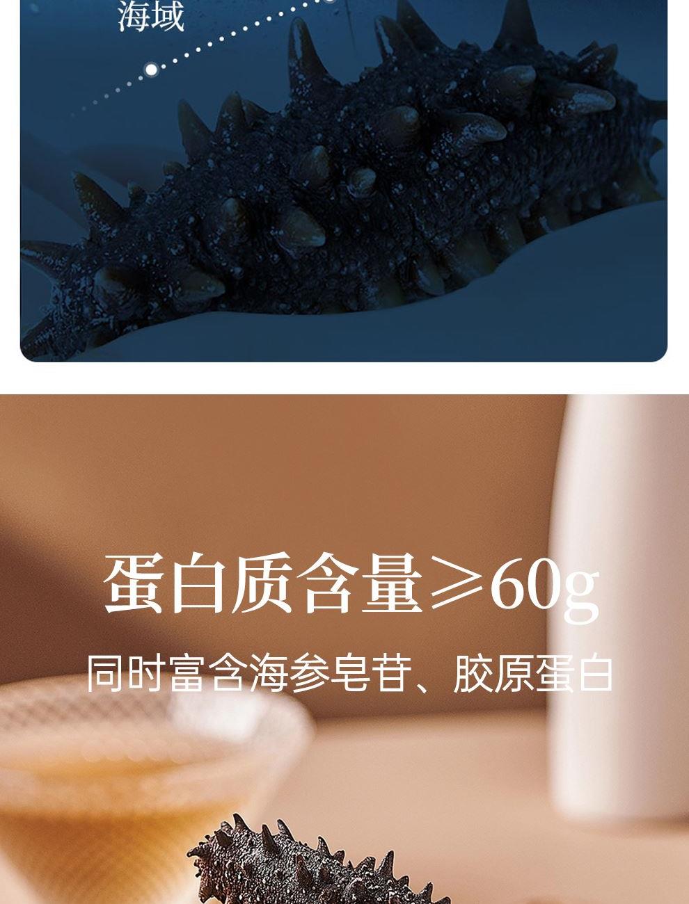 源自大连北纬39°黄金海域,冷水慢养,造就出众品质。 采用传统淡干工艺,营养保留更完整,更便于储存与运输。 富含优质蛋白与多种微量元素,特有的海参多糖与皂苷。 泡发后肉质肥厚,口感Q弹劲道,鲜美醇正。