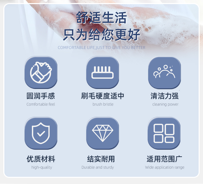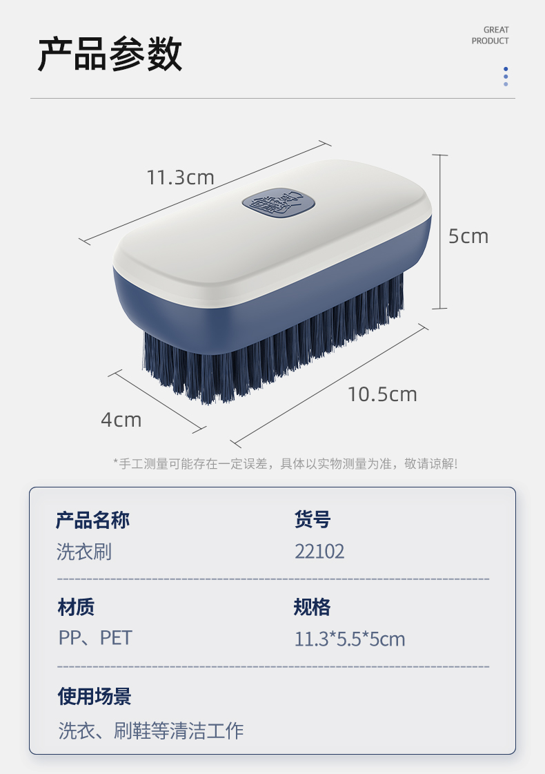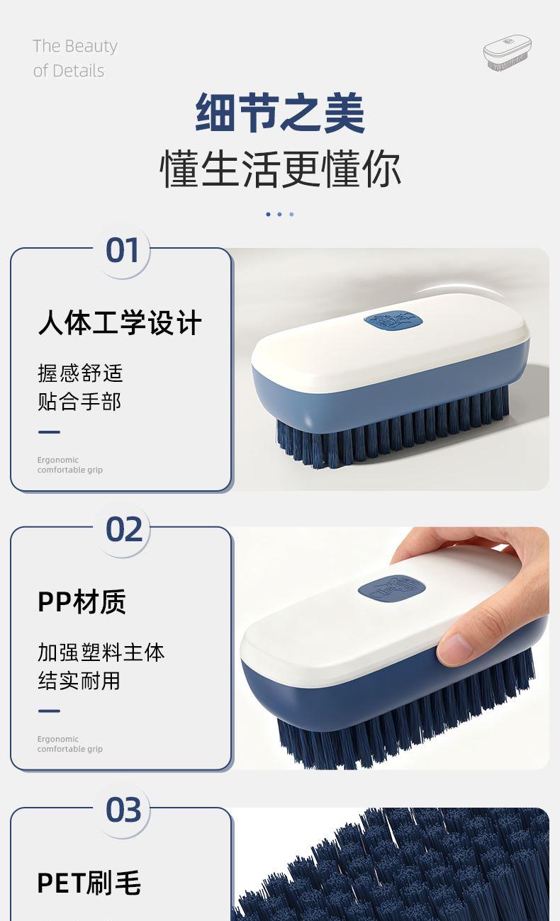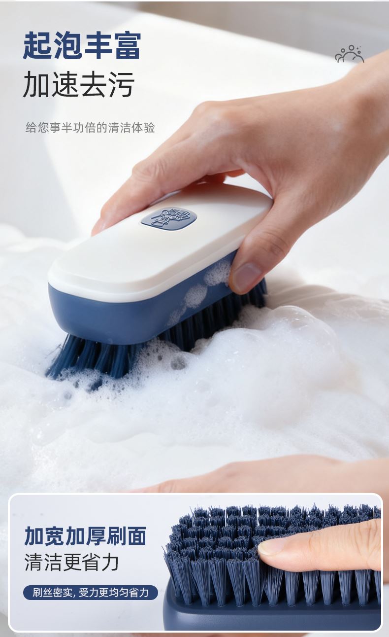抓握圆润饱满大小刚刚好,与掌心更贴合,使用更轻松 整齐细密刷毛轻松刷洗不易伤衣物 耐磨损,高回弹,轻松清洁衣物 全新PP+PET材质,耐摔抗腐蚀性好,洗刷自如 起泡丰富加速去污 给您事半功倍的清洁体验 加宽加厚刷面清洁更省力,刷丝密实,受力更均匀省力 告别手搓清洁实力派 轻轻一刷,衣物焕然一新