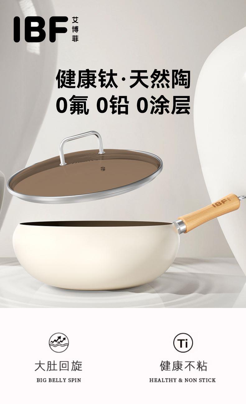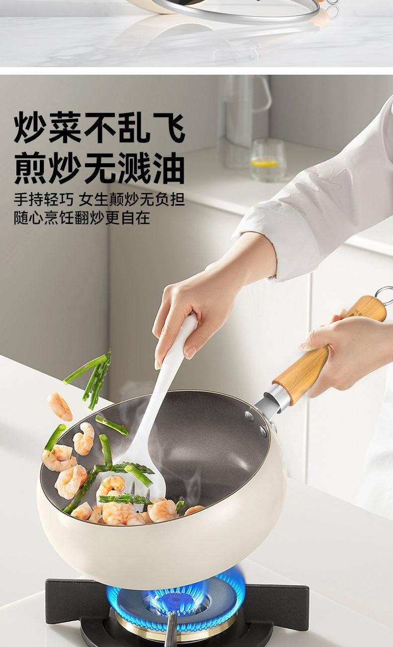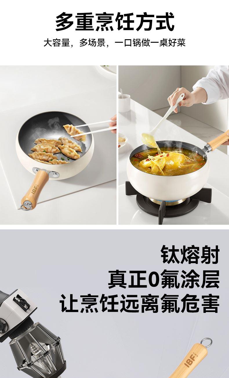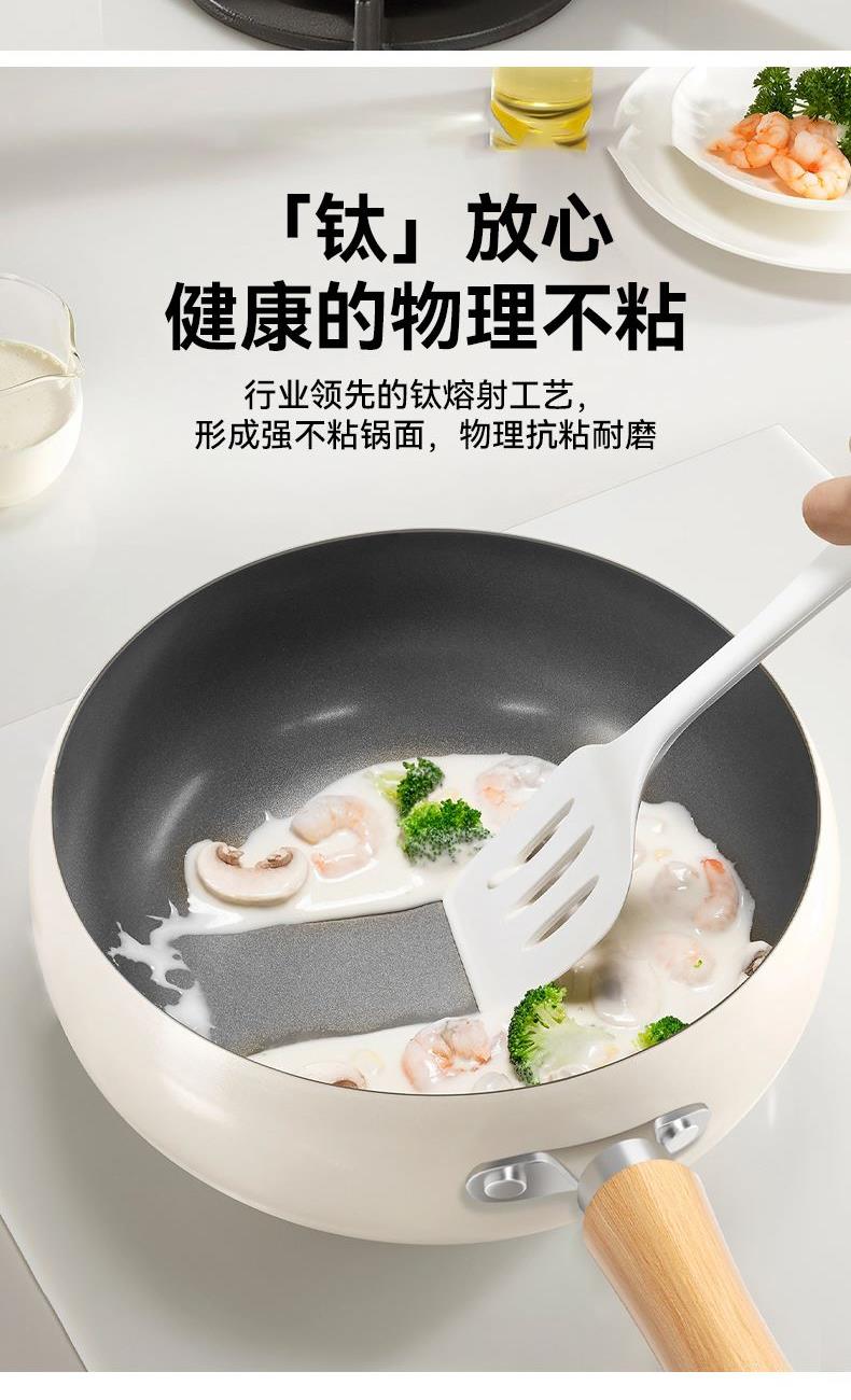 产品材质:食品接触用精铁 产品规格:240mm 执行标准:GB/T 32432-2015 GB 4806.10-2016 包装体积:45x13.x27cm 外箱尺寸:54.5x46.5x56.50cm 商品条码:6970070170320 技术工艺:小分子钛熔射工艺,强化物 理不粘 适用灶具:燃气/电磁炉通用/电陶炉兼用 内装检验:一套(检验合格)一等品 产品颜色:米白色 一套重量:2.1KG 一件重量:18.5KG 锅内涂选用航天钛金属耐磨性能大幅提升、运用全新的小分子钛熔射工艺,强化物理不粘,真正0氟涂层让烹饪远离氟危害。 内外不粘、一锅多用(可炒、煎、炸、炖)让烹饪游刃有余。 容量,恰到好处:口径24cm是黄金尺寸、深度10.5cm,翻炒时食材不易外溅。适配2-3人小家庭或控制分量,避免浪费。 聚热高效,省时省能:小口径加热更快更均匀,缩短烹饪时间,节省能源。 易清洁维护:不粘表面一冲即净,部分型号支持洗碗机清洗。 人体工学手柄:木质手柄,铆钉固定,避免松动。