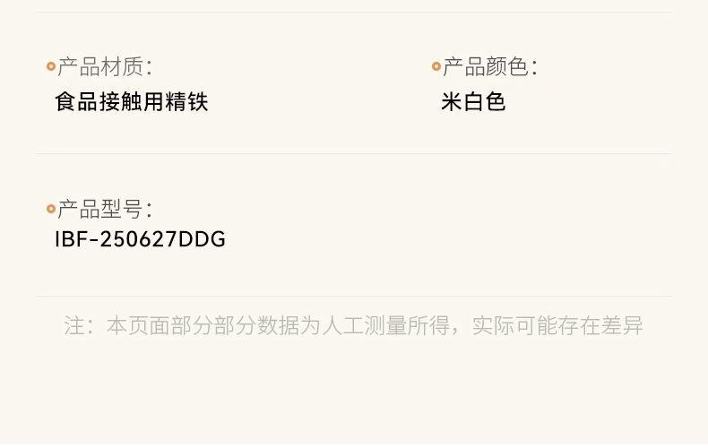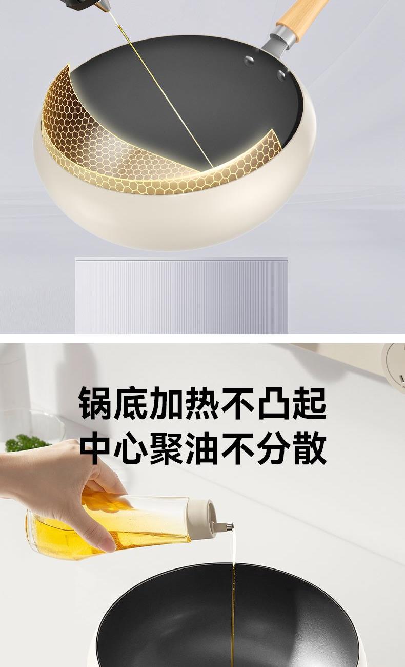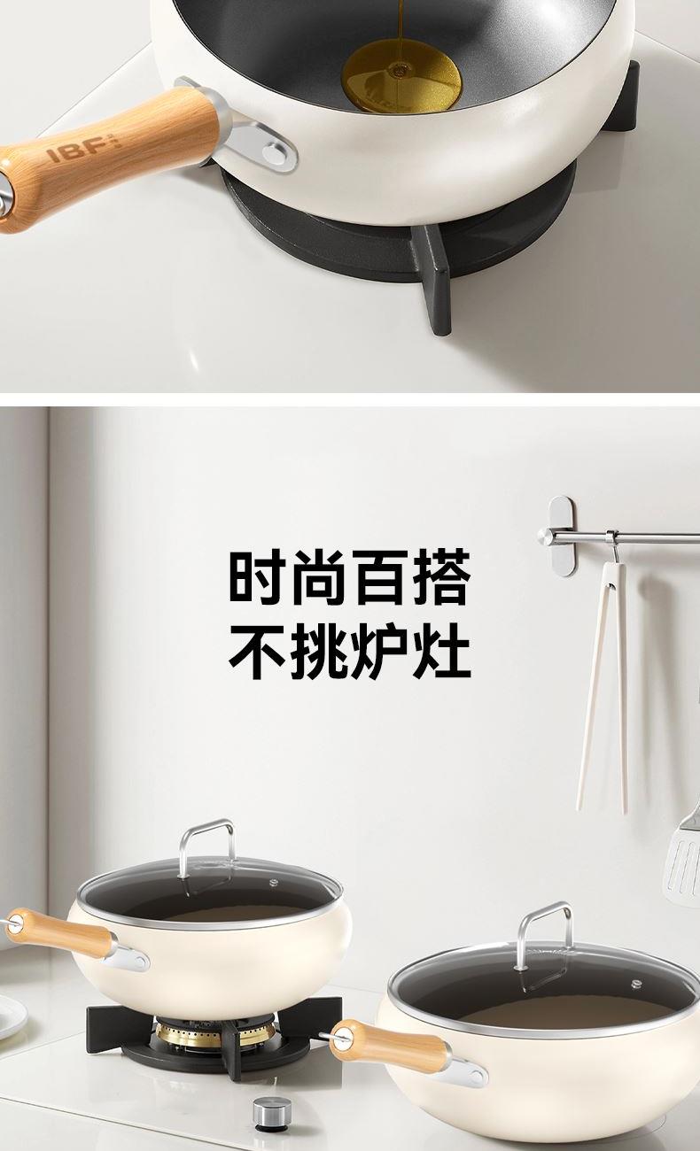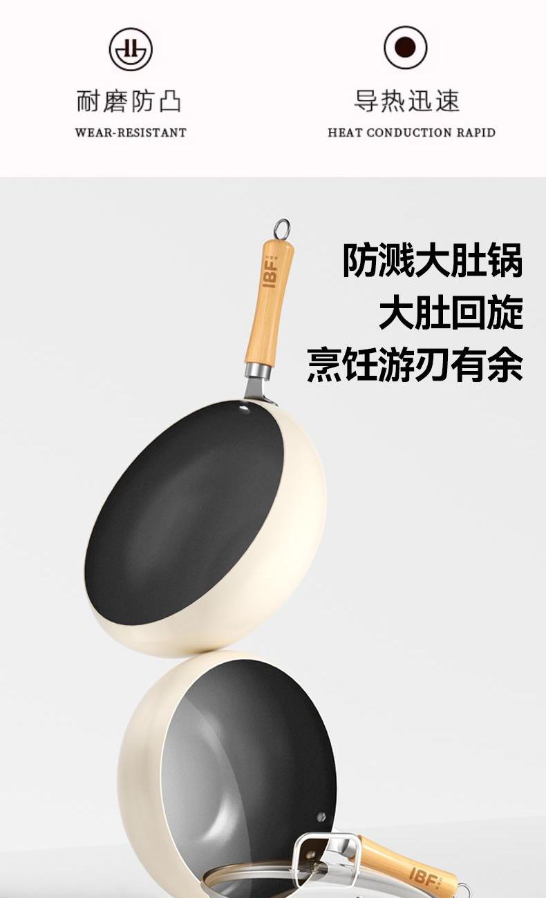 产品材质:食品接触用精铁 产品规格:240mm 执行标准:GB/T 32432-2015 GB 4806.10-2016 包装体积:45x13.x27cm 外箱尺寸:54.5x46.5x56.50cm 商品条码:6970070170320 技术工艺:小分子钛熔射工艺,强化物 理不粘 适用灶具:燃气/电磁炉通用/电陶炉兼用 内装检验:一套(检验合格)一等品 产品颜色:米白色 一套重量:2.1KG 一件重量:18.5KG 锅内涂选用航天钛金属耐磨性能大幅提升、运用全新的小分子钛熔射工艺,强化物理不粘,真正0氟涂层让烹饪远离氟危害。 内外不粘、一锅多用(可炒、煎、炸、炖)让烹饪游刃有余。 容量,恰到好处:口径24cm是黄金尺寸、深度10.5cm,翻炒时食材不易外溅。适配2-3人小家庭或控制分量,避免浪费。 聚热高效,省时省能:小口径加热更快更均匀,缩短烹饪时间,节省能源。 易清洁维护:不粘表面一冲即净,部分型号支持洗碗机清洗。 人体工学手柄:木质手柄,铆钉固定,避免松动。