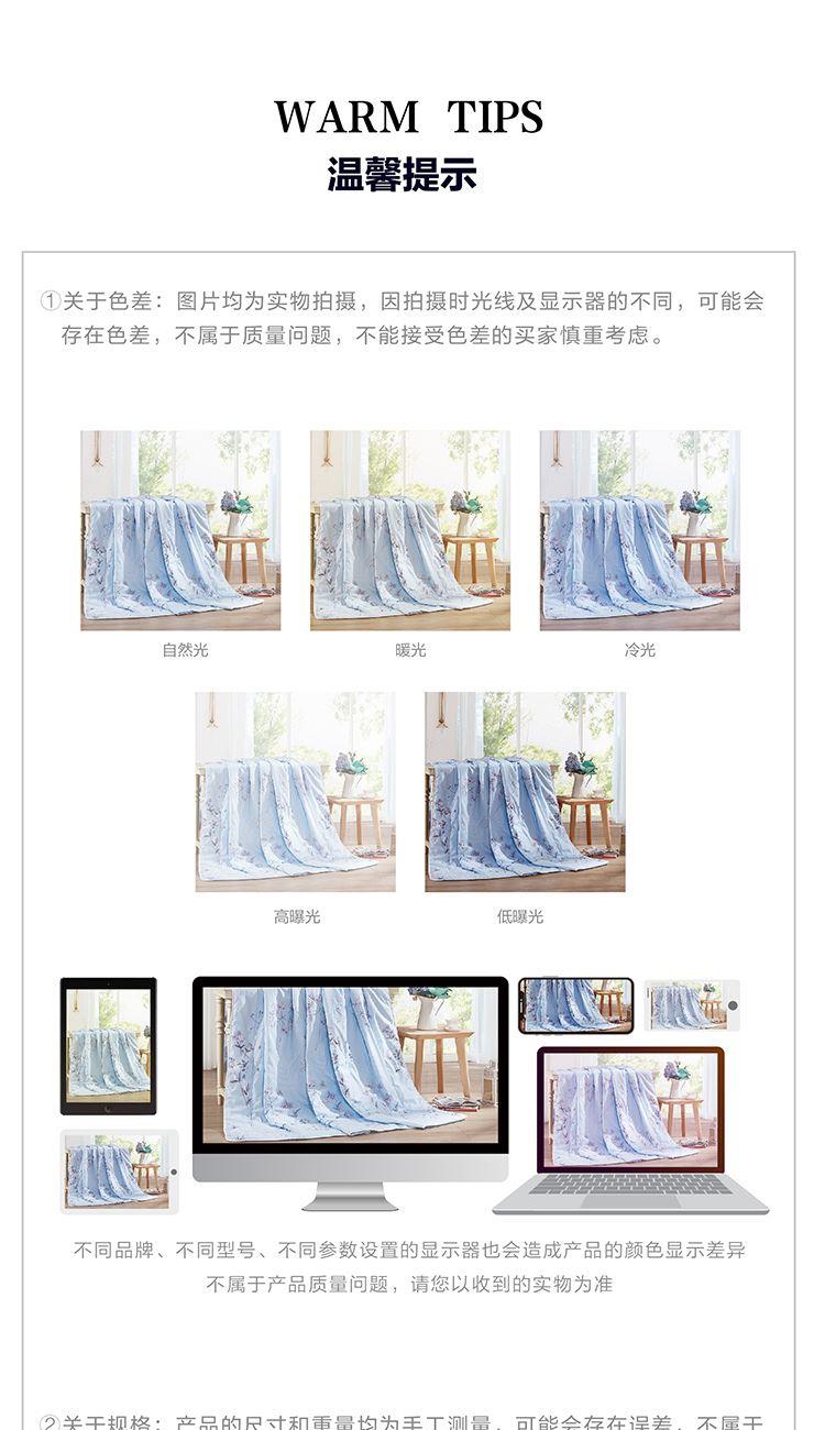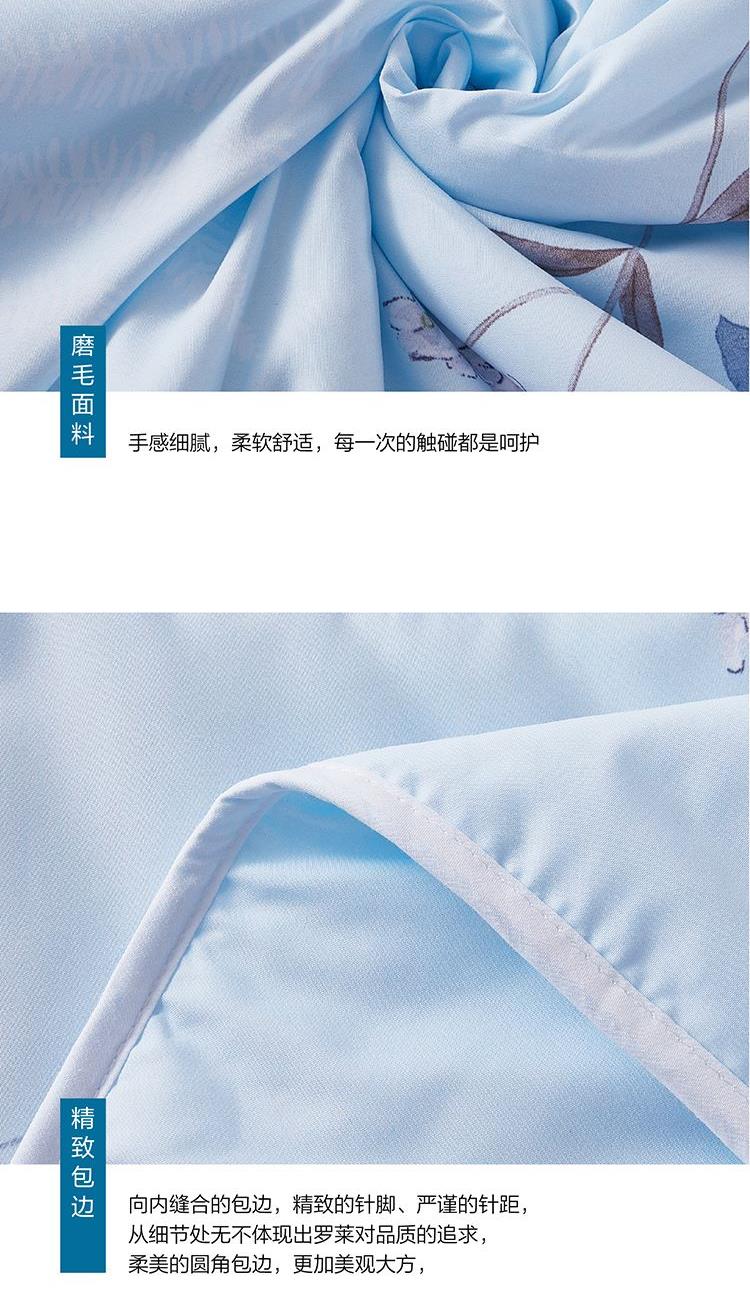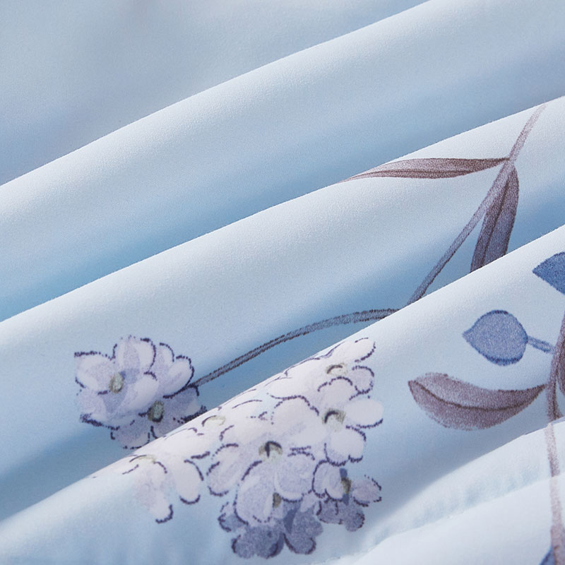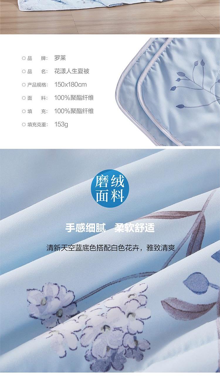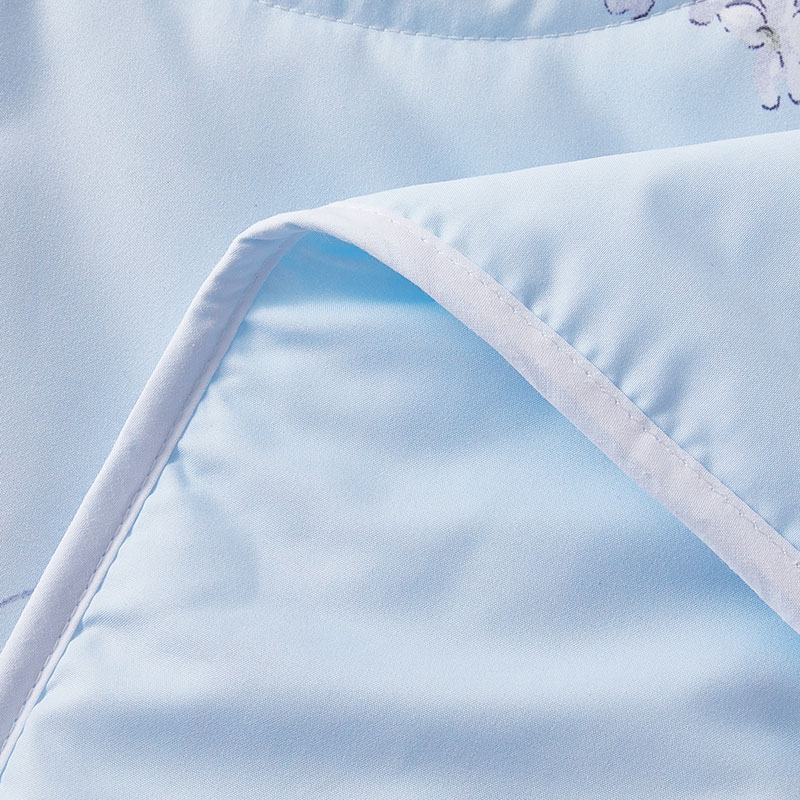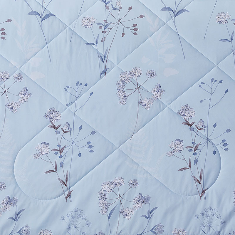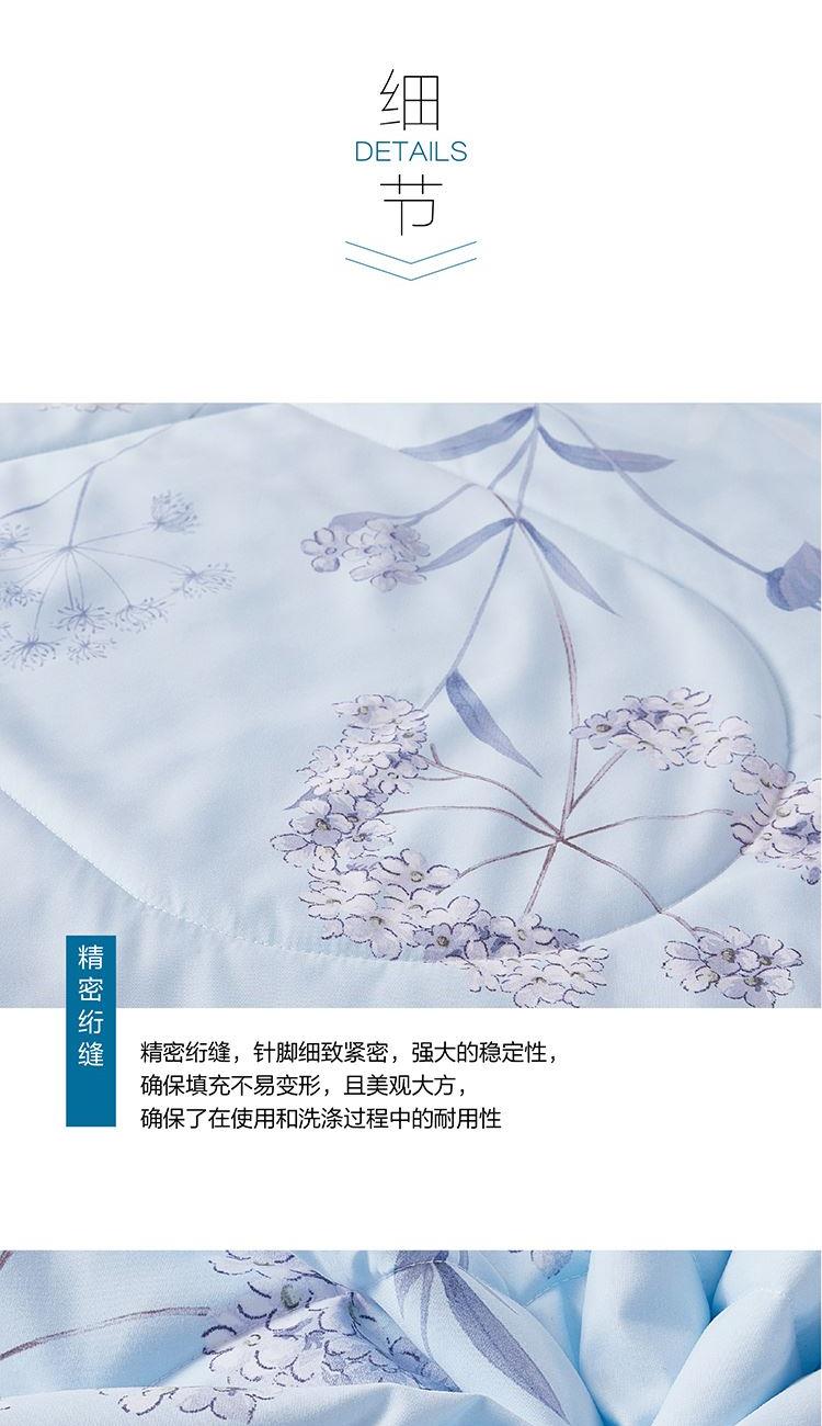 面料材质:聚酯纤维 填充材质:聚酯纤维 规格尺寸:150*180cm 填充重量:153g 采用桃皮绒面料,表面附有细密的绒毛,手感绵密,亲肤舒适; 特别填充了中空纤维,中空结构拥有优异的通风透气特性,可迅速排湿,确保睡眠环境的干爽; 淡蓝底色搭配娇俏的绣球花以及蕨草的纹样,虚实结合,带来独特的艺术之美。