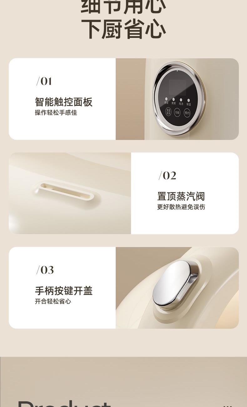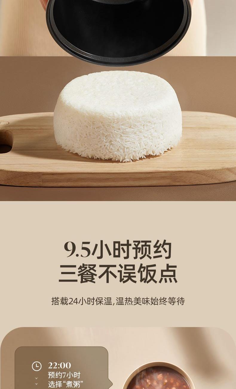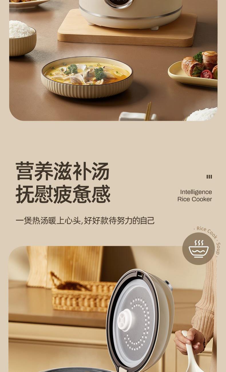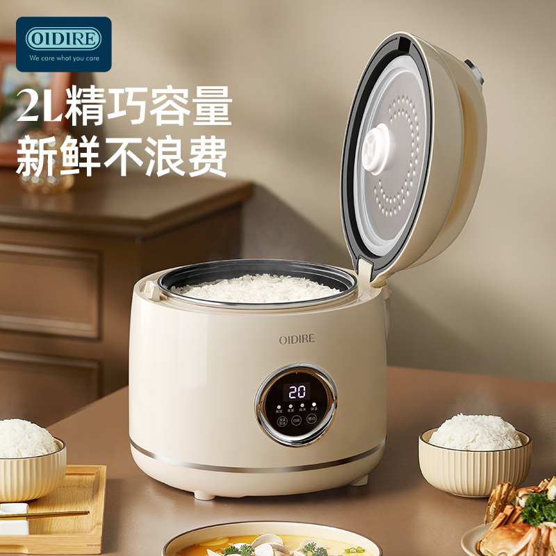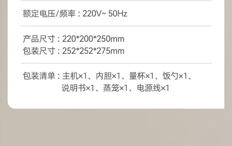 主要材质:PP主体+铝合金内胆 电压:220V 功率:300W 容量:2L 产品尺寸: 220*200*250mm 包装尺寸:252*252*275mm 单台净重:1.5kg 单台毛重:1.8kg 规格:8台/箱 包装方式:3层彩盒+3层邮购箱+3层大外箱 1.2L容量,适合单身情侣人群使用 2.外型小巧精致 3.防粘涂层内胆,煮饭不易粘,清洗不费力 4.特设预约功能,程序结束自动保温 5.一键按压开盖,方便快捷