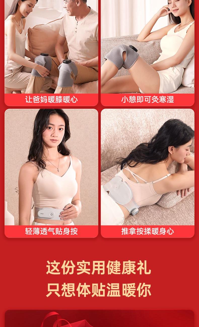 覆盖膝部更大范围,内置艾灸专用网袋,亲肤透气网纱+呼吸孔,搭配草本艾绒,NTC温控,3档温度可调,高效刺激膝周穴位,立体裁剪,3D微曲面;360°绕膝设计,无须担心滑落,让爸妈佩戴更舒适 中低频变频双脉冲+3档远红外热敷+ 无线操控,可多部位使用,纤薄隐形 贴身呵护,高性价比