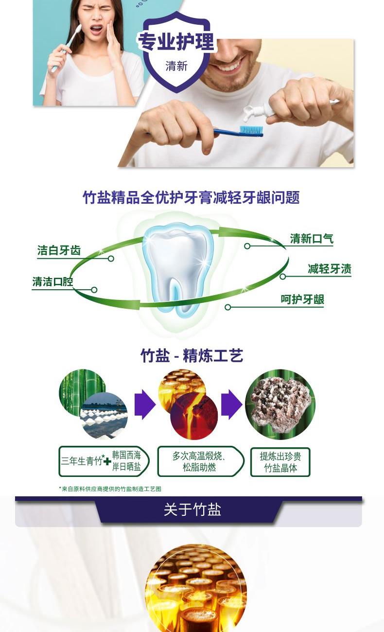 •精炼的护齿精华——竹盐成分,呵护牙龈、洁白牙齿、清洁口腔、清新口气、减轻牙渍; •具有护理牙齿和牙龈的良好作用,给口腔带来多方位的健康呵护; •特有含氟配方在牙齿表面形成坚固保护膜,预防锯齿; •天然竹盐成分含有丰富的矿物质,有助于温和呵护牙齿和牙龈; 牙刷:细软护龈软毛牙刷,加倍呵护牙龈,柔软纤细尖丝刷毛,减少对于牙齿敏感部位的刺激,加倍呵护牙龈。 适中软毛牙刷,清洁口腔,柔软波浪形刷毛设计,更加贴合牙龈线,深入清洁牙龈细缝的同时,多方位清洁口腔。 人体工程学彩色防滑刷柄设计,贴合手型设计,分散压力,避免损伤牙龈;同时独特的防滑胶体使用时手指与刷柄轻松固定,防止打滑