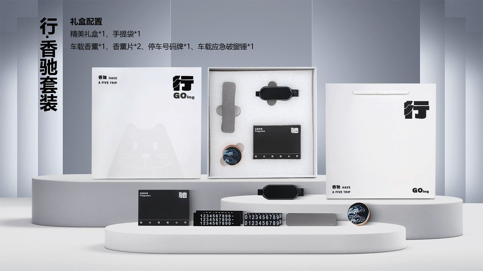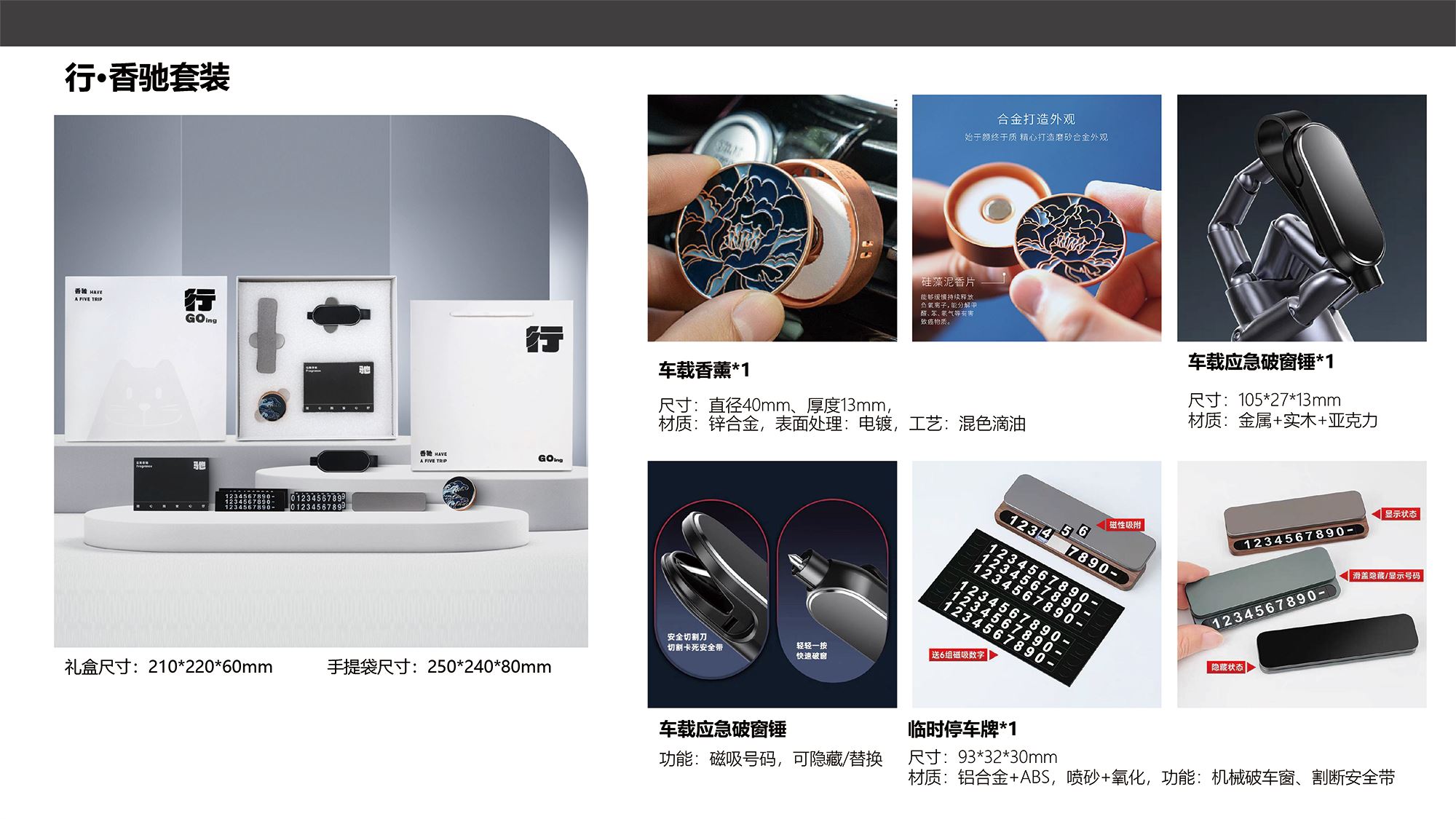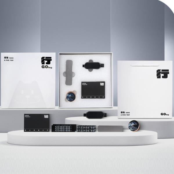 精美礼盒*1 手提袋*1 车载香薰*1 香薰片*2 停车号码牌*1 车载应急破窗锤*1