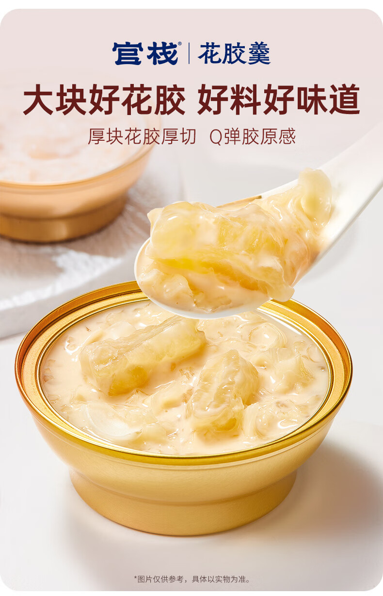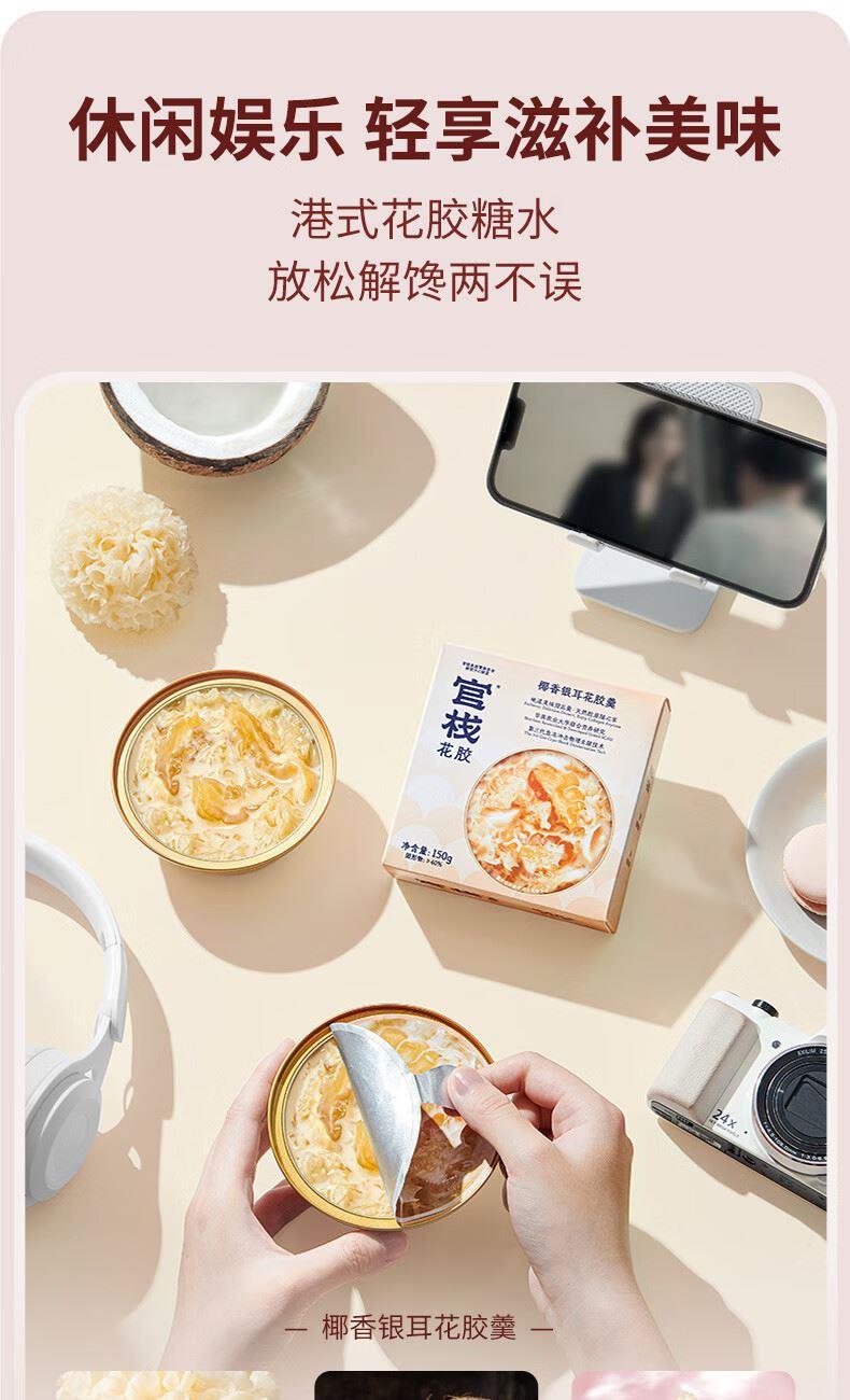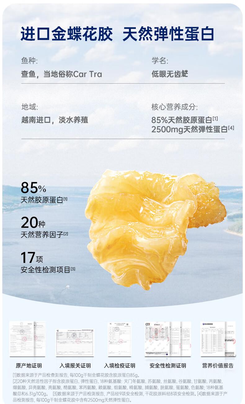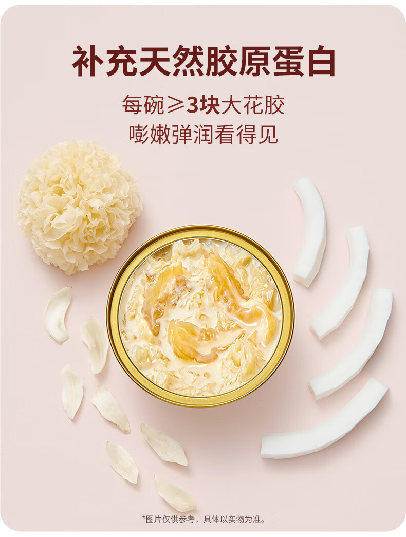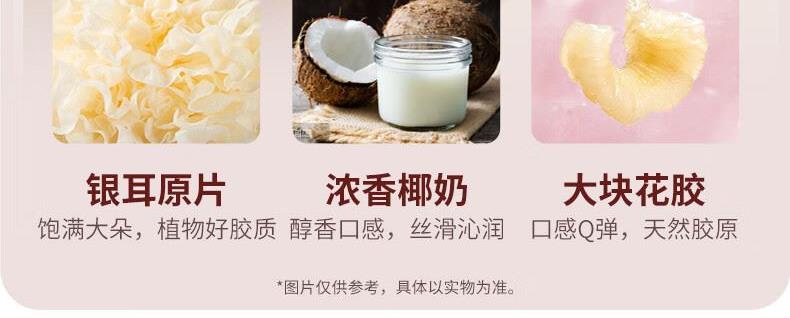 【天然透明质酸钠】胶原花胶含有100mg天然透明质酸钠。肌肤真皮层重要成分,天然保湿因子,水润嘭弹 【真材实料】进口查鱼白玉胶,大块厚花胶,胶多黏嘴。 【物理去腥】4D多维渗透去腥技术,好胶原更嘭润。 【滋补养生】花胶羹椰香银耳,清润解燥,补充真实天然胶原蛋白。 【精美礼盒】高性价比,送礼自用皆宜,美味又卫生。