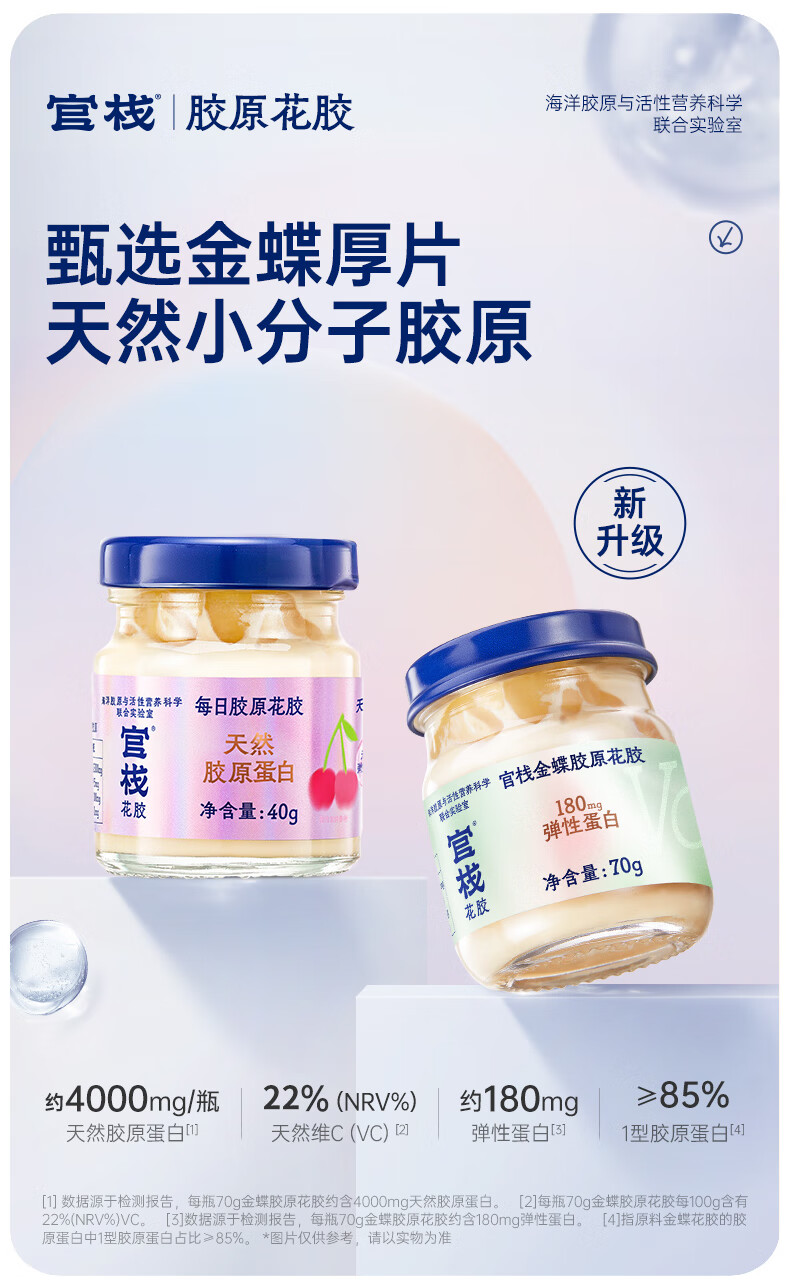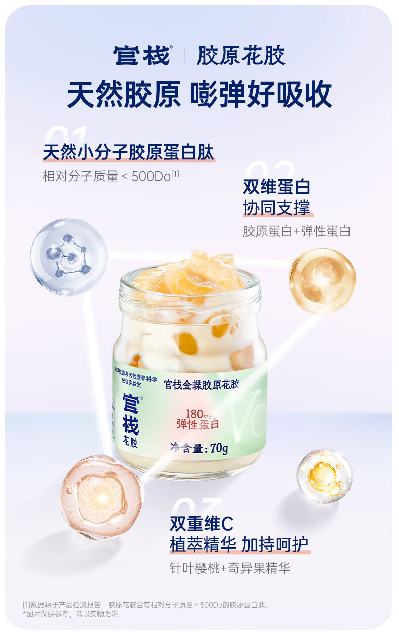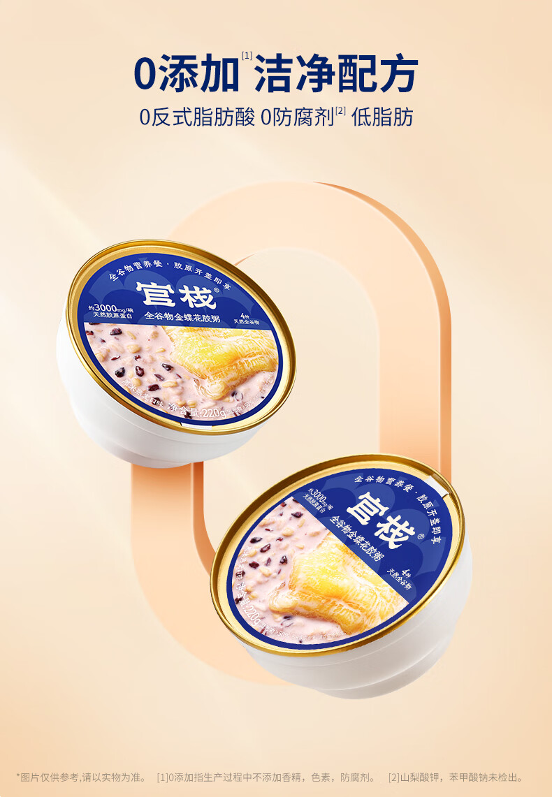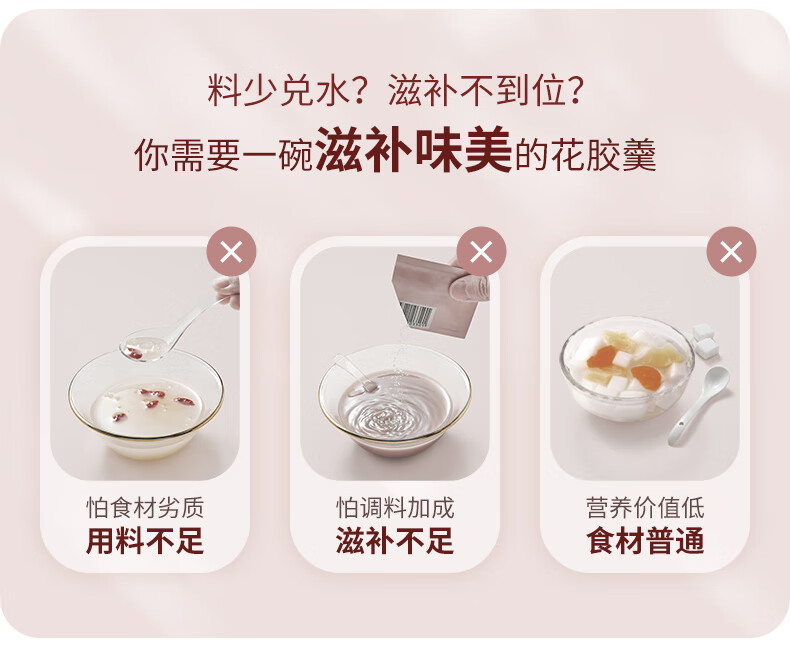 【天然透明质酸钠】胶原花胶含有100mg天然透明质酸钠。肌肤真皮层重要成分,天然保湿因子,水润嘭弹 【真材实料】进口查鱼白玉胶,大块厚花胶,胶多黏嘴。 【物理去腥】4D多维渗透去腥技术,好胶原更嘭润。 【滋补养生】花胶羹椰香银耳,清润解燥,补充真实天然胶原蛋白。 【精美礼盒】高性价比,送礼自用皆宜,美味又卫生。