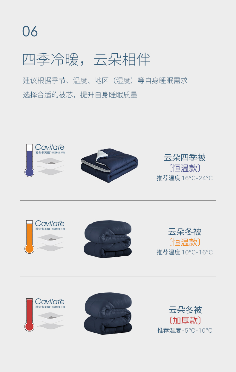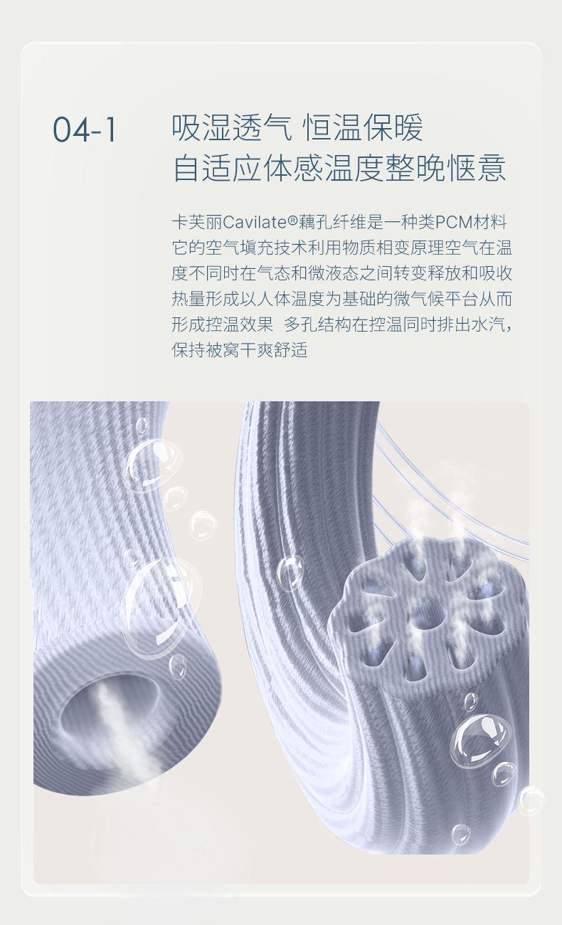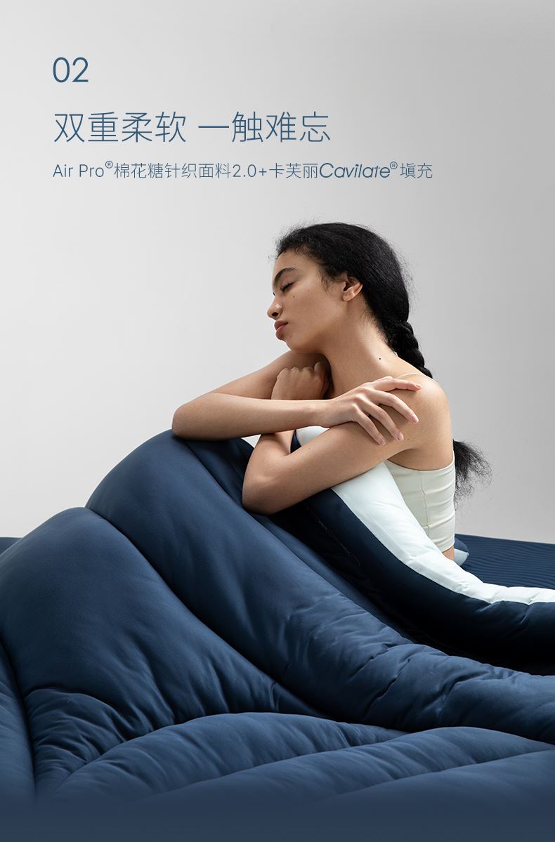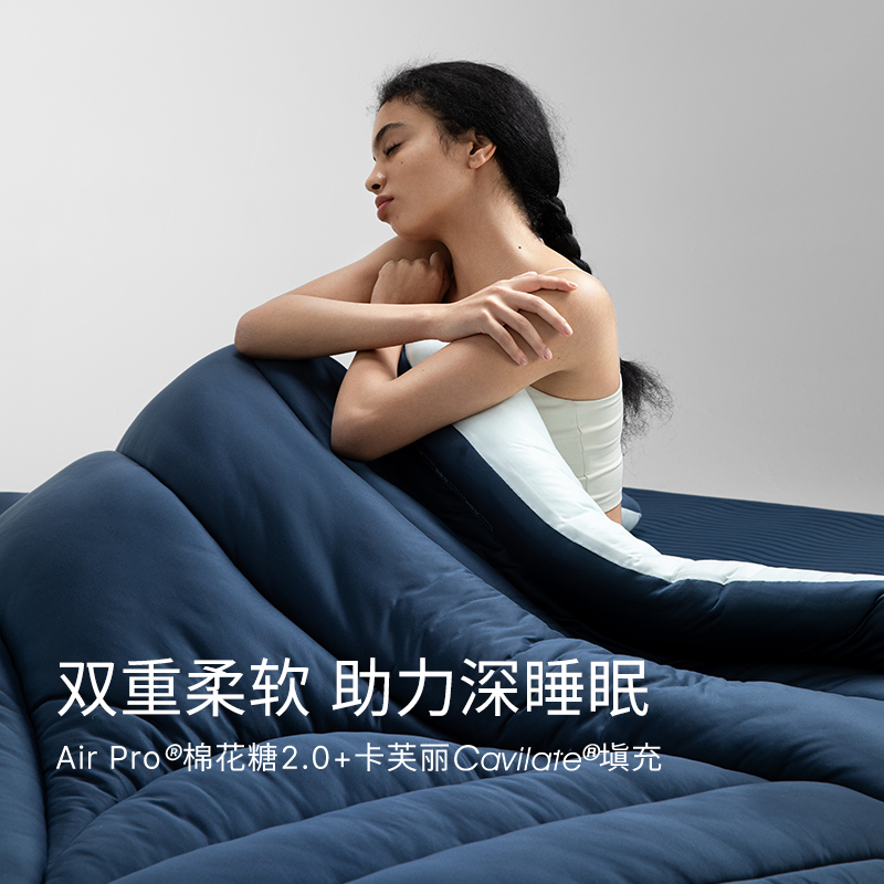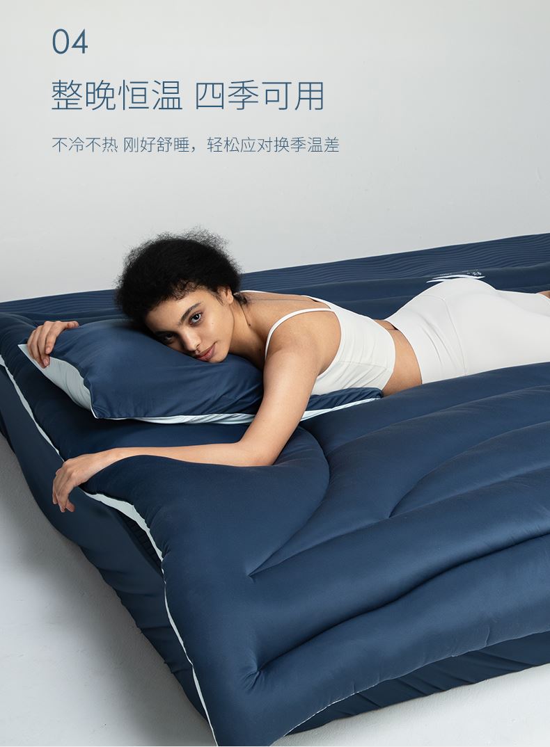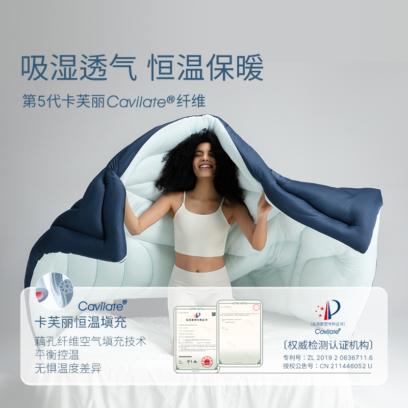 面料:聚酯纤维(50D超细纤维) 填充:聚酯纤维(Cavilat德国恒温纤维) 规格:200*230cm 填充克重:1250g 德系卡芙丽控温技术达到锁温效果,贴合不漏风,保持一个28°的恒温微睡眠气候 人体工学绗缝更贴合身体以及人体曲度和高度落差,起到良好的包裹作用,三边包裹人体 A类母婴级安全,0荧光剂,0甲醛,0芳香胺,贴肤裸睡更安全 比棉花更轻盈 比蚕丝更蓬松
