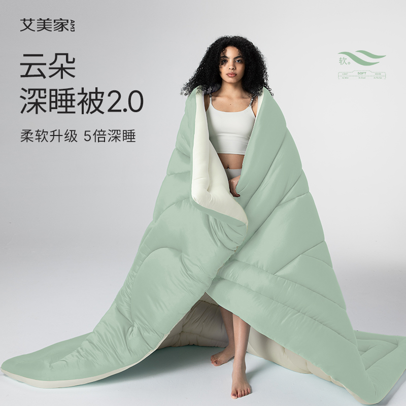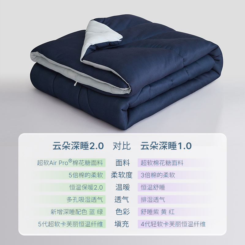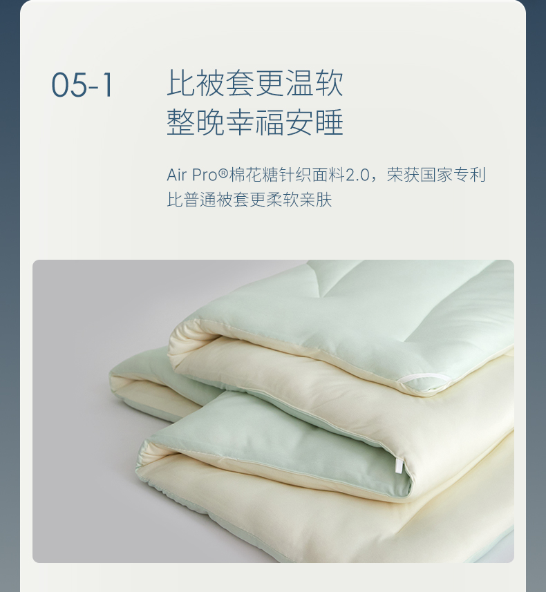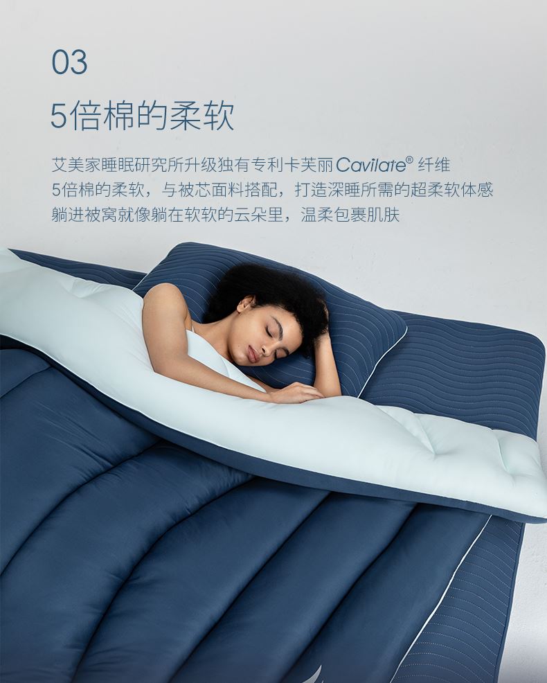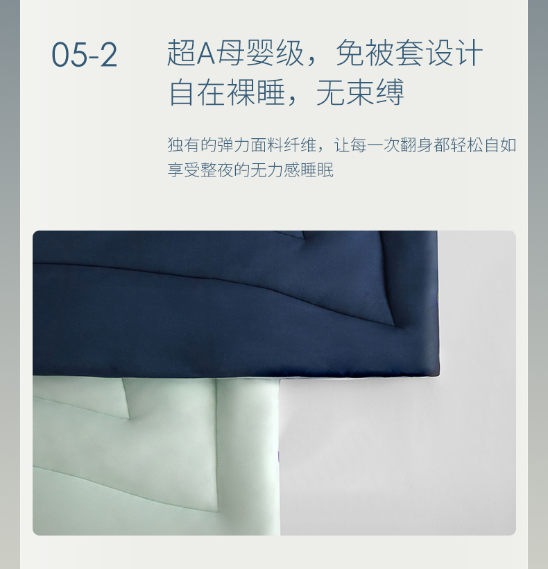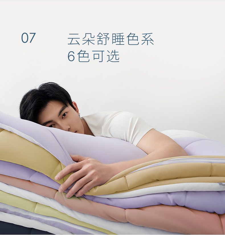 面料:聚酯纤维(50D超细纤维) 填充:聚酯纤维(Cavilat德国恒温纤维) 规格:200*230cm 填充克重:1250g 德系卡芙丽控温技术达到锁温效果,贴合不漏风,保持一个28°的恒温微睡眠气候 人体工学绗缝更贴合身体以及人体曲度和高度落差,起到良好的包裹作用,三边包裹人体 A类母婴级安全,0荧光剂,0甲醛,0芳香胺,贴肤裸睡更安全 比棉花更轻盈 比蚕丝更蓬松