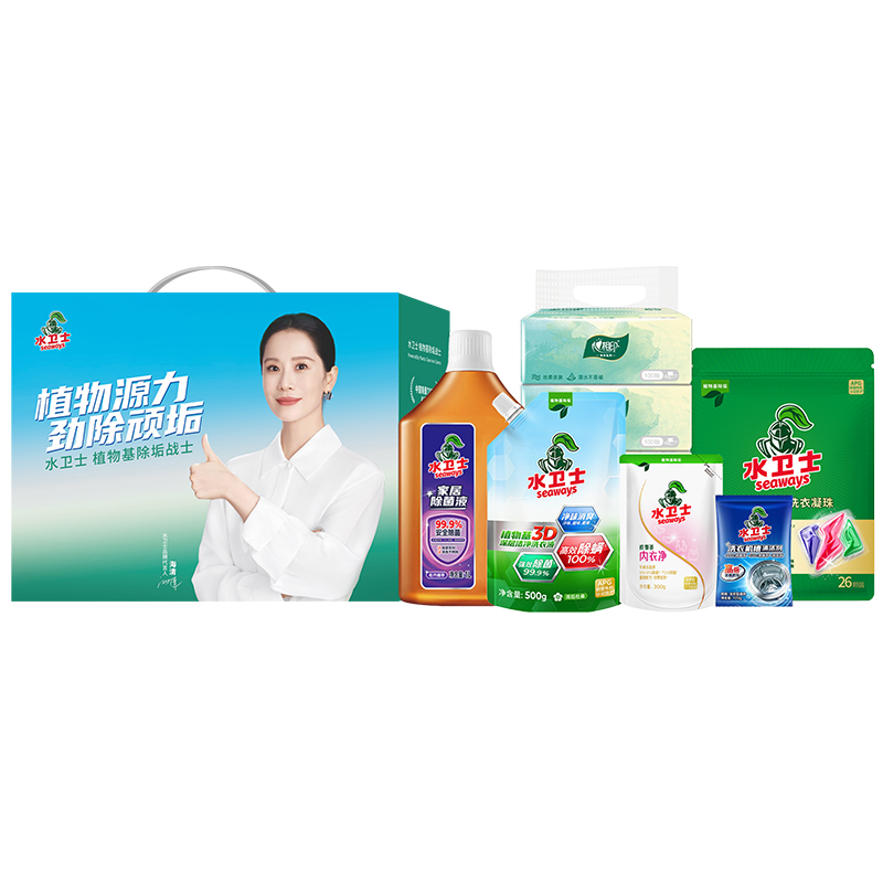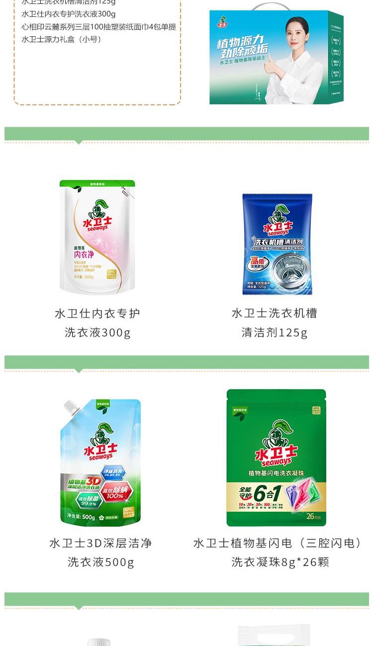 水卫士植物基闪电(三腔闪电)洗衣凝珠8g*26颗 水卫士3D深层洁净洗衣液500g 水卫士家清液1L 水卫士洗衣机槽清洁剂125g 水卫仕内衣专护洗衣液300g 心相印云麓系列三层100抽塑装纸面巾4包单提 水卫士源力礼盒(净含量2633g 小号)