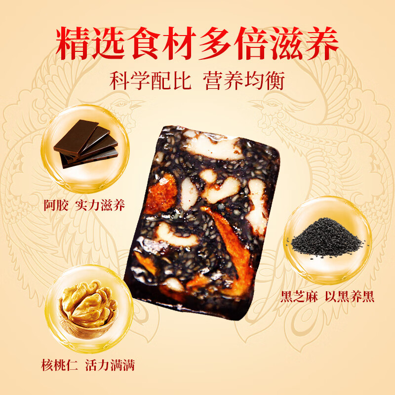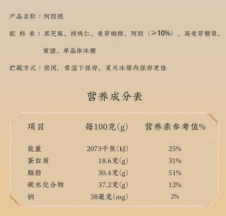 产品:阿胶糕 配 料 表:黑芝麻、核桃仁、麦芽糊精、阿胶(>10%)、高麦芽糖浆 黄酒、单晶体冰糖 贮藏方式:密闭,常温下保存。夏天冰箱内保存更佳