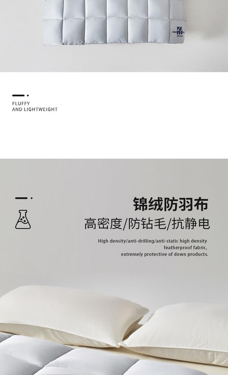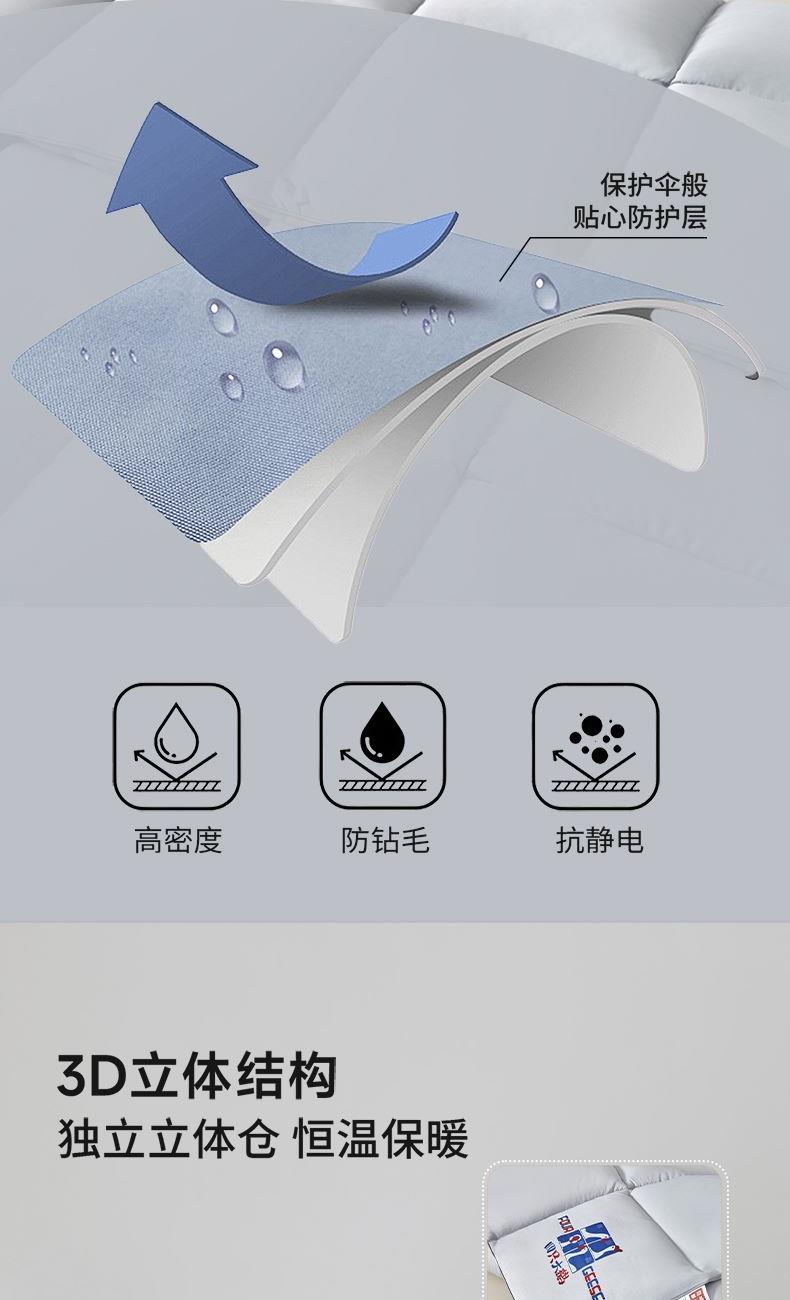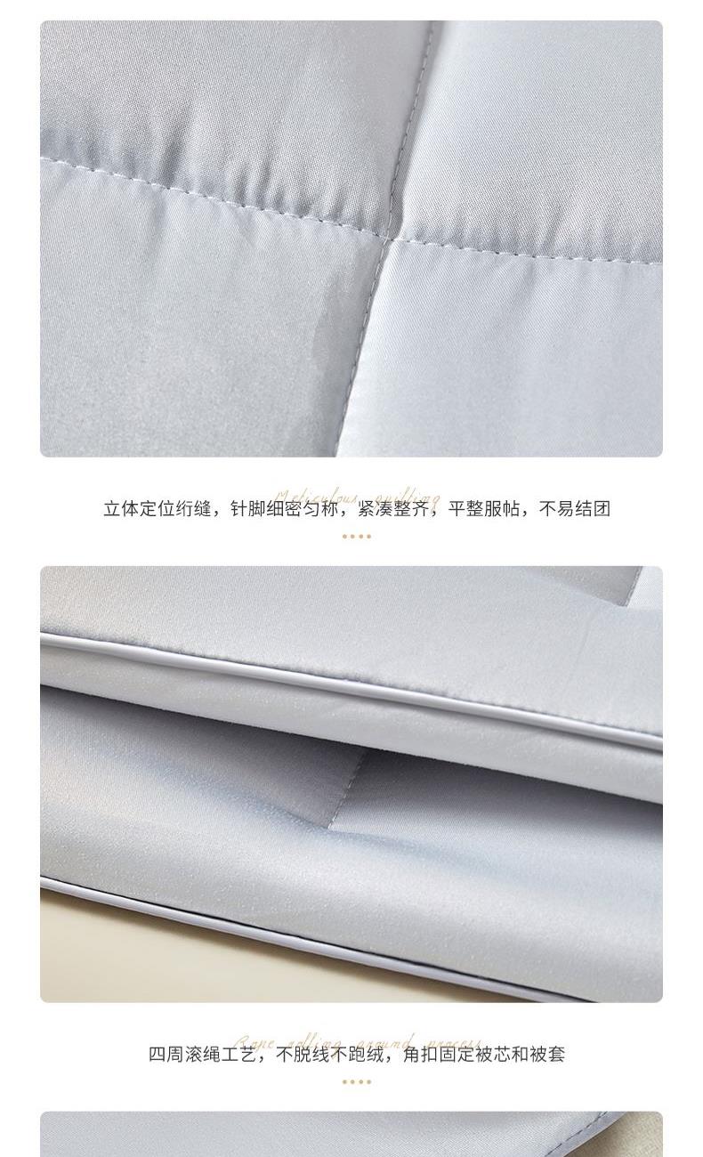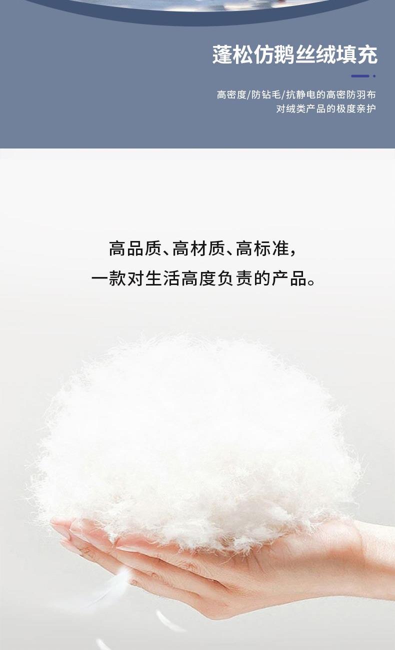规 格:200×230(±2)cm 克 重:2600g 面 料:锦绒防羽布 填 充:优质混纺鹅丝(1500g) 高密度/防钻毛/抗静电的高密锦绒防羽布,对绒类产品的极度亲护。 蓬松仿鹅丝绒填充,科学配比,聚暖保温,自然健康。 高品质、高材质、高标准,一款对生活高度负责的产品