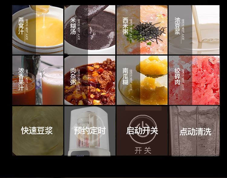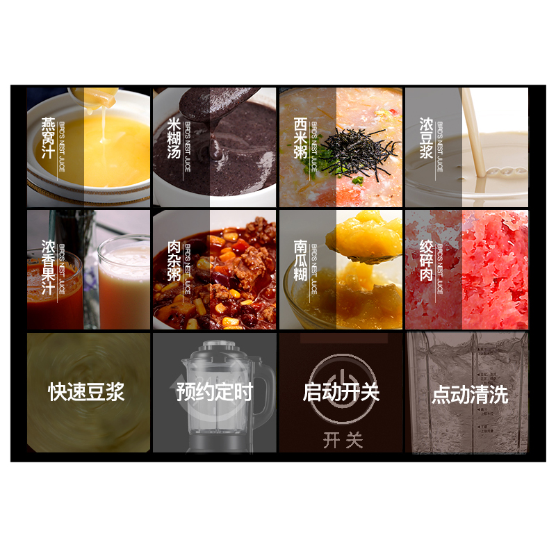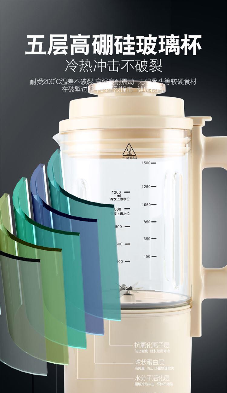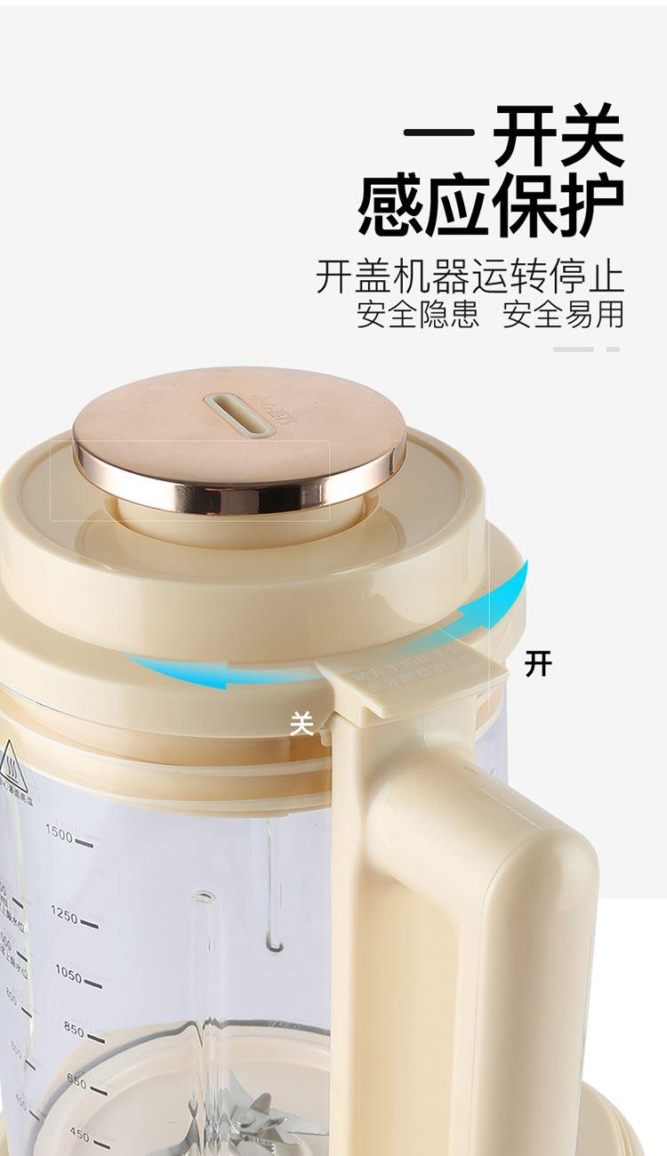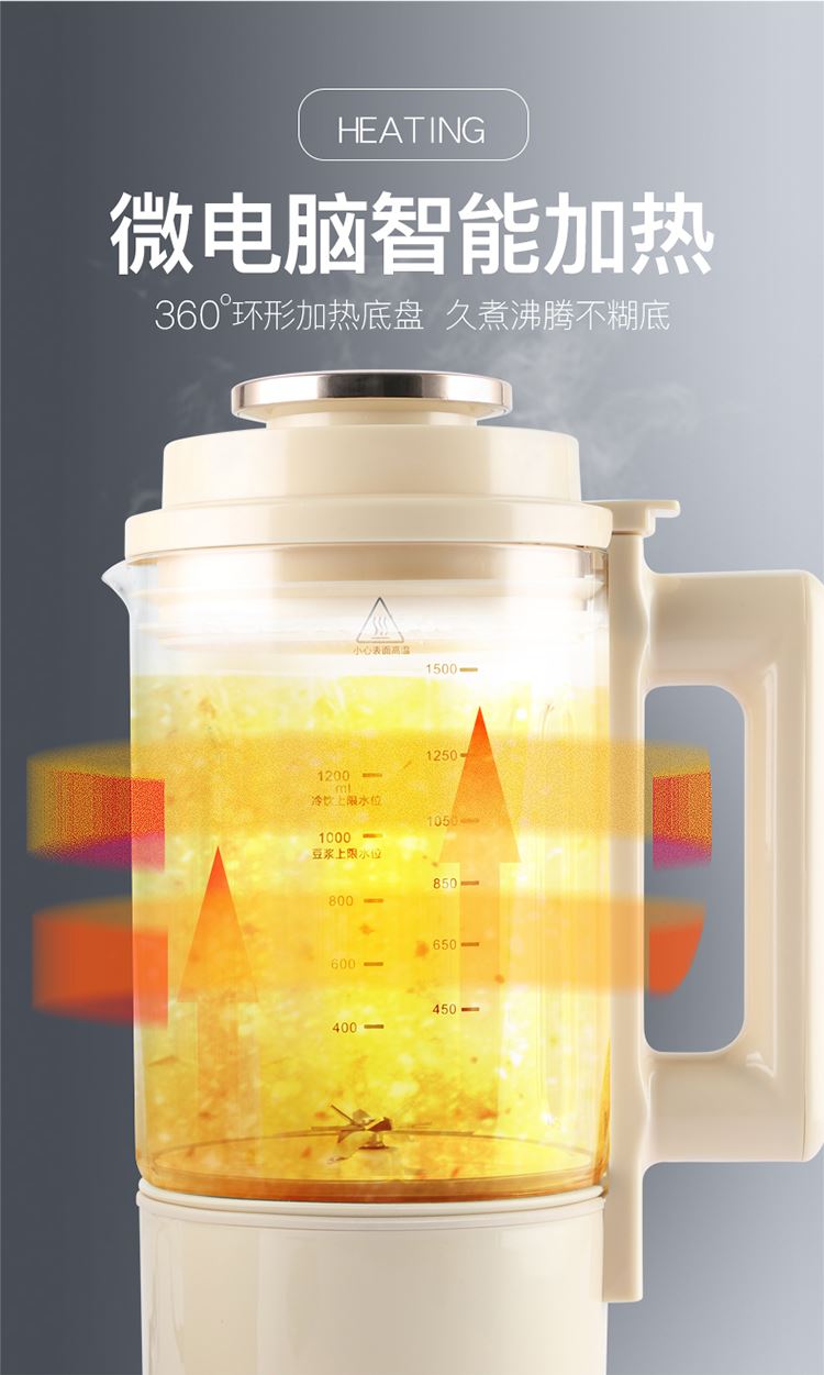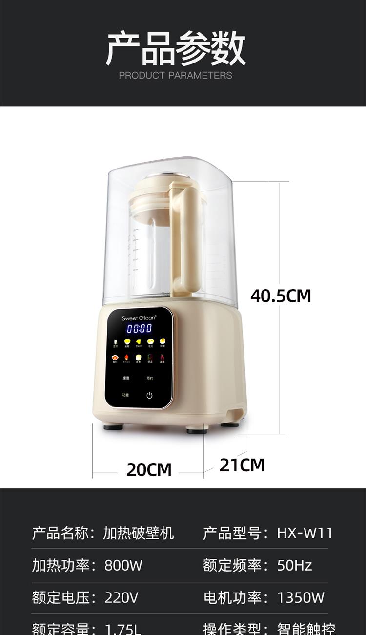 加热功率:800W 额定电压:220V 额定容量:1.75L 额定频率:50Hz 电机功率:1350W 操作类型:智能触控 双层消音降噪:专属消音盖设计,大幅降低跑气与工作噪音,安静料理不扰人 智能一键全自动:多功能面板 + 一键触控,操作简单,老人小孩都能轻松上手 微电脑控温:智能控温加热,食材熬煮更透彻,营养充分释放 360° 环形均匀加热:底盘环绕加热,久煮沸腾不糊底,口感更细腻香浓 食品级安全不锈钢:高速打磨工艺,食材接触更安心,健康无异味 高速破壁无渣细腻:强劲打磨,口感绵密无残渣,营养更好吸收 一键自清洁超省心:清洗无需手动刷洗,省时省力,告别繁琐清洁
