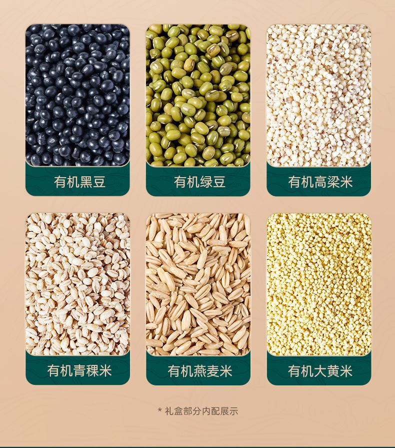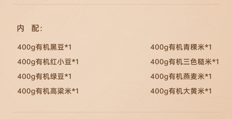 400g有机黑豆*1 400g有机红小豆*1 400g有机绿豆*1 400g有机高梁米*1 400g有机青稞米*1 400g有机三色糙米*1 400g有机燕麦米*1 400g有机大黄米*1