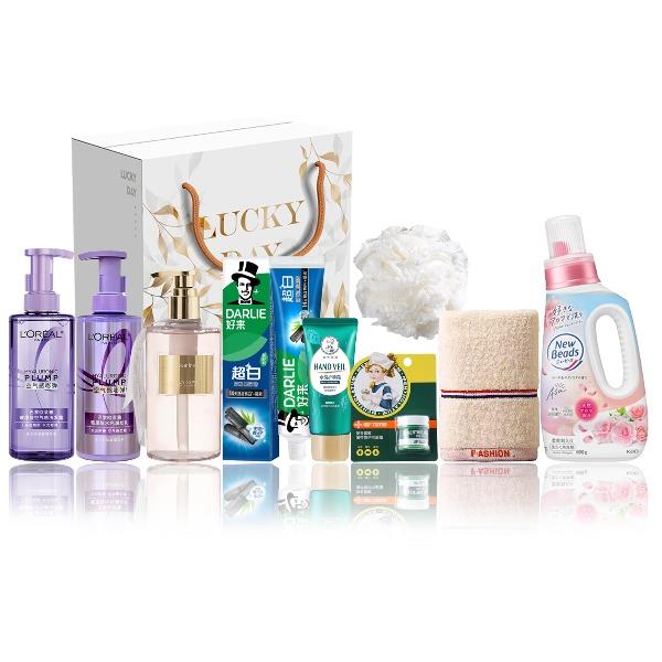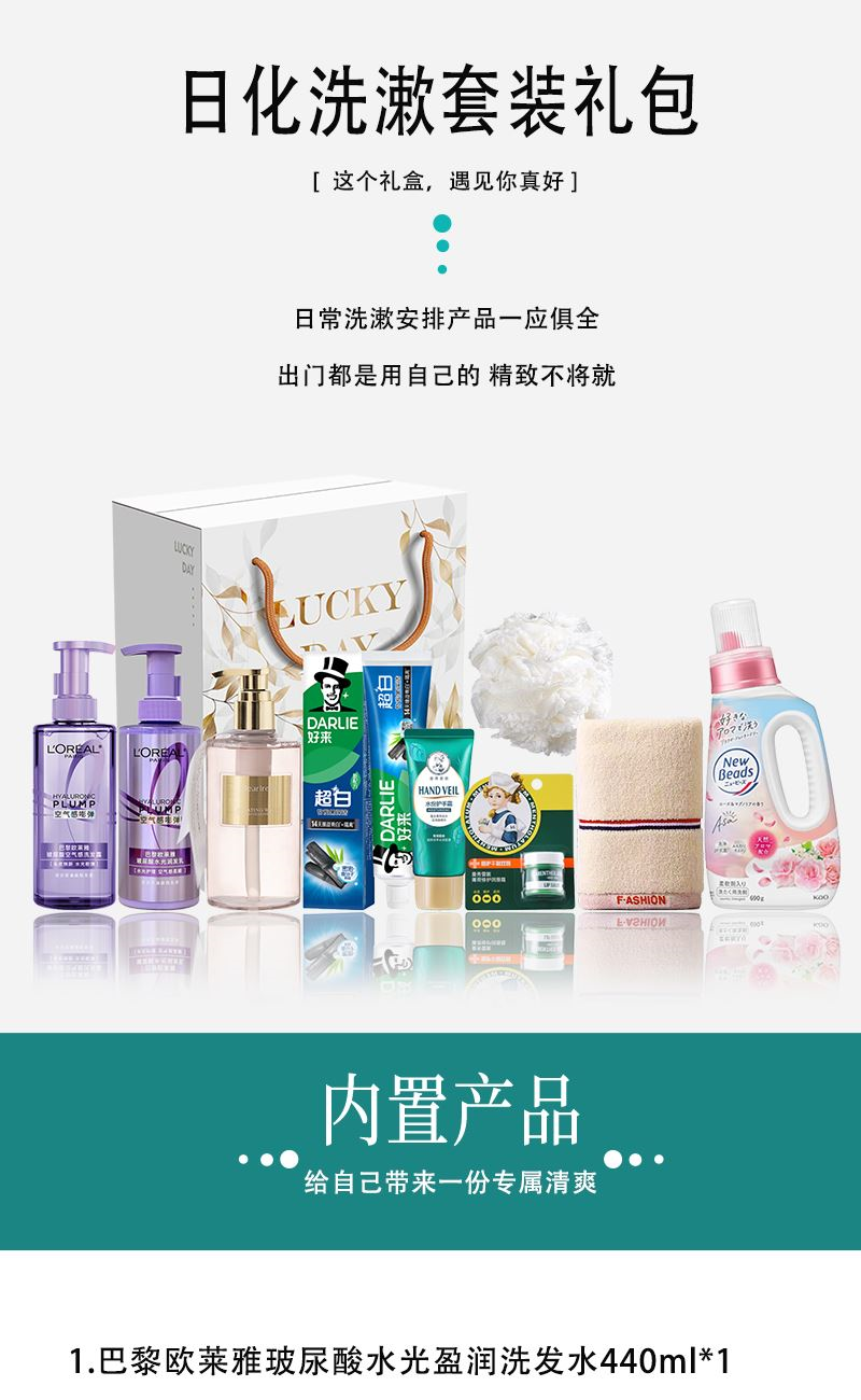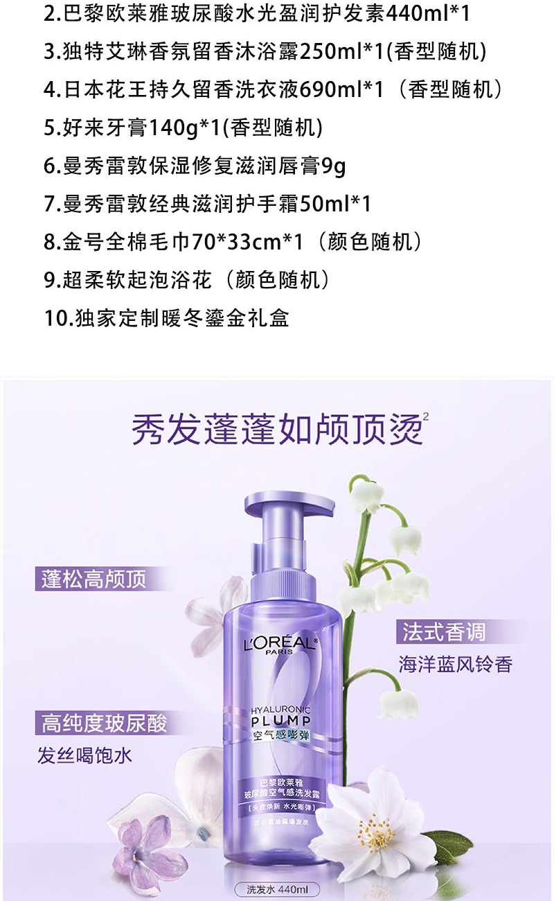 1.巴黎欧莱雅玻尿酸水光盈润洗发水440ml*1 2.巴黎欧莱雅玻尿酸水光盈润护发素440ml*1 3.独特艾琳香氛留香沐浴露250ml*1(香型随机) 4.日本花王持久留香洗衣液690ml*1(香型随机) 5.好来牙膏140g*1(香型随机) 6.曼秀雷敦保湿修复滋润唇膏9g 7.曼秀雷敦经典滋润护手霜50ml*1 8.金号全棉毛巾70*33cm*1(颜色随机) 9.超柔软起泡浴花(颜色随机) 10.暖冬鎏金礼盒 这套产品包括巴黎欧莱雅玻尿酸水光盈润洗发水和护发素、独特艾琳香氛留香沐浴露、日本花王持久留香洗衣液和好来牙膏等口碑爆款。此外,还有曼秀雷敦保湿修复滋润唇膏和金号全棉毛巾等高品质护肤沐浴用品,满足不同人群的需求。鎏金礼盒为礼品市场增添一抹亮色,成为送礼佳品。这套产品旨在为您带来全面而贴心的呵护,让美丽从心开始。