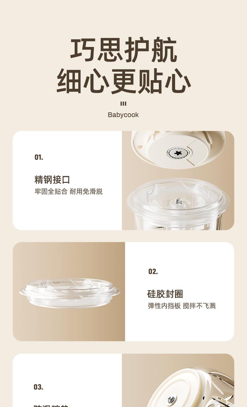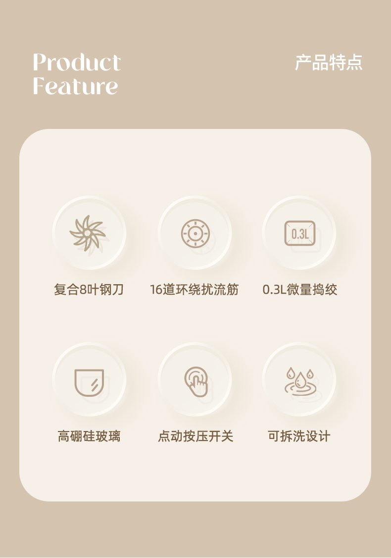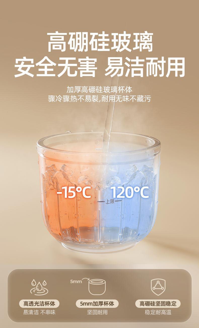 主要材质:PP+高硼硅+304 电压:220V 功率:200W 容量:300ml 1、小分量辅食,0、3L刚刚好 2、8叶刀片,锋利绞碎,无死角绞打 3、16条立体扰流筋,充分绞碎更细腻 4、高硼硅玻璃,食材有保障,高温消毒也不怕 5、底部防滑杯垫,稳固站立不易掉 6、下压式点动开关,操作简单方便。