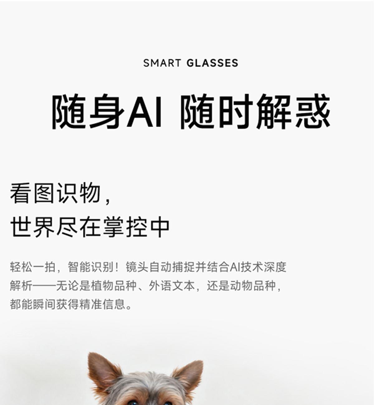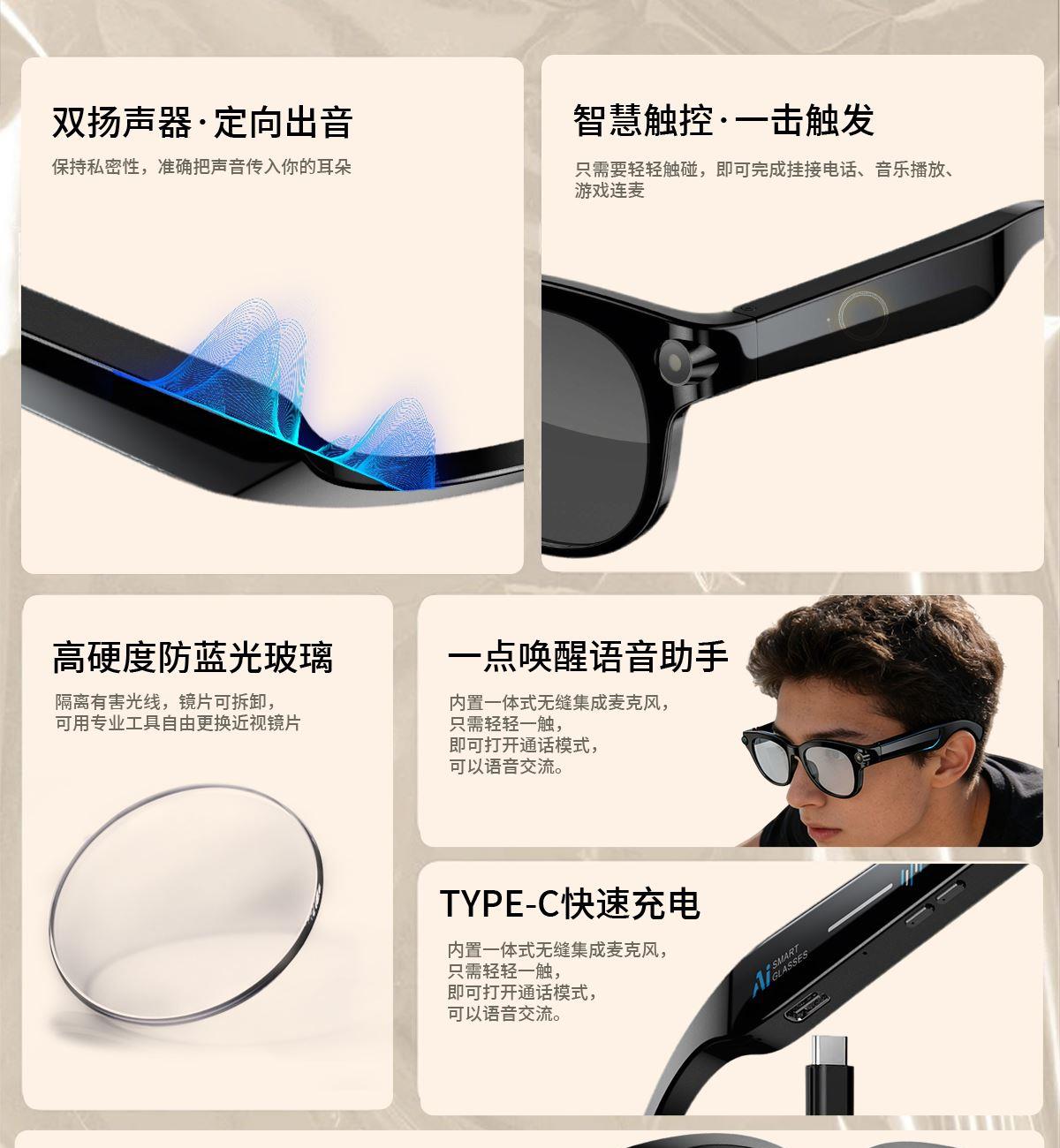 主控芯片:BK7258 内存:8MB+512MB(支持4G) 摄像头:200W APP:WheatAI 连接参数:BLE5.4+WIFI6( IEEE 802.11b/g/n/ax 1x1 标准/2.4GHz) 使用时间:常规使用15小时左右,待机2-5天(60%音量播放歌曲4小时) 充电方式:有线充充电,约1-1.5小时 电池容量:双145mAh,合计290mAh 智能眼镜尺寸(mm):镜腿160*镜框148*镜高54mm 产品材质:环保PC1414材质 眼镜重量:约39g 防水等级:生活防水 产品清单:眼镜+充电线+说明书+包装盒+手提袋 产品功能:AI语音助手/拍照/录视频/录音/音乐控制/蓝牙通话/提示音/指示灯/翻译/智视识物/触摸/可连接电脑图片视频传输/音乐播放/离线语音等;语音提醒语言(中文/英文); 手机APP语言:APP跟系统语言(阿拉伯语,保加利亚语、英语、日语、中文、西班牙语等) 翻译支持语言:中文、英语、德语、西班牙、法语、意大利、日语、韩语、葡萄牙语、俄语、瑞典语 AI支持语言:中文、英文、 日语、粤语、韩语、德语、法语、俄语、意大利语、西班牙语、印地语