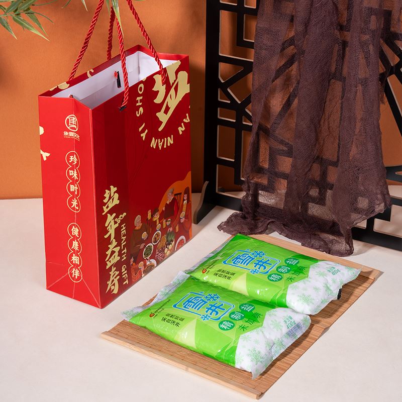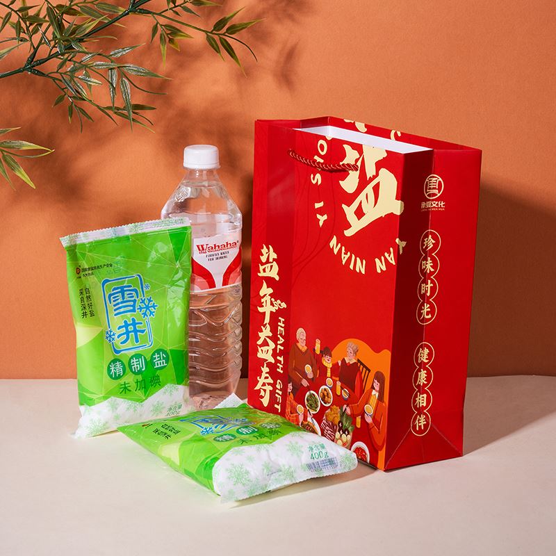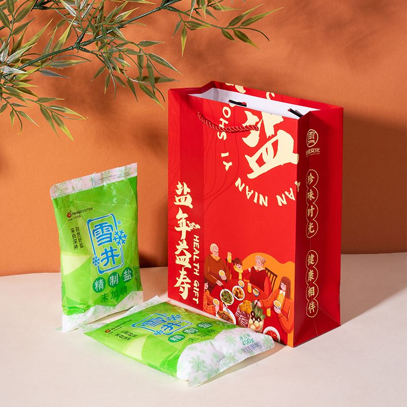 礼袋规格:250*200*80 mm 产品尺寸:180*115*20 mm 产品配置:久大自贡井盐400g*2袋(可自主增减数量) 产品尺寸:自贡雪井精制盐180-120mm 产品卖点: 1、人间至贵是健康,人间至味是食盐,自贡井盐,非物质文化遗产。 2、食盐作为必备的生活保障品,家家户户都需要! 3、日本核污水排放,海盐大面积污染,深井更健康。 4、以盐为礼,健康传情,让健康和关怀陪伴客户一日三餐。 5、两袋雪井盐搭配盐年益寿喜庆手提袋,传递祝福客户延年益寿的美好祝福。