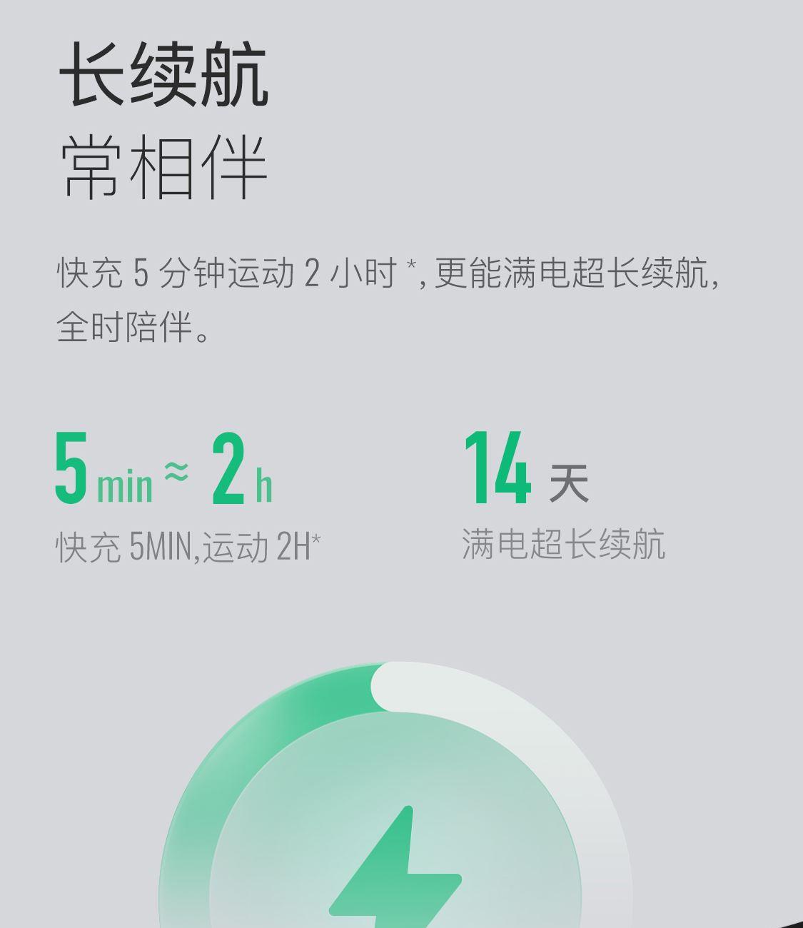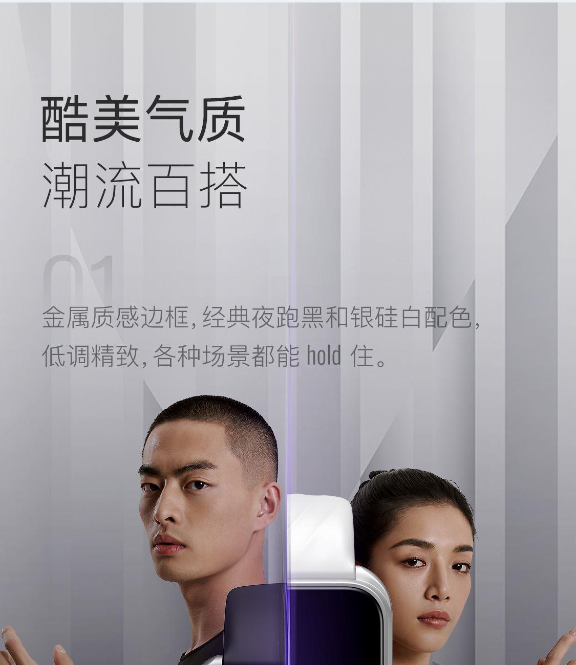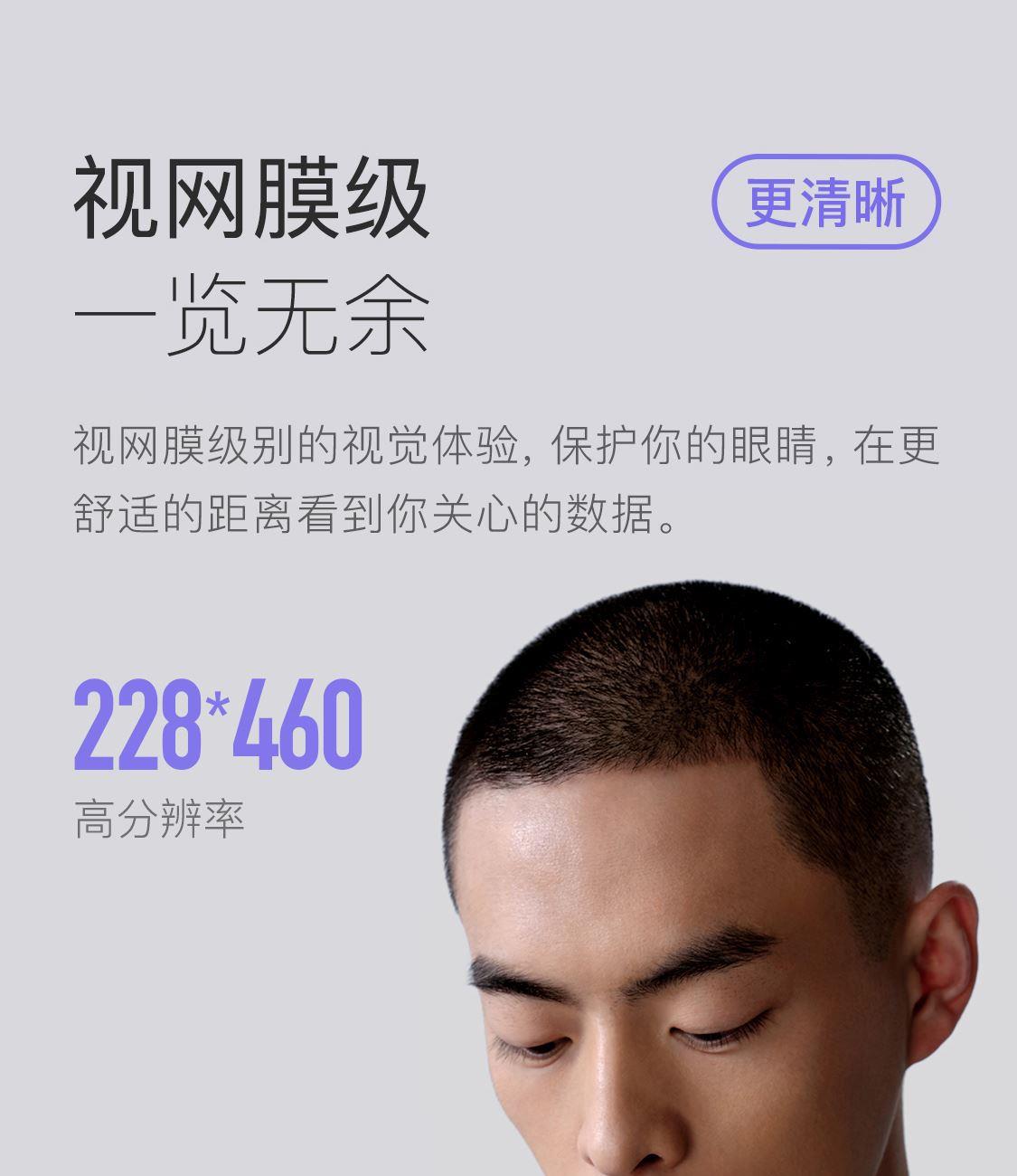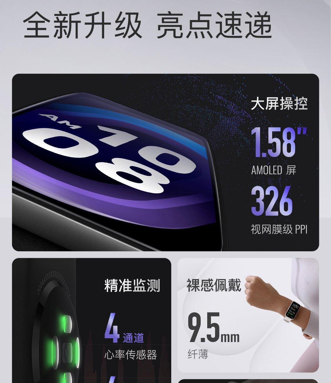 1.58"AMOLED 大屏 9.5mm纤薄天花板326视网膜级 PPI 心率实时监测 血氧监测 16000+官方课程互动 工作环境:0-45度 满电可续航:14天;