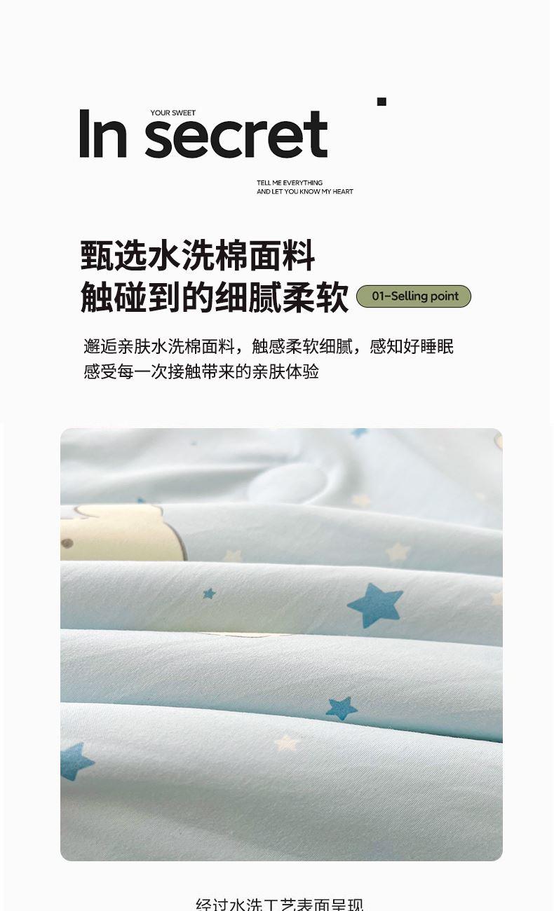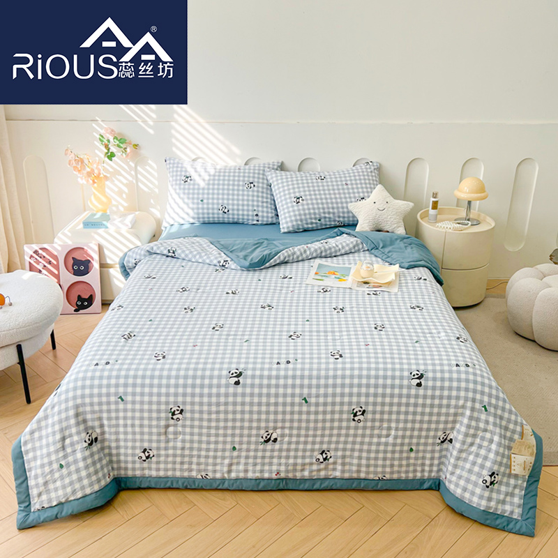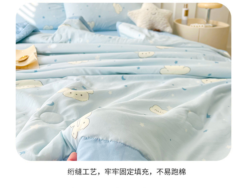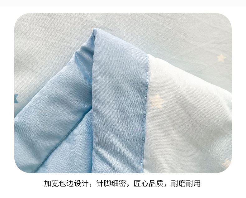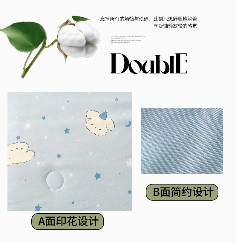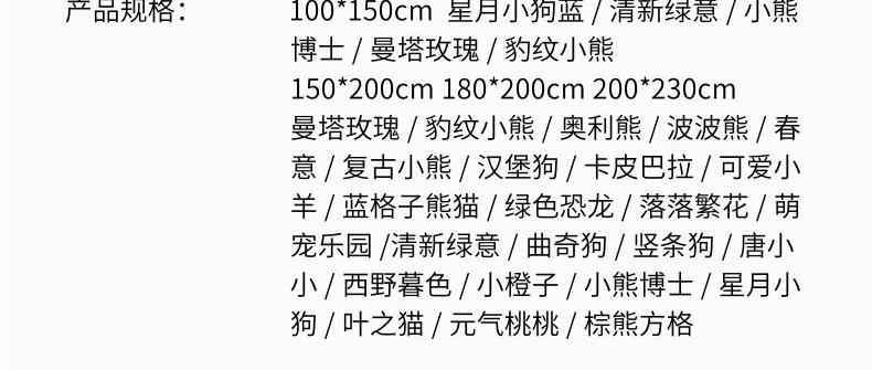 规 格:150*200cm 花 型:曼塔玫瑰、豹纹小熊、奥利熊、波波熊、春意、复古小熊、汉堡狗、卡皮巴拉、可爱小羊、蓝格子熊猫、绿色恐龙、落落繁花、萌宠乐园、清新绿意、曲奇狗 面 料:水洗棉/聚酯纤维 填充物:15%新疆棉花+85%聚酯纤维 面料采用A类标准亲肤水洗棉,经过水洗后的织物表面色调柔和,这种微皱面料具有不易变型不易褪色,免熨烫等优点。直接和肌肤亲密的接触 贴身亲肤不闷热,织造纱线手感更细腻,直接水洗机洗均可,新疆棉花科学配比填充,填充均匀不易变形,手感蓬松柔软,吸湿透气,A面清新印花B面简约设计, 元气耐看,层次感强。