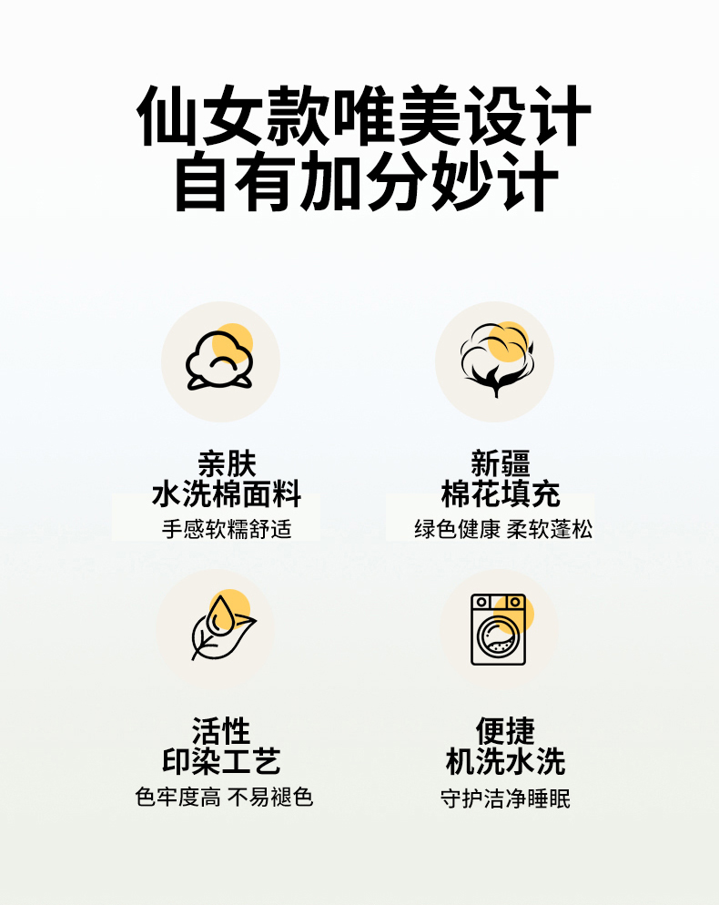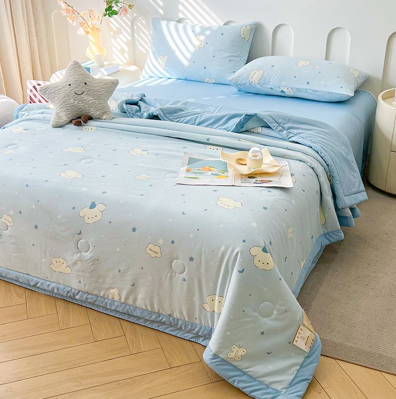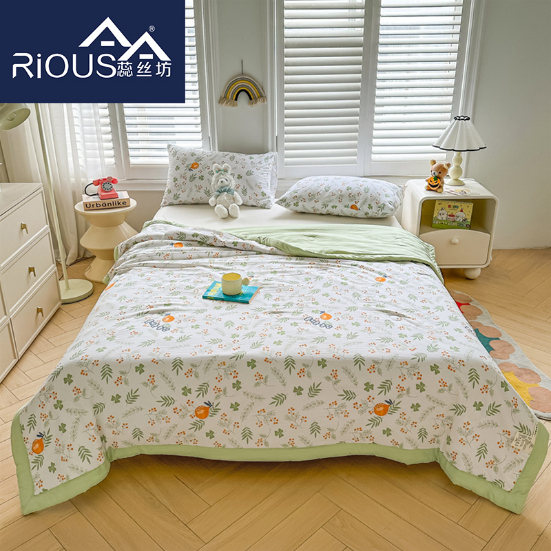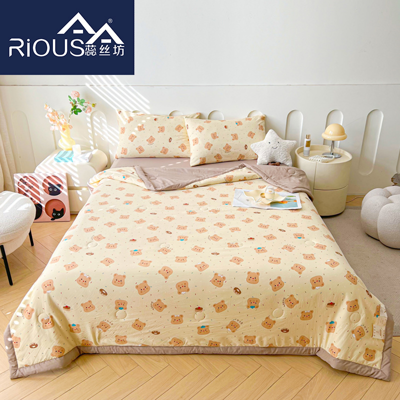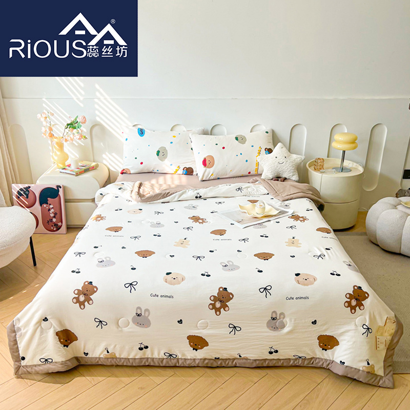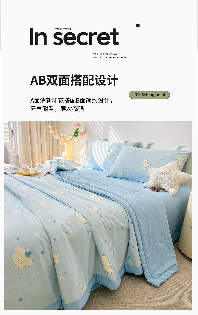 规 格:150*200cm 花 型:曼塔玫瑰、豹纹小熊、奥利熊、波波熊、春意、复古小熊、汉堡狗、卡皮巴拉、可爱小羊、蓝格子熊猫、绿色恐龙、落落繁花、萌宠乐园、清新绿意、曲奇狗 面 料:水洗棉/聚酯纤维 填充物:15%新疆棉花+85%聚酯纤维 面料采用A类标准亲肤水洗棉,经过水洗后的织物表面色调柔和,这种微皱面料具有不易变型不易褪色,免熨烫等优点。直接和肌肤亲密的接触 贴身亲肤不闷热,织造纱线手感更细腻,直接水洗机洗均可,新疆棉花科学配比填充,填充均匀不易变形,手感蓬松柔软,吸湿透气,A面清新印花B面简约设计, 元气耐看,层次感强。