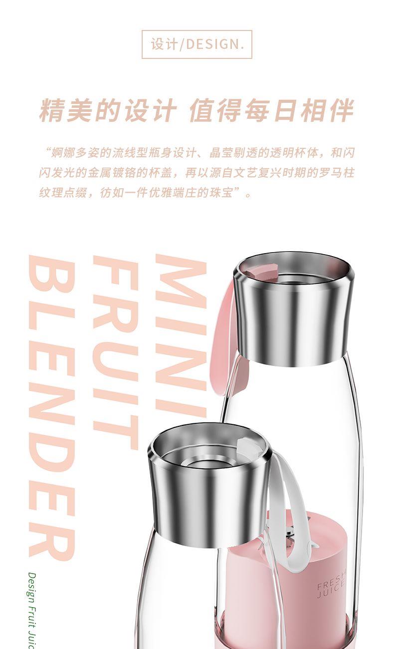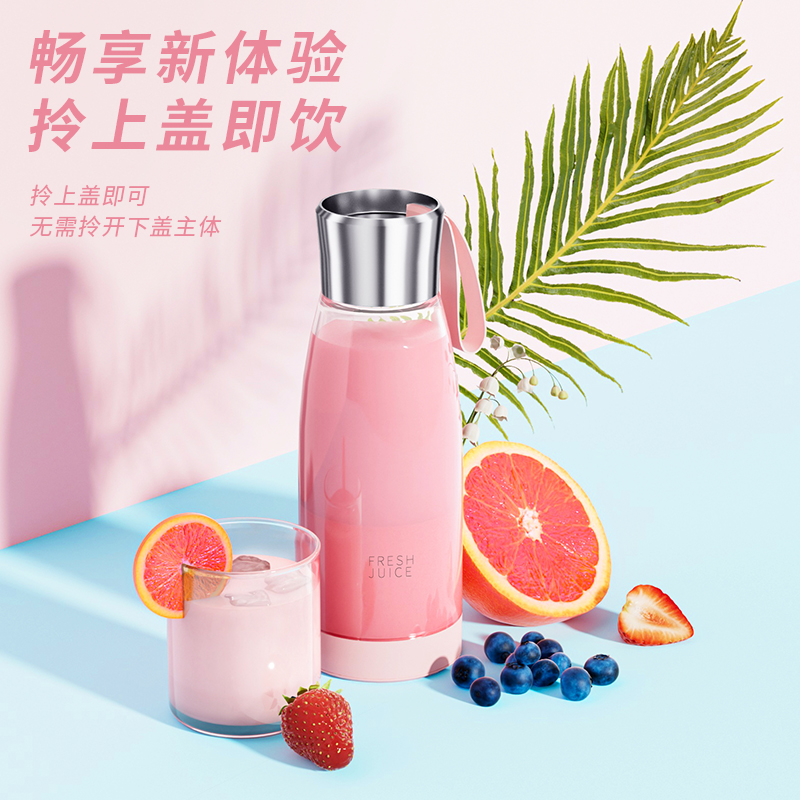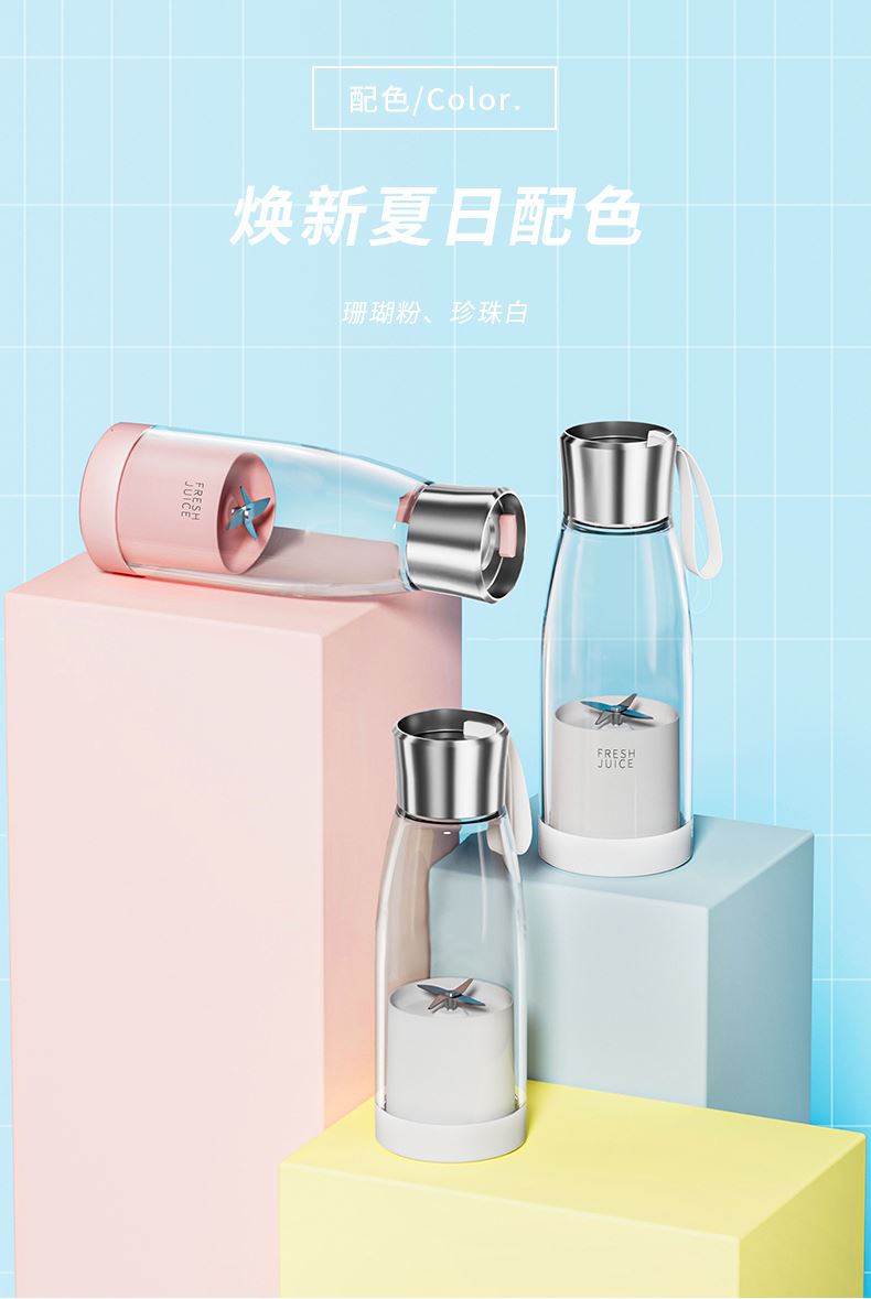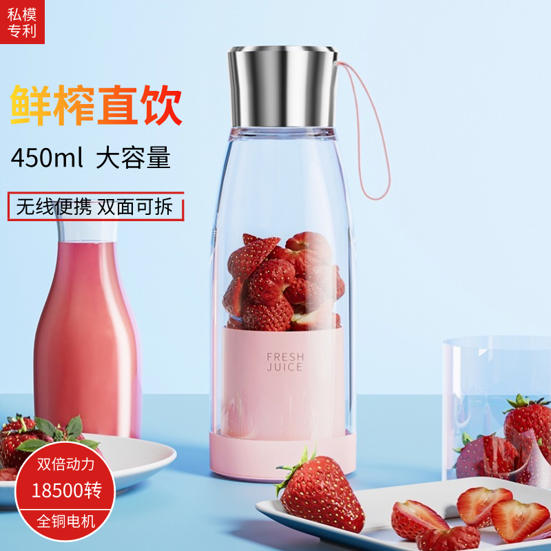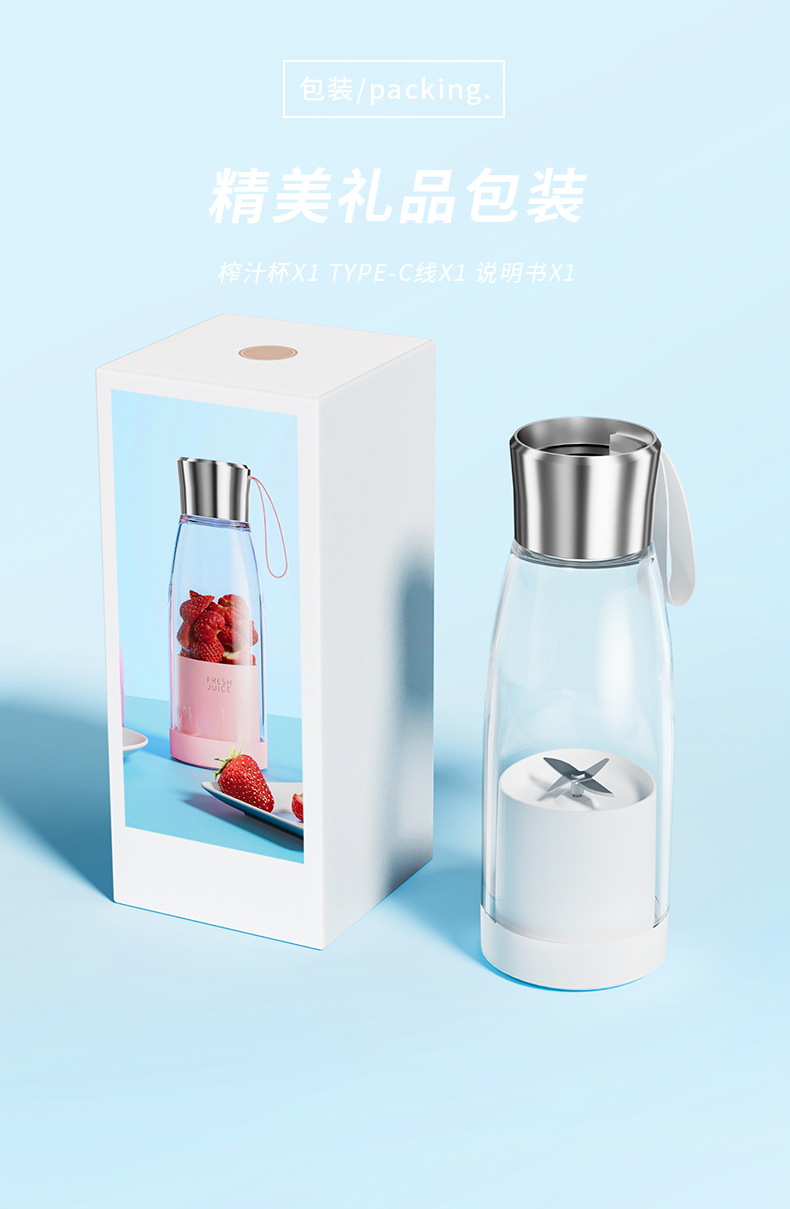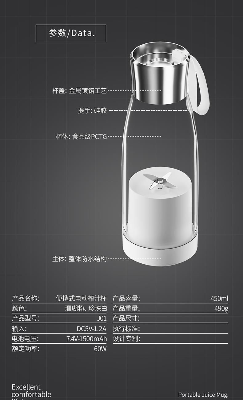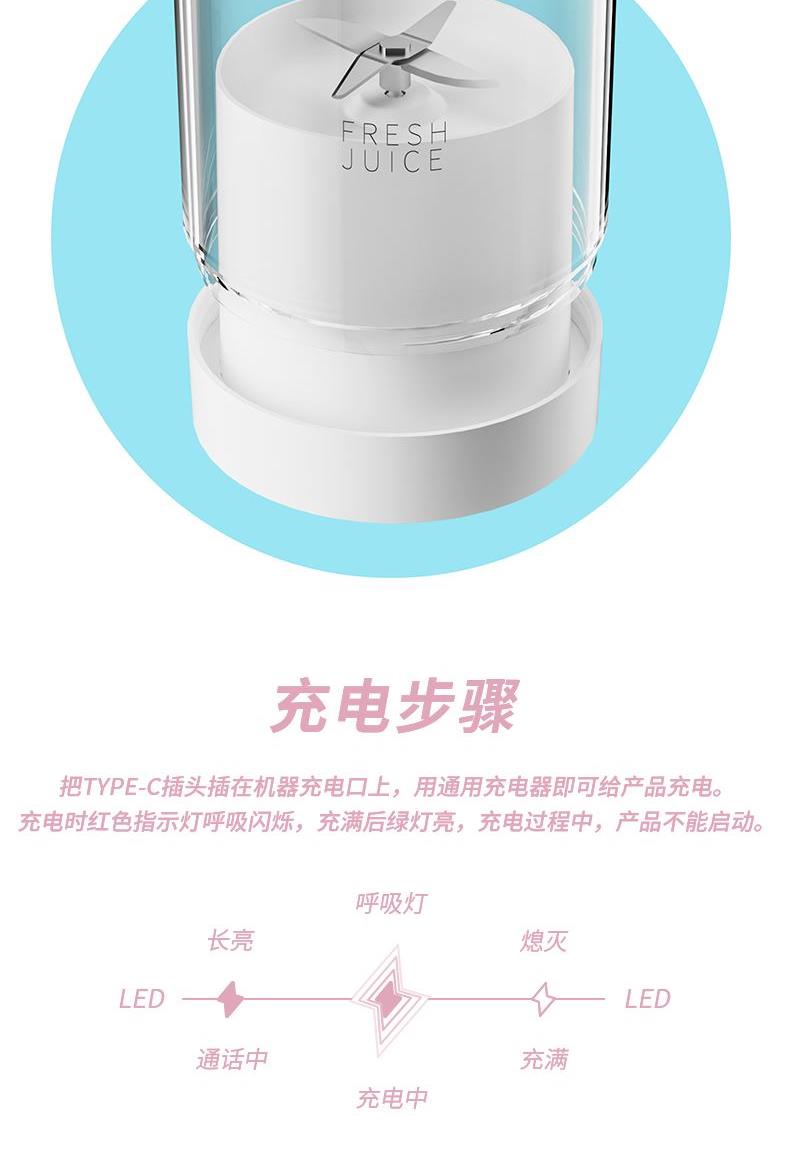产品功能: *450ML大容量、上下双面可拆洗 *1500mAh电池、充电便携电动榨汁 *全铜电机、双倍动力18500转、四叶刀片 * 支持小批量定制LOGO 产品参数: *材质:塑胶+ABS+电子元件 *产品重量:518g/620g *产品尺寸:240*84*84mm *包装盒尺寸:262*99*99mm *外箱尺寸:515*412*280mm *整箱重量:13.5KG *颜色:白色、粉色 *标配:主机*1、充电线*1、说明书*1