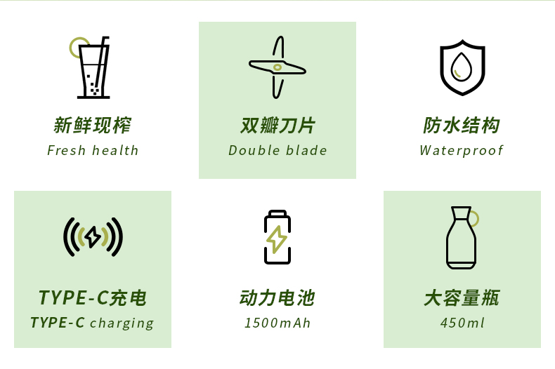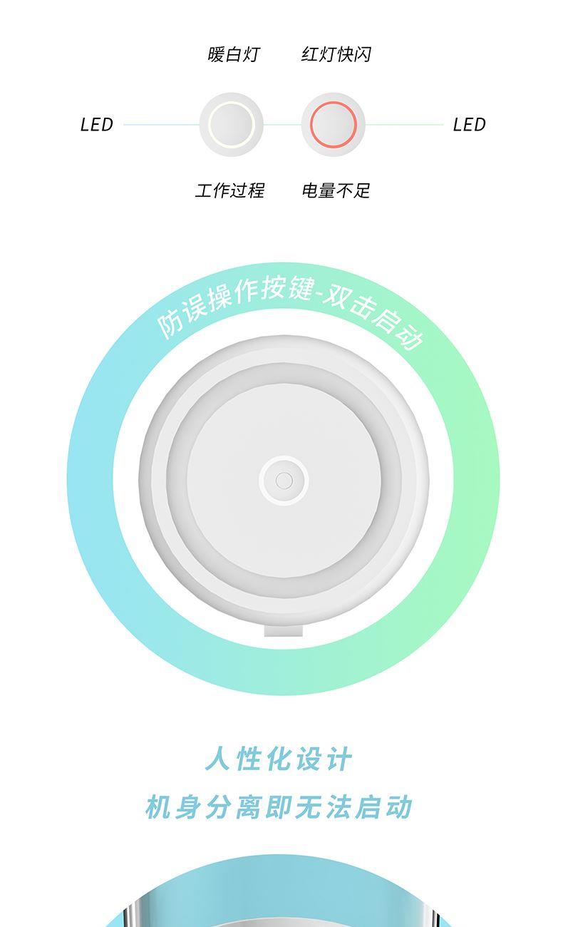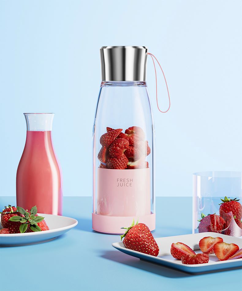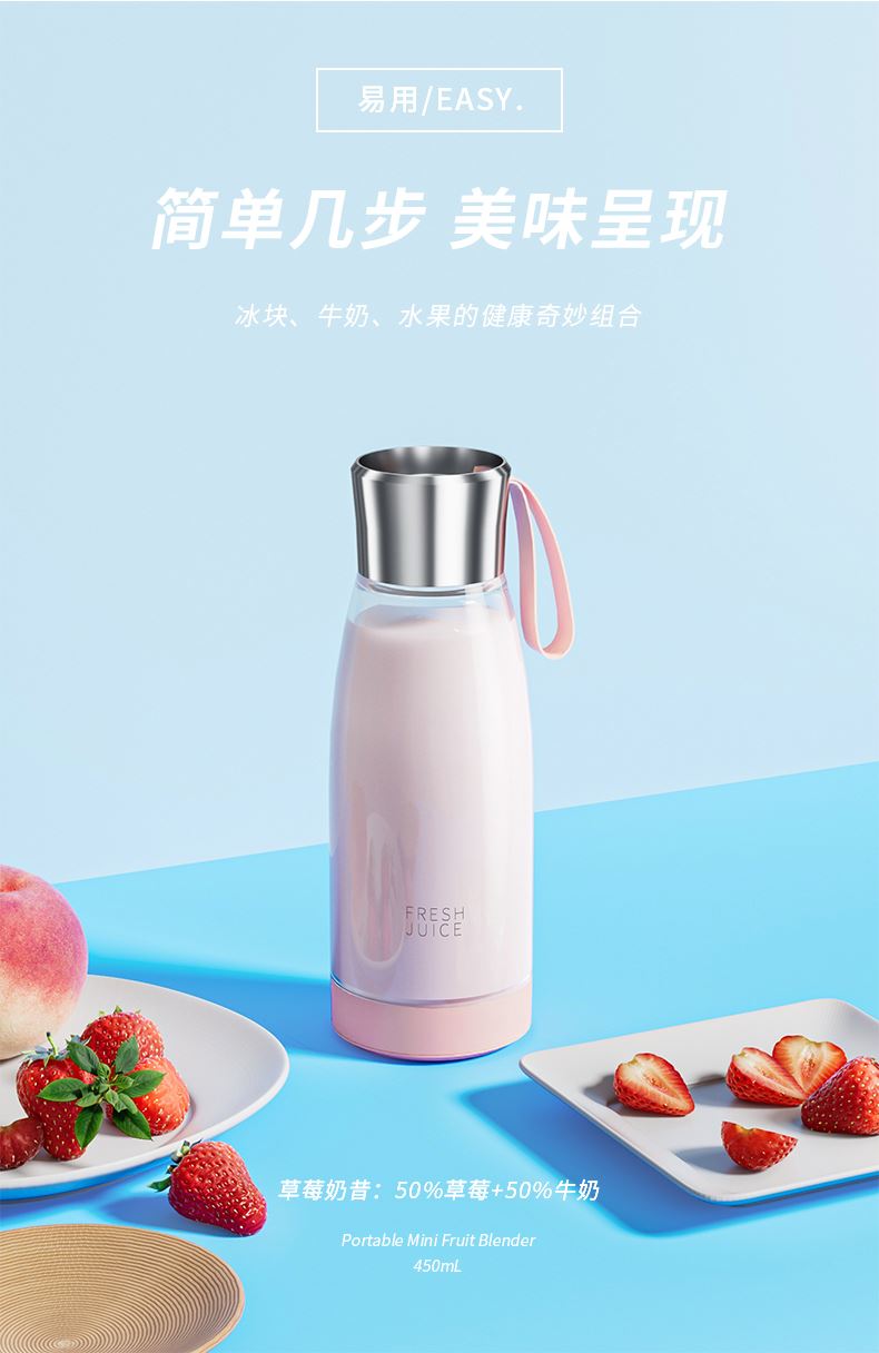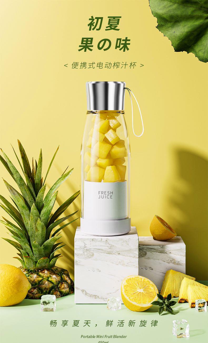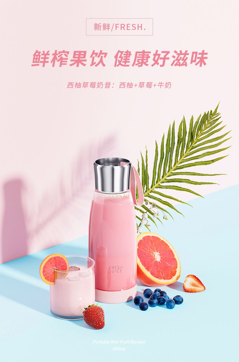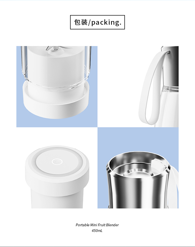 产品功能: *450ML大容量、上下双面可拆洗 *1500mAh电池、充电便携电动榨汁 *全铜电机、双倍动力18500转、四叶刀片 * 支持小批量定制LOGO 产品参数: *材质:塑胶+ABS+电子元件 *产品重量:518g/620g *产品尺寸:240*84*84mm *包装盒尺寸:262*99*99mm *外箱尺寸:515*412*280mm *整箱重量:13.5KG *颜色:白色、粉色 *标配:主机*1、充电线*1、说明书*1