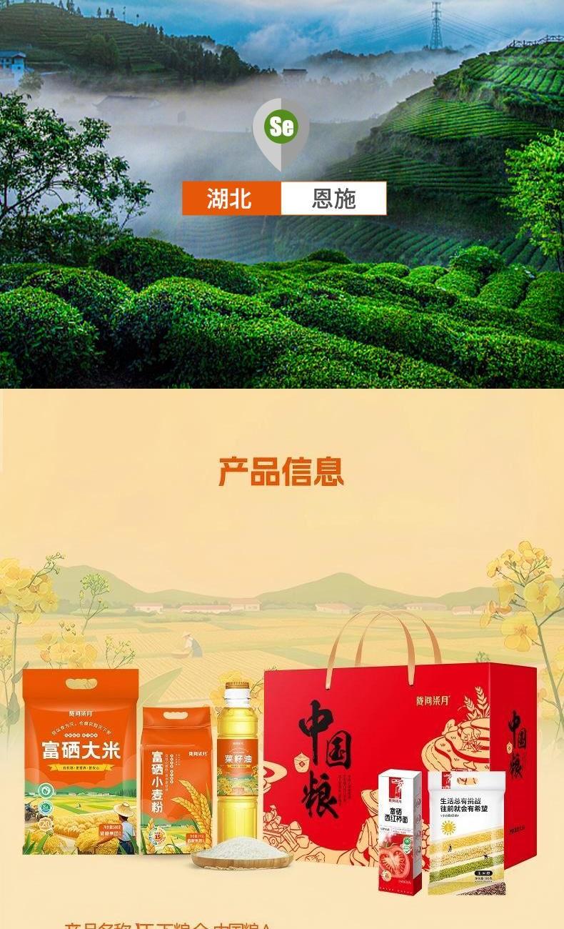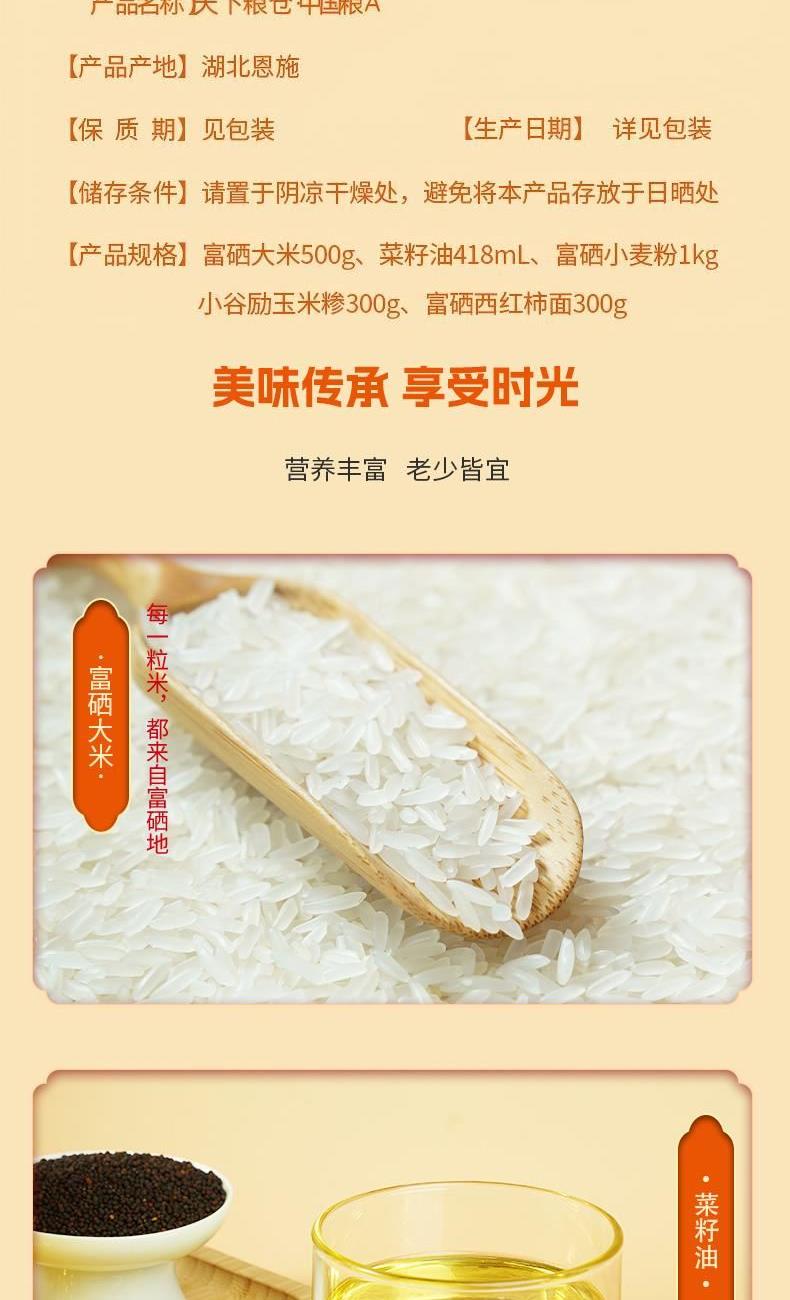 产品信息 品 名:天下粮仓·中国粮A 规 格:富硒大米500g、菜籽油248mL,富硒小麦粉1kg,小谷励玉米糁300g,富硒西红柿挂面300g 包 装:长39cm宽13cm高27cm 产品特色 1、富有机硒认证,每100g平均硒含量≥20ug。 2、菜籽油油品透亮、香味浓郁,含有丰富的维生素E以及油酸、亚油酸、亚麻酸等;3、富硒西红柿面爽口细腻,入口顺滑,富硒小麦粉细腻劲道。 4、玉米糁金黄香糯,易消化 5、精美礼盒,送礼佳品。