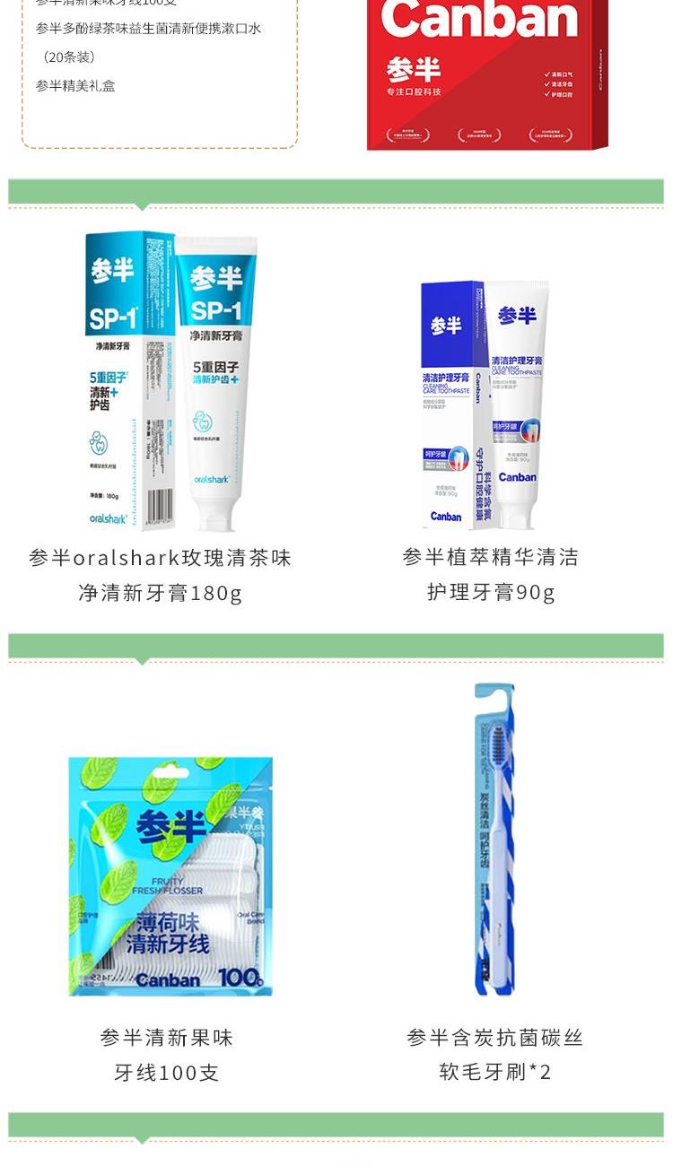 参半oralshark玫瑰清茶味净清新牙膏180g 参半植萃精华清洁护理牙膏90g 参半含炭碳丝软毛牙刷 参半含炭碳丝软毛牙刷 参半清新果味牙线100支 参半多酚绿茶味益生菌清新便携漱口水(20条装) 思珀莱精美礼盒