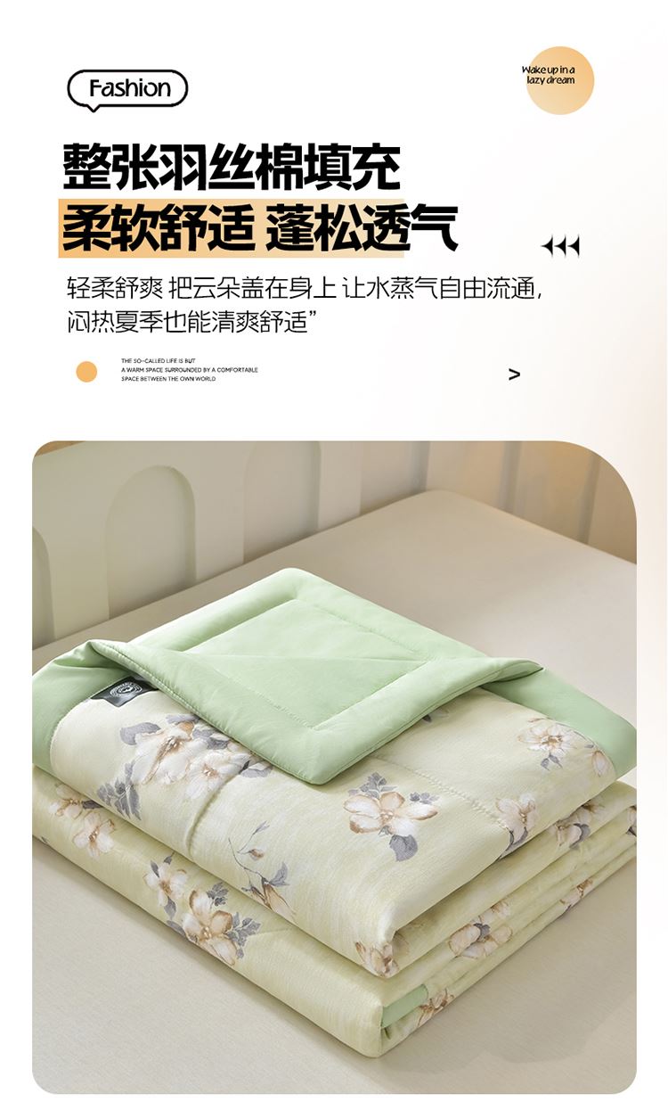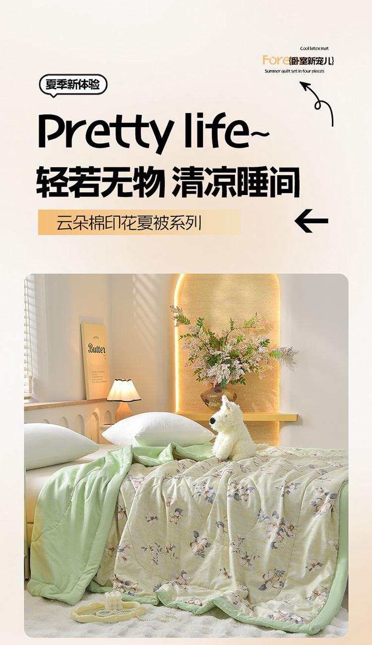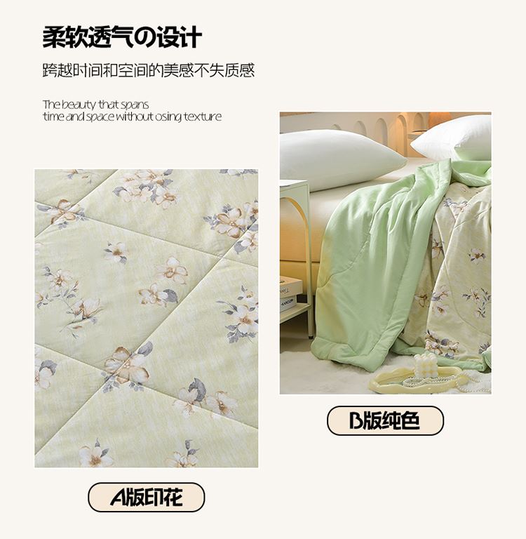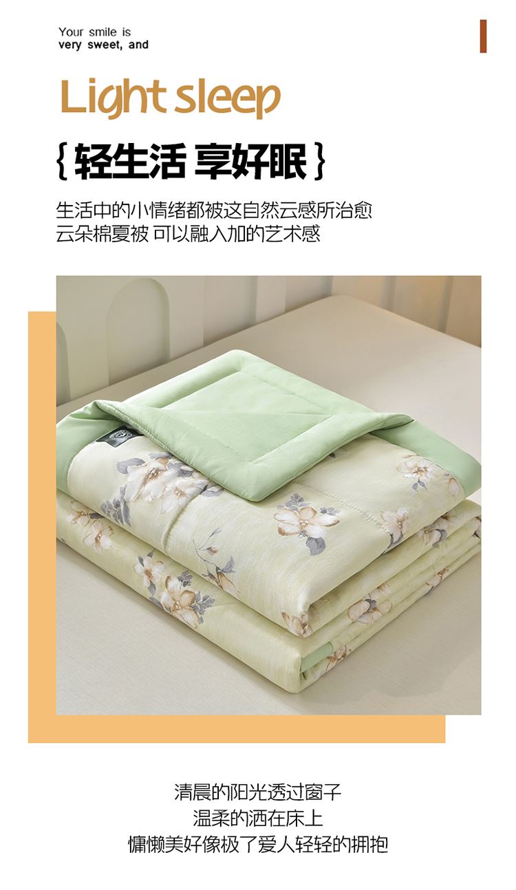 1:生活中的小情绪,{轻生活享好眠} 2:柔软云朵棉懂你想要的舒适 云朵棉面料舒适柔软细腻触感软糯呵护肌肤令人心动的触感 3:AB双版设计感刻画柔软的起居浪漫 一见钟情的设计让人陷入心动氛围充盈着浪漫和舒适的体验感 尺寸:200x230cm单夏被 重量:1.3kg(净重) 包装:彩盒