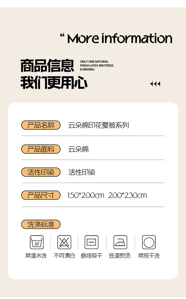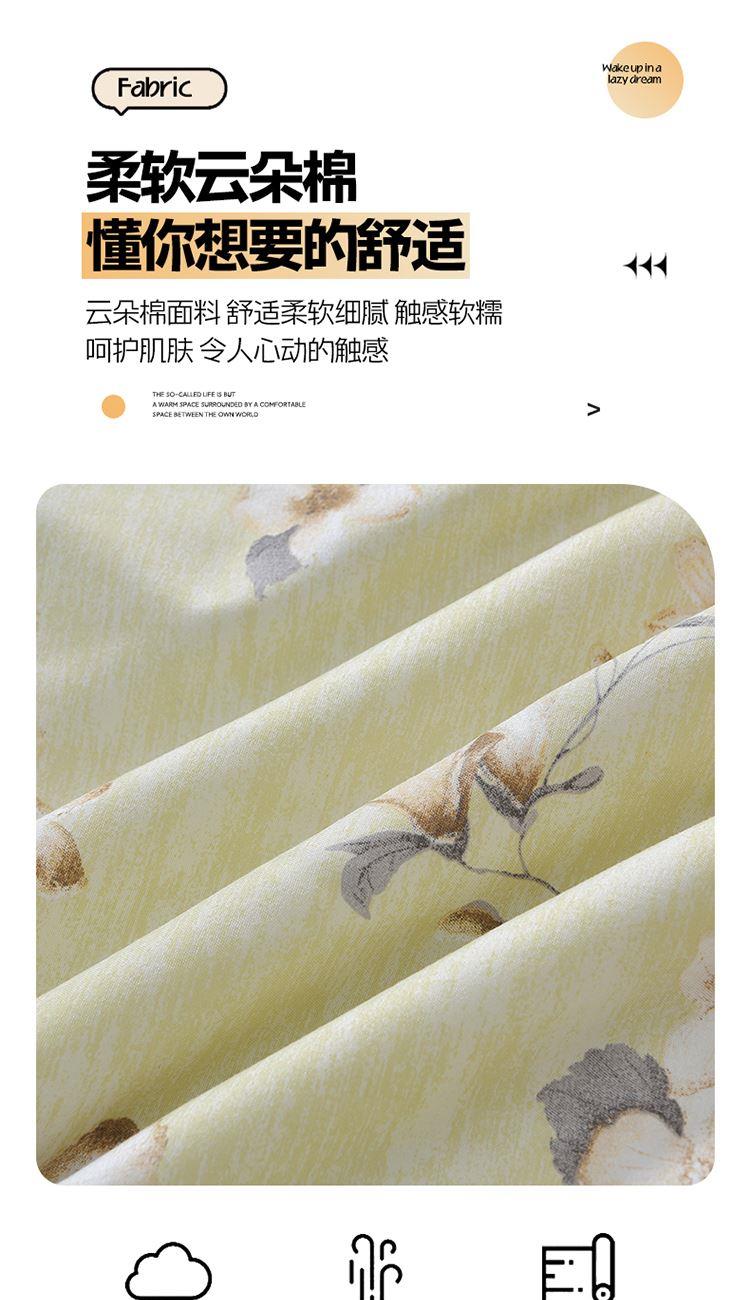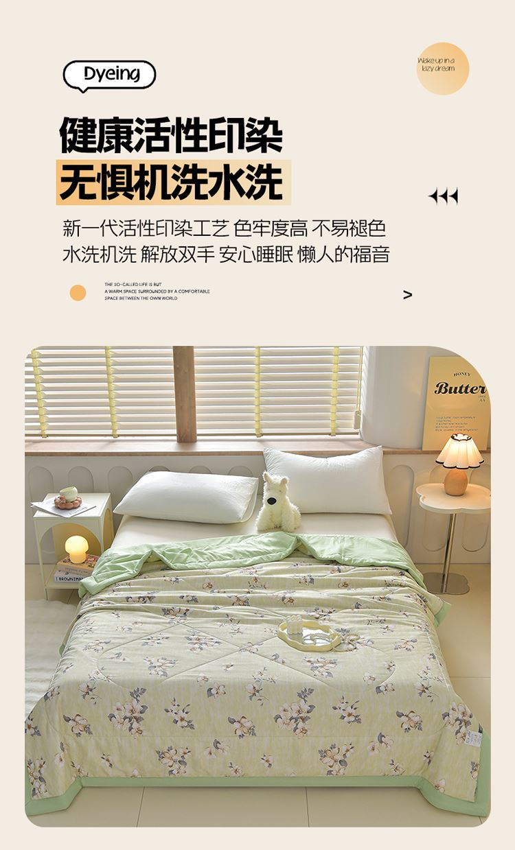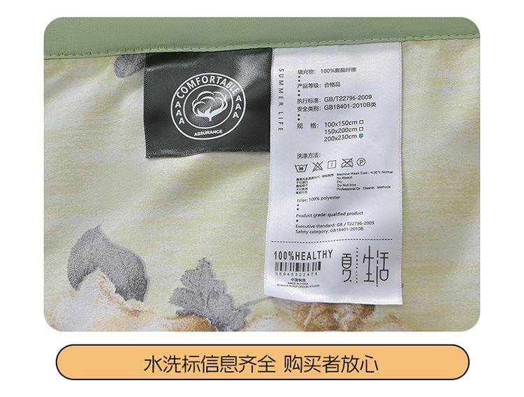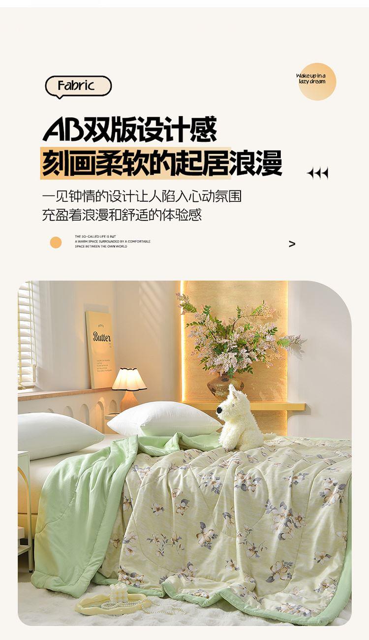 1:生活中的小情绪,{轻生活享好眠} 2:柔软云朵棉懂你想要的舒适 云朵棉面料舒适柔软细腻触感软糯呵护肌肤令人心动的触感 3:AB双版设计感刻画柔软的起居浪漫 一见钟情的设计让人陷入心动氛围充盈着浪漫和舒适的体验感 尺寸:200x230cm单夏被 重量:1.3kg(净重) 包装:彩盒