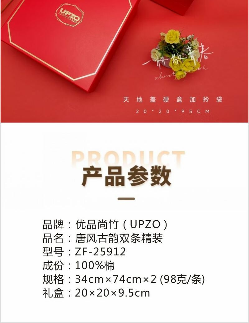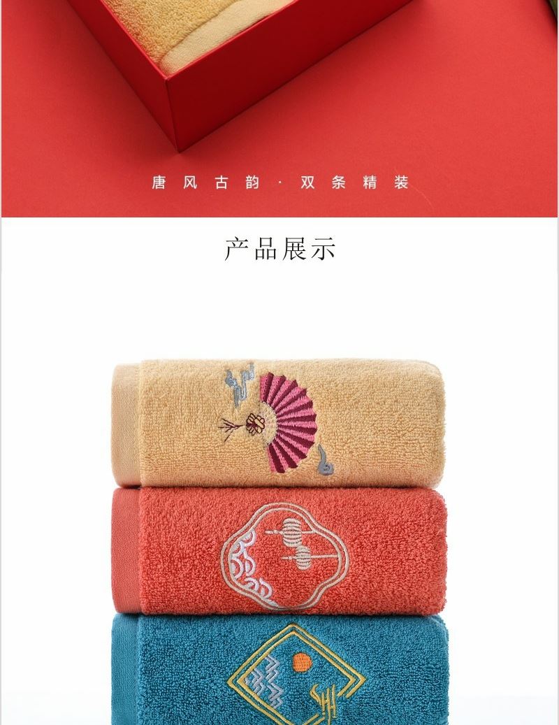 型号: ZF-25912 成份: 精梳棉 类别: GB18401-2010 B类 规格: 34cm×74cm×2 克重: 98克每条 外盒:20×20×9.5cm 精选精梳棉材质 结合国风刺绣主题融入 品质好礼