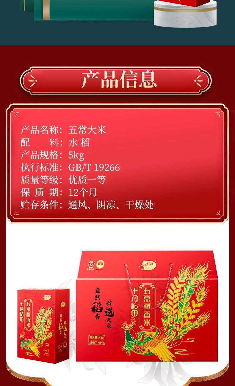 产品信息: 产品:五常大米 配料:水 稻 产品规格:5kg 执行标准:GB/T 19266 质量等级:优质一等 保质期:12个月 贮存条件:通风、阴凉、干燥处