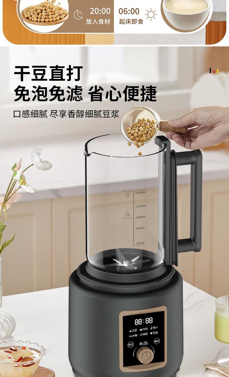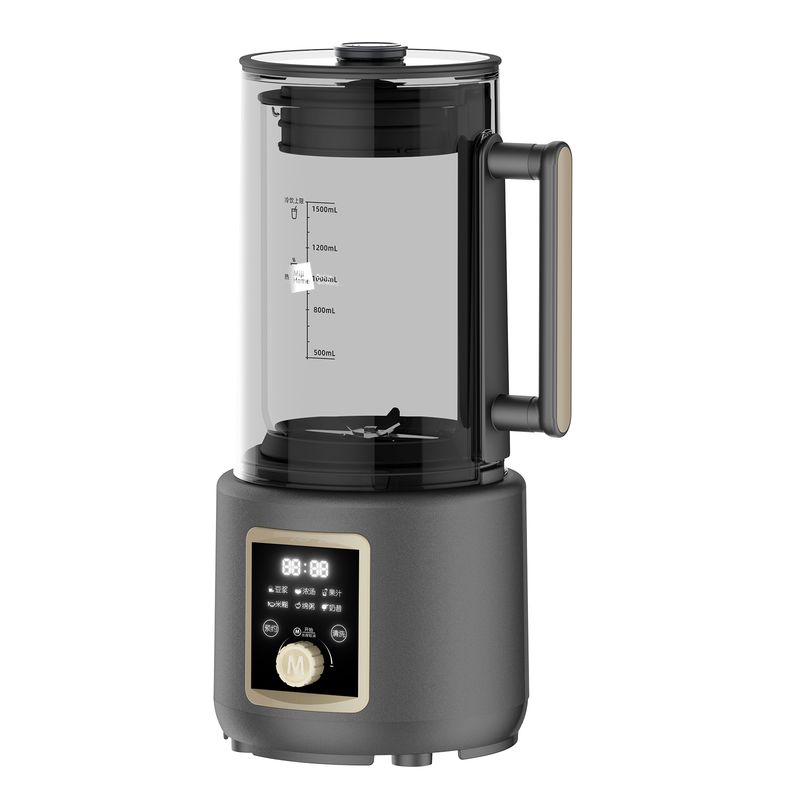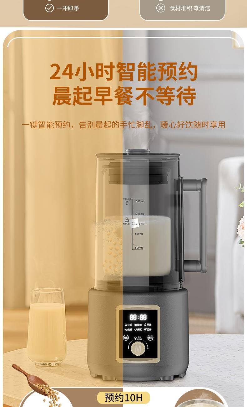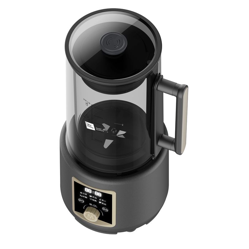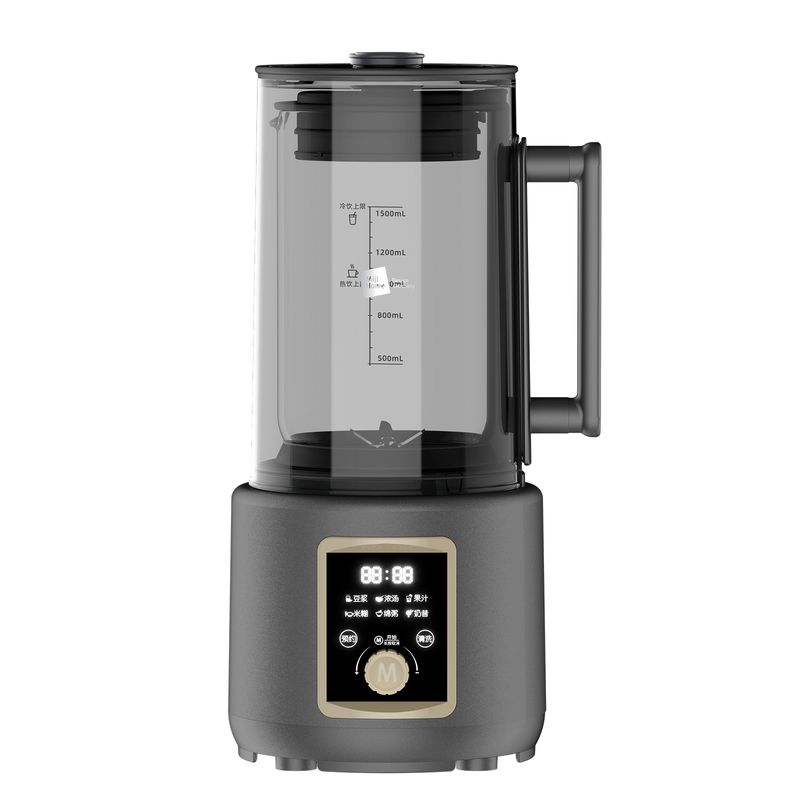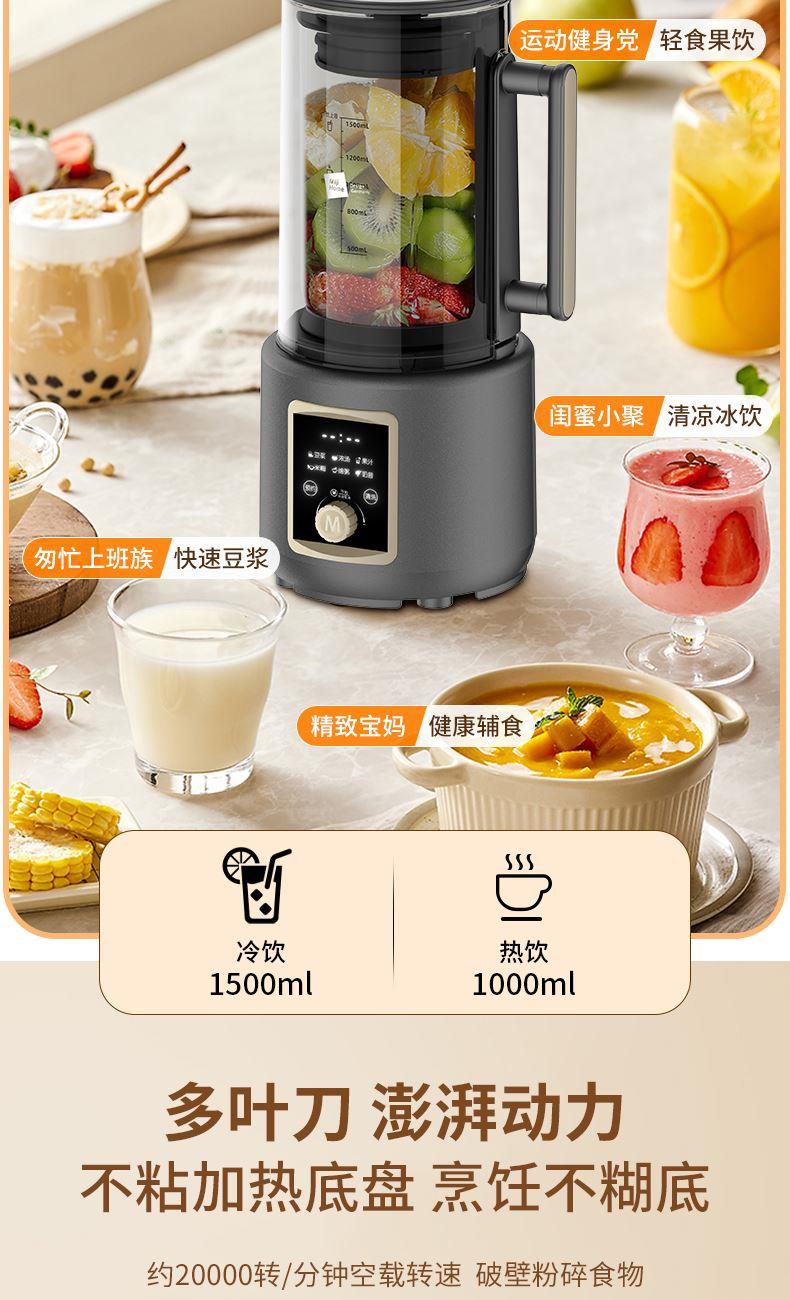 米技生活柔音破壁机,隔音罩设计,配合多重隔音设计,轻音柔和不喧哗。 深灰色柱形外观,大气时尚美观。 嵌入式杯体结合下沉式底座,减少噪音经空气传播的途径,降低机体震动。 1.5L精致容量(冷饮:1.5L,热饮:1.0L),营养料理全家分享。 冷热双享,365天时时刻刻为您提供营养健康饮食。 智能海拔识别系统,不论是平原或是高原,烹饪环境稳定如一。 智能数码显示屏,微电脑控制,结合飞梭旋控,轻松切换不同使用功能。 内置多种智能程序,可以制作豆浆、浓汤、果汁、米糊、绵粥、奶昔等, 支持24小时预约与1小时保温(热饮),使用完毕,加入清水,一键清洗,自动搞定。 大功率高转速长寿命电机,运行持久稳定,约20000转/分钟强劲动力。 304不锈钢多叶破壁精钢锯齿刀,坚固耐磨,强劲有力,破壁,快速粉碎。 加厚高硼硅耐热玻璃搅拌杯,安全防爆裂、卫生易清洗。 不粘加热盘配合高精度温控探头,烹饪不糊底,清洗更轻松。 搅拌杯与底座可快速分离,装备拆卸更加方便快捷。 设有提盖保护(杯盖打开即停止工作),提杯保护(杯体离开底座即停止工作),过热保护等安全设计,确保使用安全。