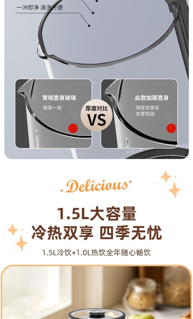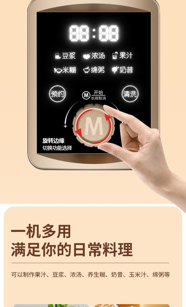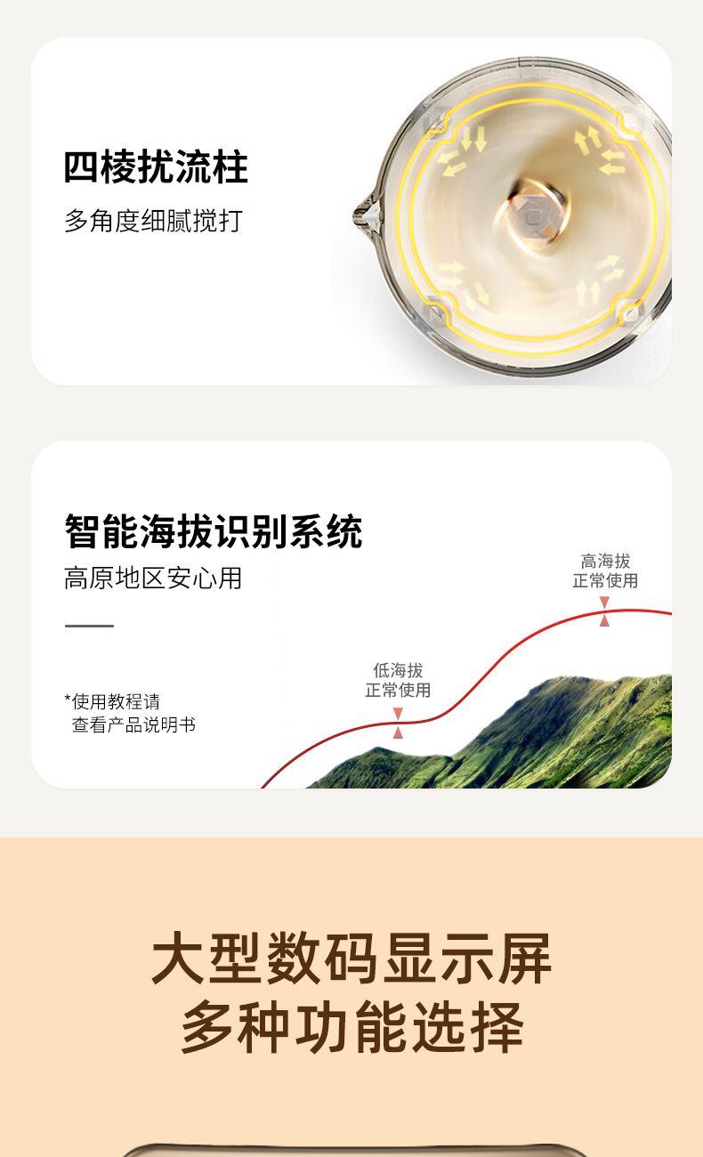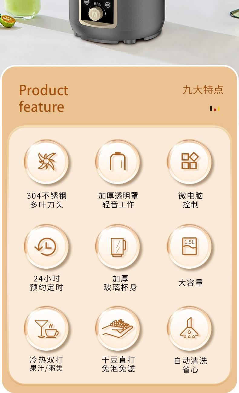 米技生活柔音破壁机,隔音罩设计,配合多重隔音设计,轻音柔和不喧哗。 深灰色柱形外观,大气时尚美观。 嵌入式杯体结合下沉式底座,减少噪音经空气传播的途径,降低机体震动。 1.5L精致容量(冷饮:1.5L,热饮:1.0L),营养料理全家分享。 冷热双享,365天时时刻刻为您提供营养健康饮食。 智能海拔识别系统,不论是平原或是高原,烹饪环境稳定如一。 智能数码显示屏,微电脑控制,结合飞梭旋控,轻松切换不同使用功能。 内置多种智能程序,可以制作豆浆、浓汤、果汁、米糊、绵粥、奶昔等, 支持24小时预约与1小时保温(热饮),使用完毕,加入清水,一键清洗,自动搞定。 大功率高转速长寿命电机,运行持久稳定,约20000转/分钟强劲动力。 304不锈钢多叶破壁精钢锯齿刀,坚固耐磨,强劲有力,破壁,快速粉碎。 加厚高硼硅耐热玻璃搅拌杯,安全防爆裂、卫生易清洗。 不粘加热盘配合高精度温控探头,烹饪不糊底,清洗更轻松。 搅拌杯与底座可快速分离,装备拆卸更加方便快捷。 设有提盖保护(杯盖打开即停止工作),提杯保护(杯体离开底座即停止工作),过热保护等安全设计,确保使用安全。