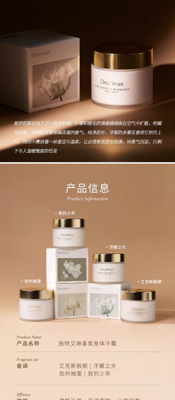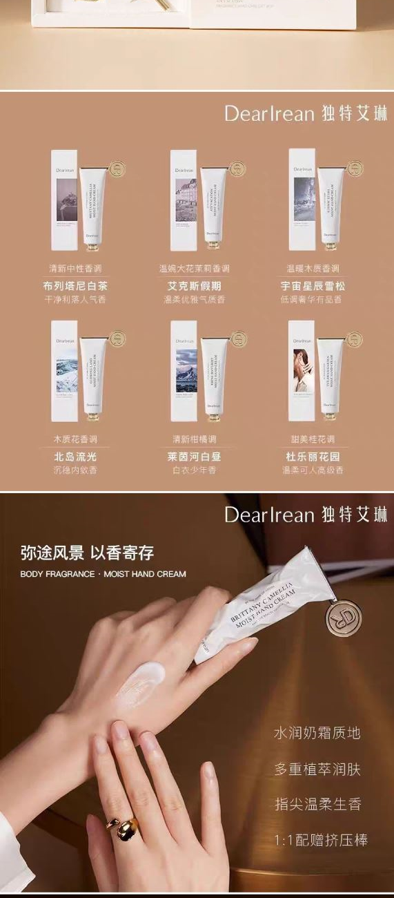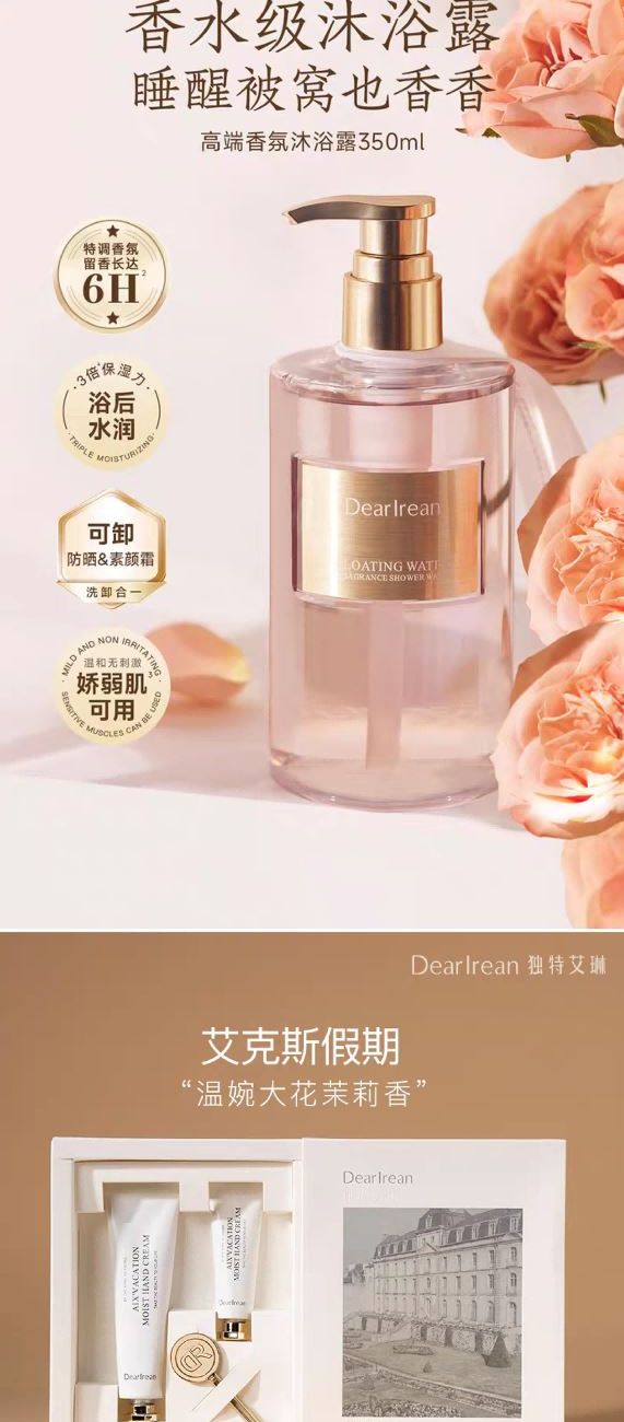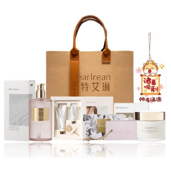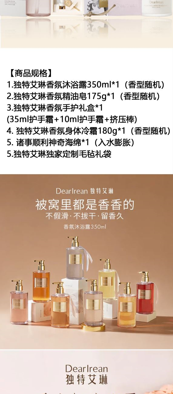 【适用范围】 -教师节礼品、年会礼品、企业员工福利、银行保险、 积分兑换、随手礼、节日庆典 【商品规格】 1.独特艾琳香氛沐浴露350ml*1(香型随机) 2.独特艾琳香氛精油皂175g*1(香型随机) 3.独特艾琳香氛手护礼盒*1 (35ml护手霜+10ml护手霜+挤压棒) 4. 独特艾琳香氛身体冷霜180g*1(香型随机) 5. 诸事顺利神奇海绵*1(入水膨胀) 5.独特艾琳定制毛毡礼袋